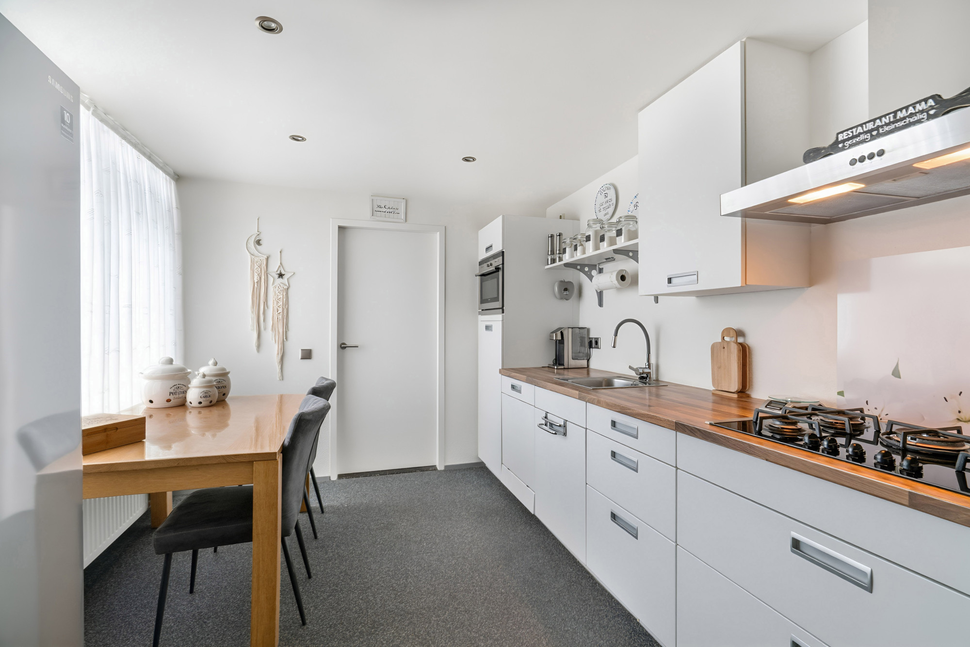 De gesloten keuken is praktisch ingericht en voorzien van een spoelbak, vaatwasser, 5-pits gasfornuis, afzuigkap, boven- en onderkastjes, koelkast en combi-magnetron. Vanuit de keuken loop je door naar de bijkeuken, waar zich de CV-ketel en wasmachineaansluiting bevinden. Ook vanuit de bijkeuken is de tuin toegankelijk.