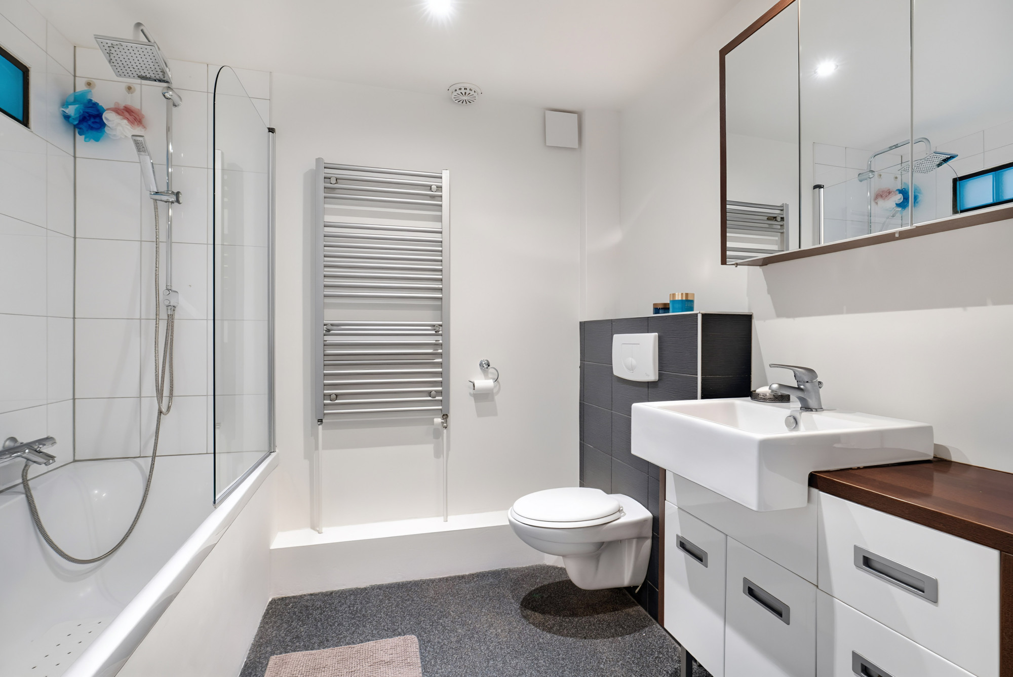 De badkamer is uitgerust met een grindvloer, een ligbad met douche en glazen wand, zwevend toilet, wastafel met meubel en een designradiator. Een fijne plek om heerlijk te ontspannen!