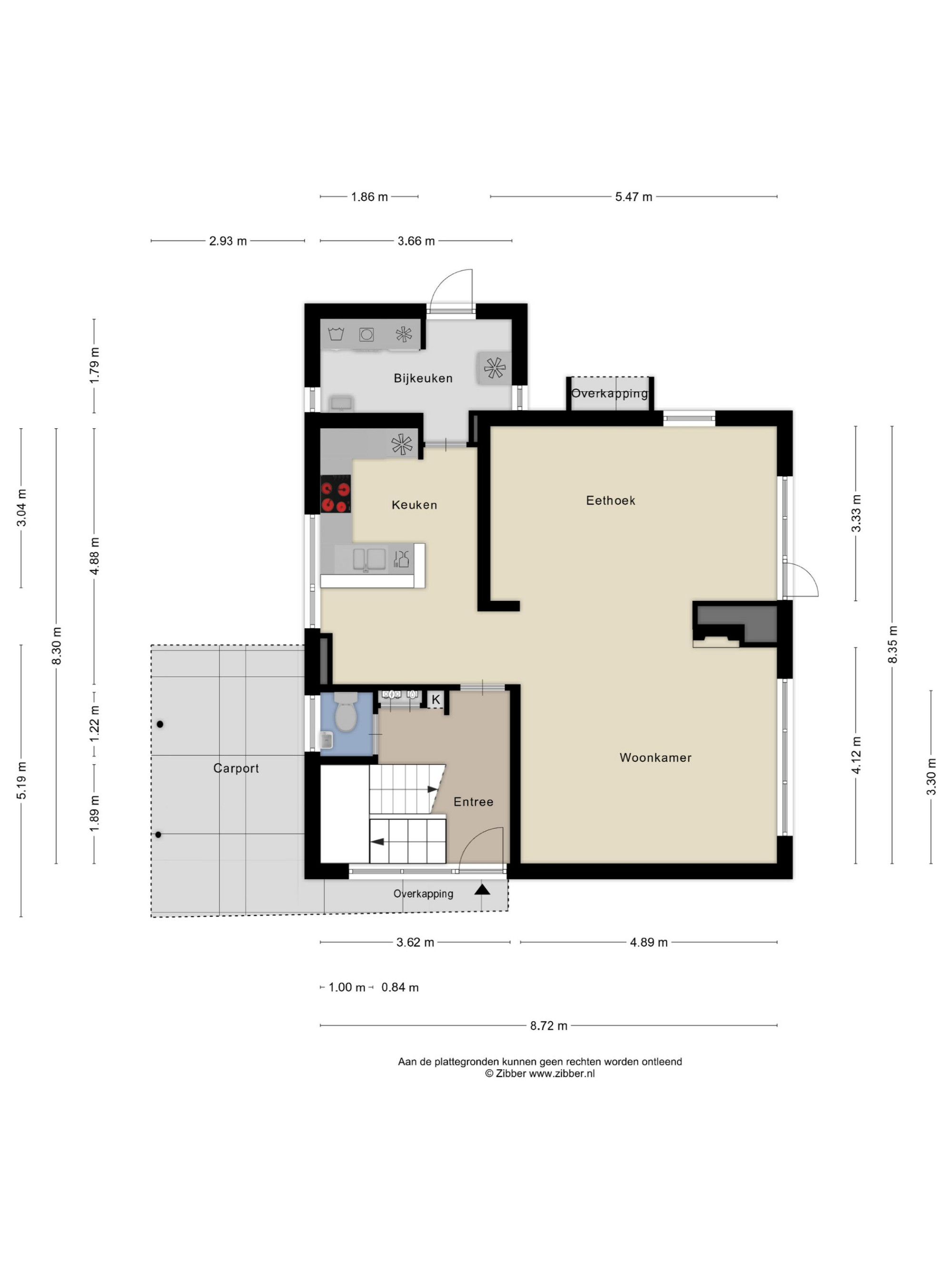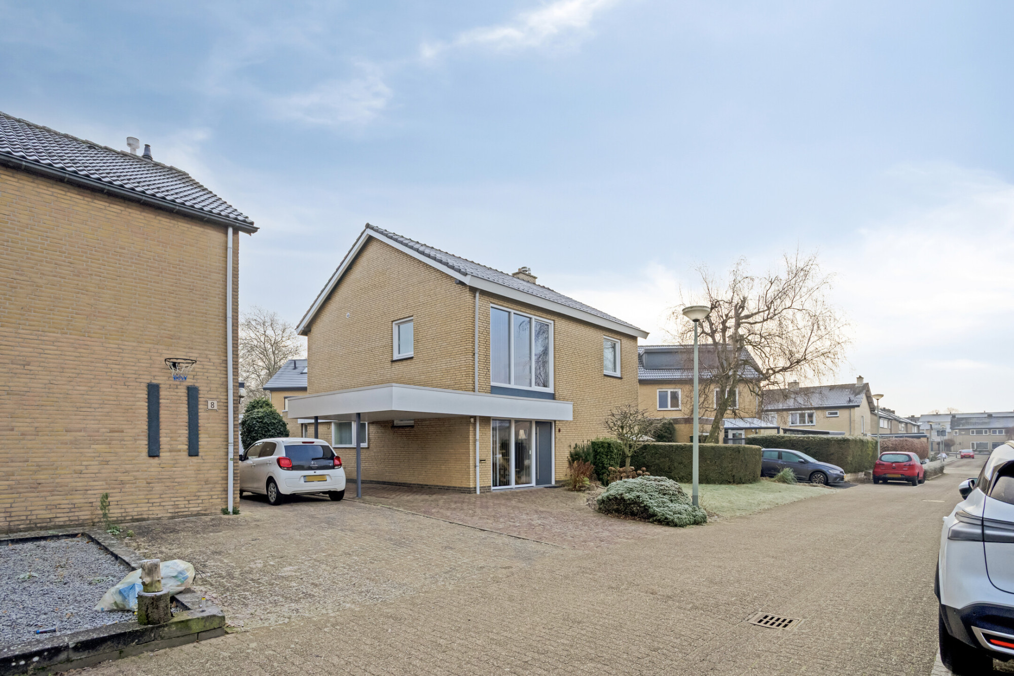 De voorliggende oprit met carport biedt parkeergelegenheid aan meerdere voertuigen op eigen terrein.
