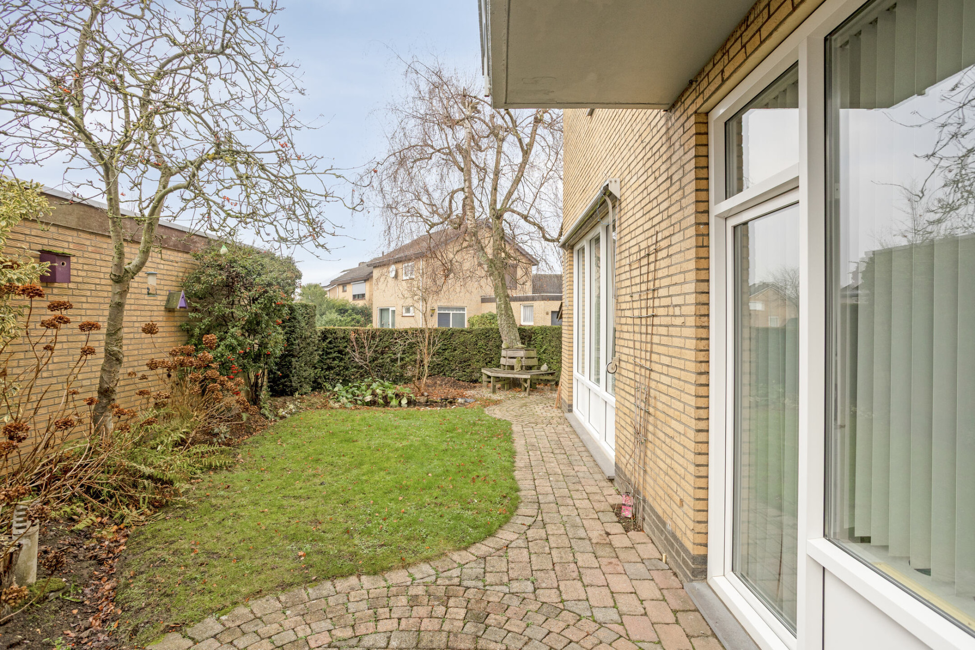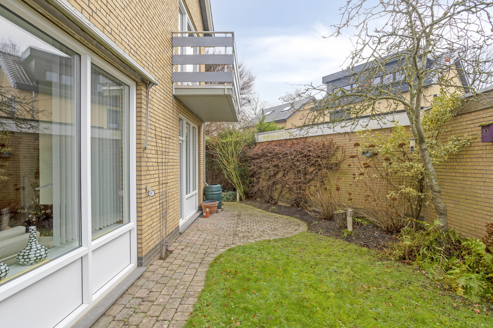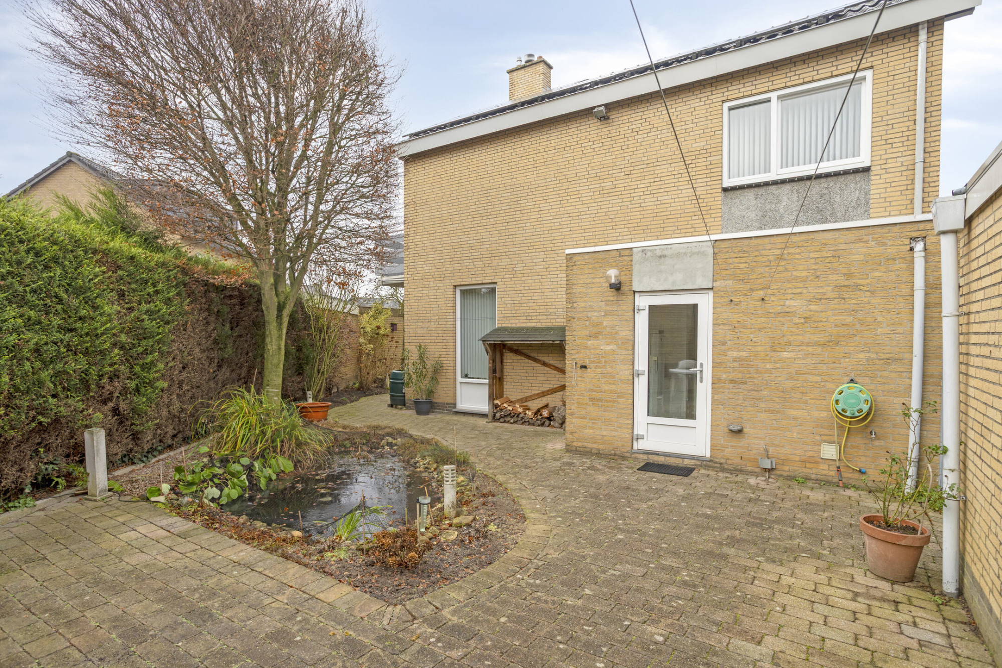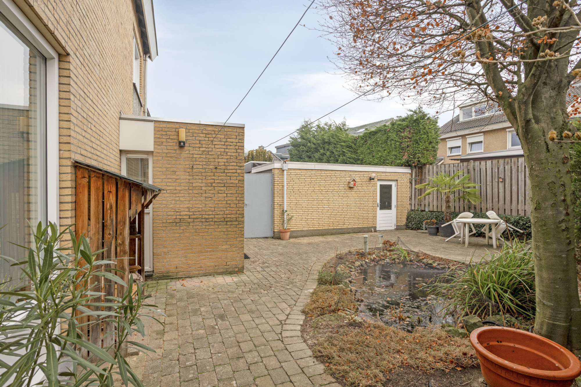 Rondom de woning ligt een verzorgde tuin met meerdere terrassen, sfeervolle zithoekjes, een vijverpartij, gazon, borders met beplanting en een praktische zijingang – een heerlijke plek om in alle rust te genieten.