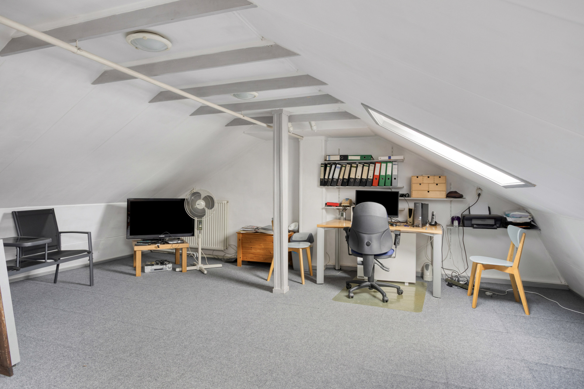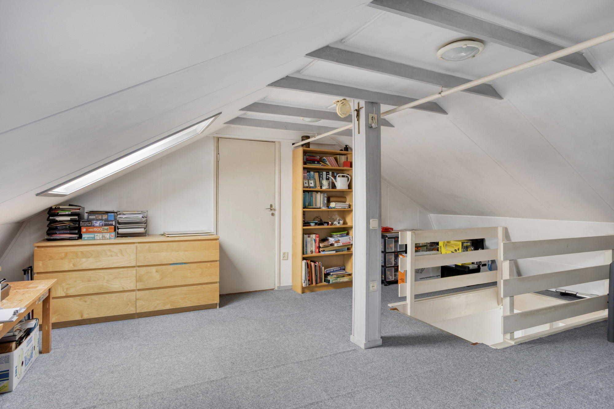 Vaste trap naar de zeer ruime zolderkamer met 2 grote dakraam, welke ideaal is als thuiswerkplek, maar ook als royale vijfde slaapkamer kan dienen.