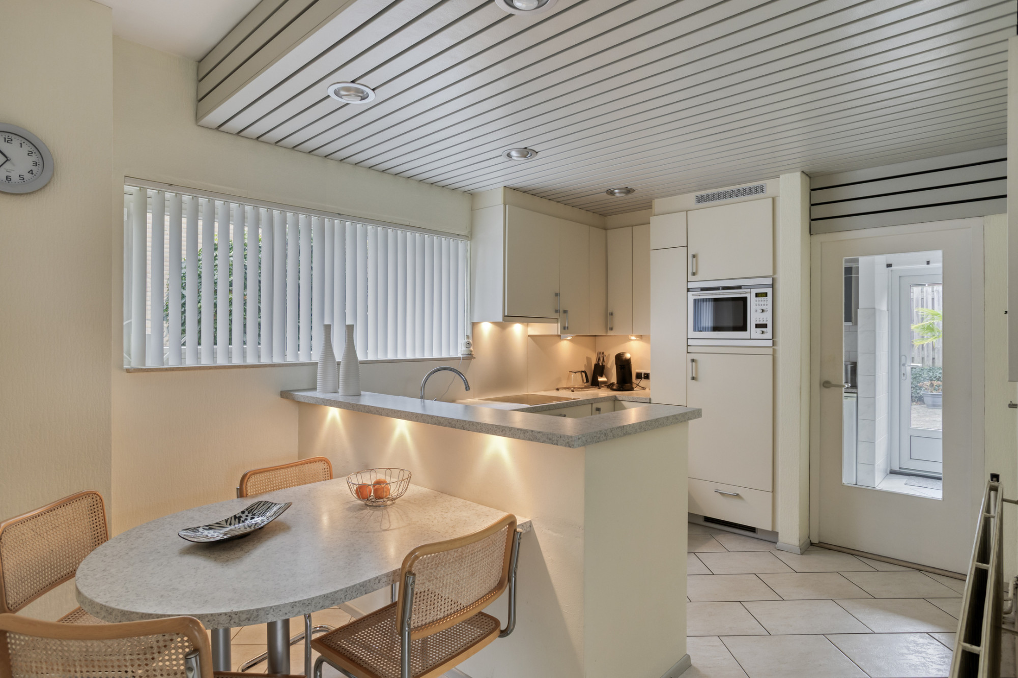 De halfopen keuken is praktisch en gezellig ingedeeld met een eethoek en een eigentijdse inbouwkeuken in U-opstelling, uitgevoerd in crème-wit met RVS-grepen en voorzien van diverse inbouwapparatuur. Aansluitend bevindt zich de bijkeuken met witgoedaansluitingen, uitstortgootsteen en een doorgang naar het achtergelegen terras.