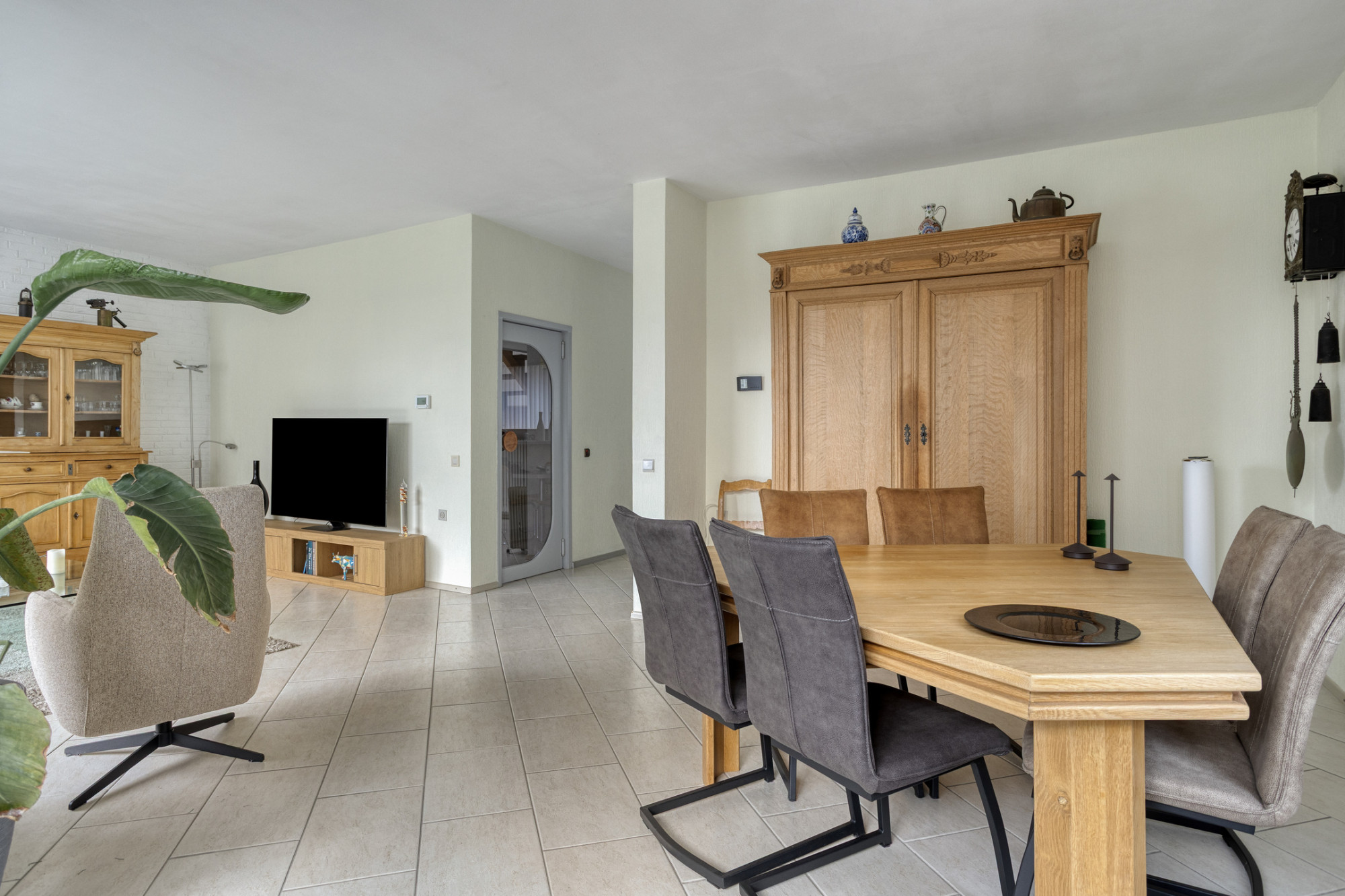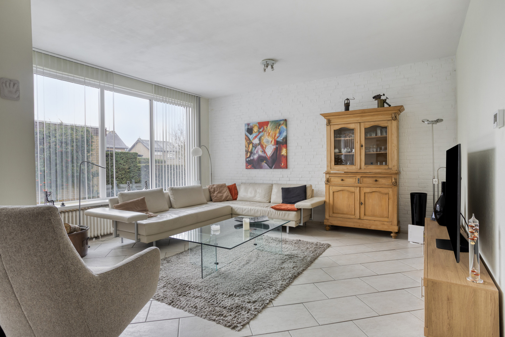 Lichte woonkamer met plavuizenvloer en aan de voorzijde gelegen living/lounge voorzien van audio-/visuele-aansluitingen.