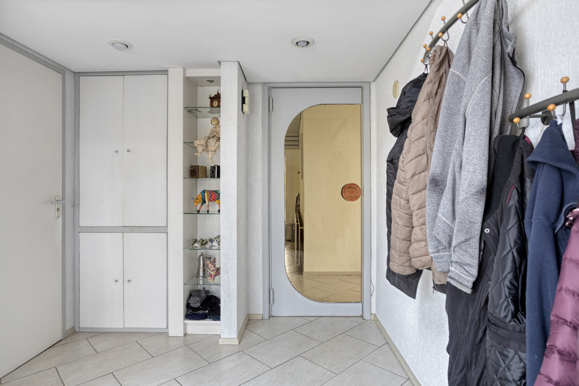 Royale hal/entree, bordestrap naar de verdieping en muurkast met bergruimte. Meterkast voorzien van ruime groepsinstallatie / aardlekschakelaars / separate groep voor de zonnepanelen / digitale meters met dag- en nachtstroomaansluiting. Geheel betegeld gastentoilet met staand closet en fonteintje. Toegang tot de woonkamer, eetkamer en keuken.