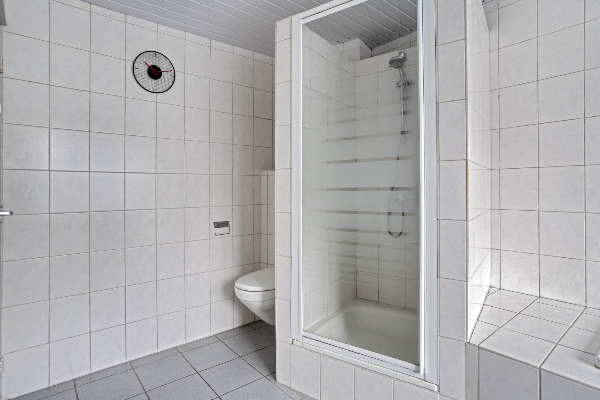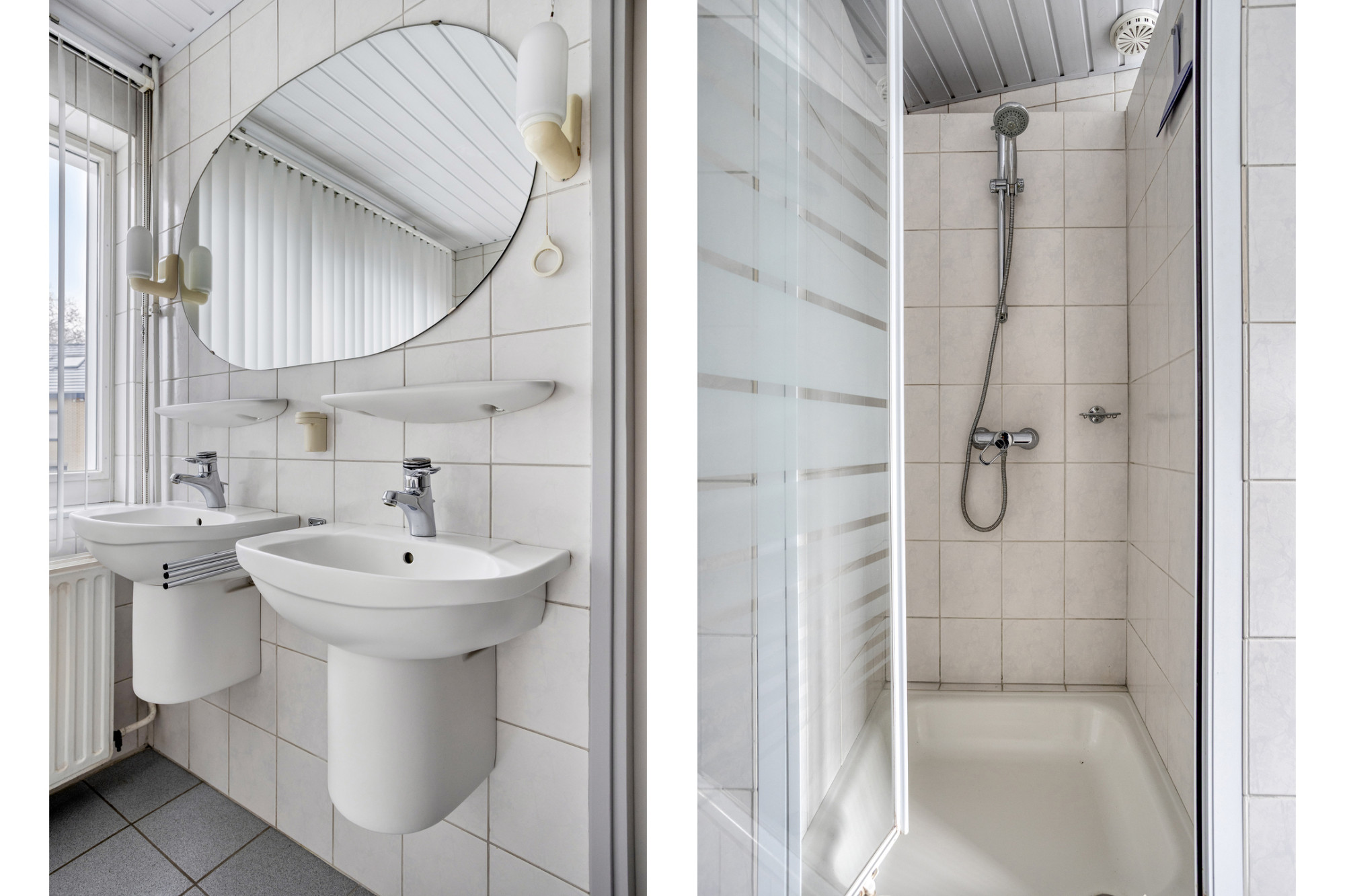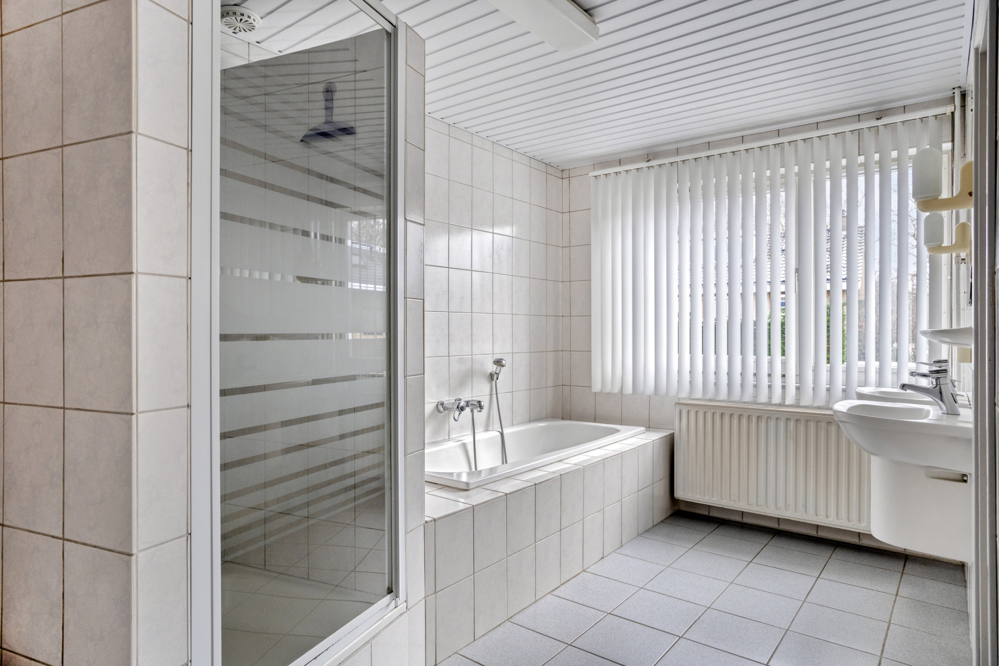 De geheel betegelde, ruime, badkamer is voorzien van een douche / ligbad / dubbele wastafel en tweede toilet.