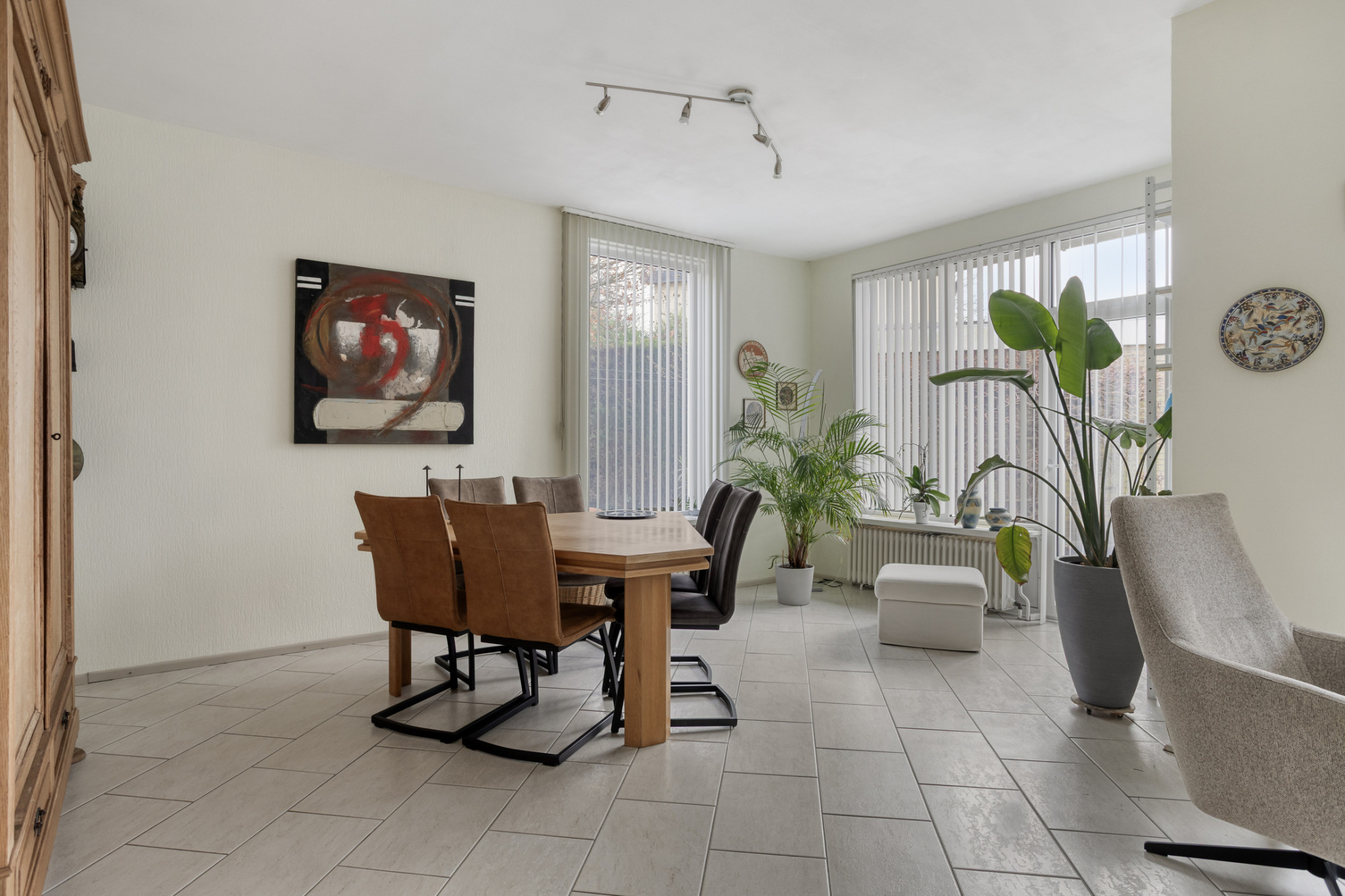 Aan de achterzijde is de eetkamer gesitueerd, waar grote raampartijen zorgen voor een prettige lichtinval en een loopdeur direct toegang biedt tot de tuin.