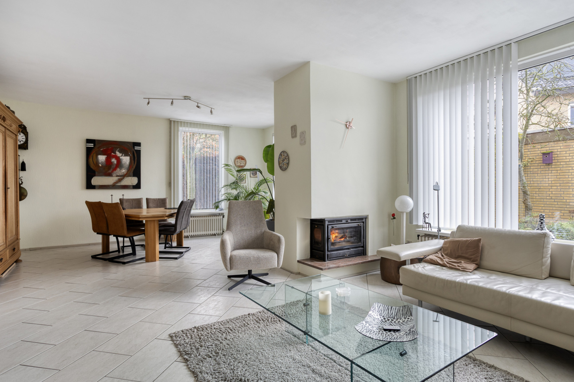 Centraal vormt de karaktervolle schouwpartij met houtkachel het warme hart van de woning.