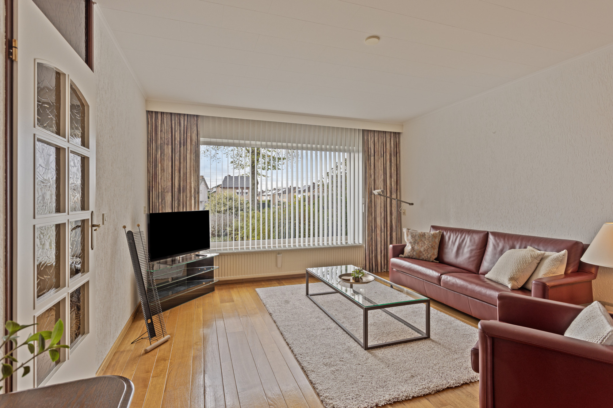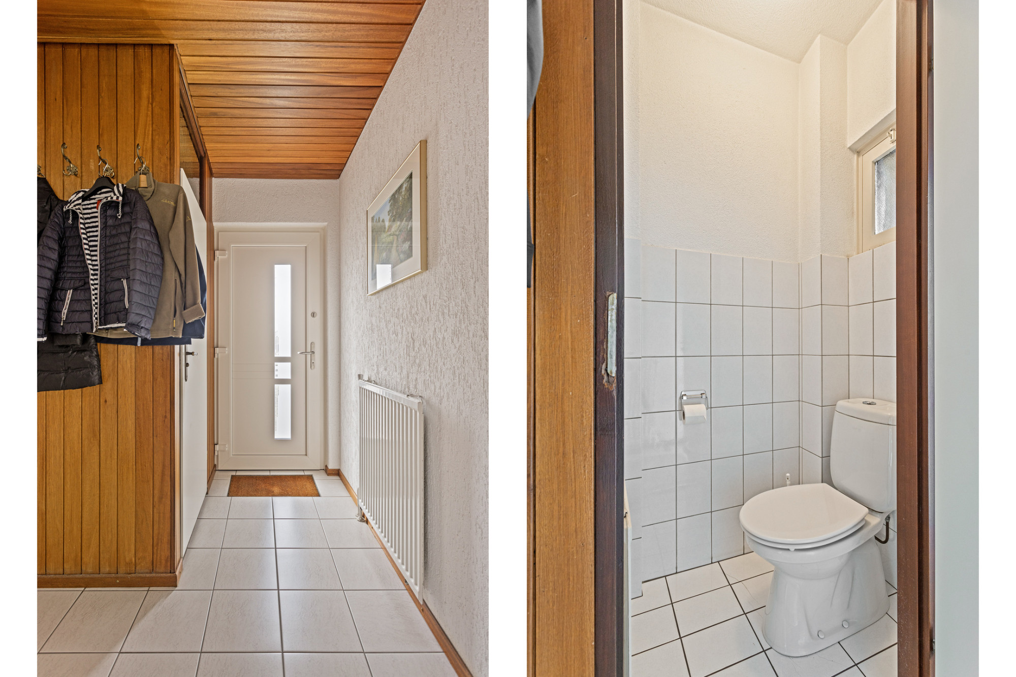 - Ontvangsthal met meterkast, trappenhuis en toegang tot de woonkamer.