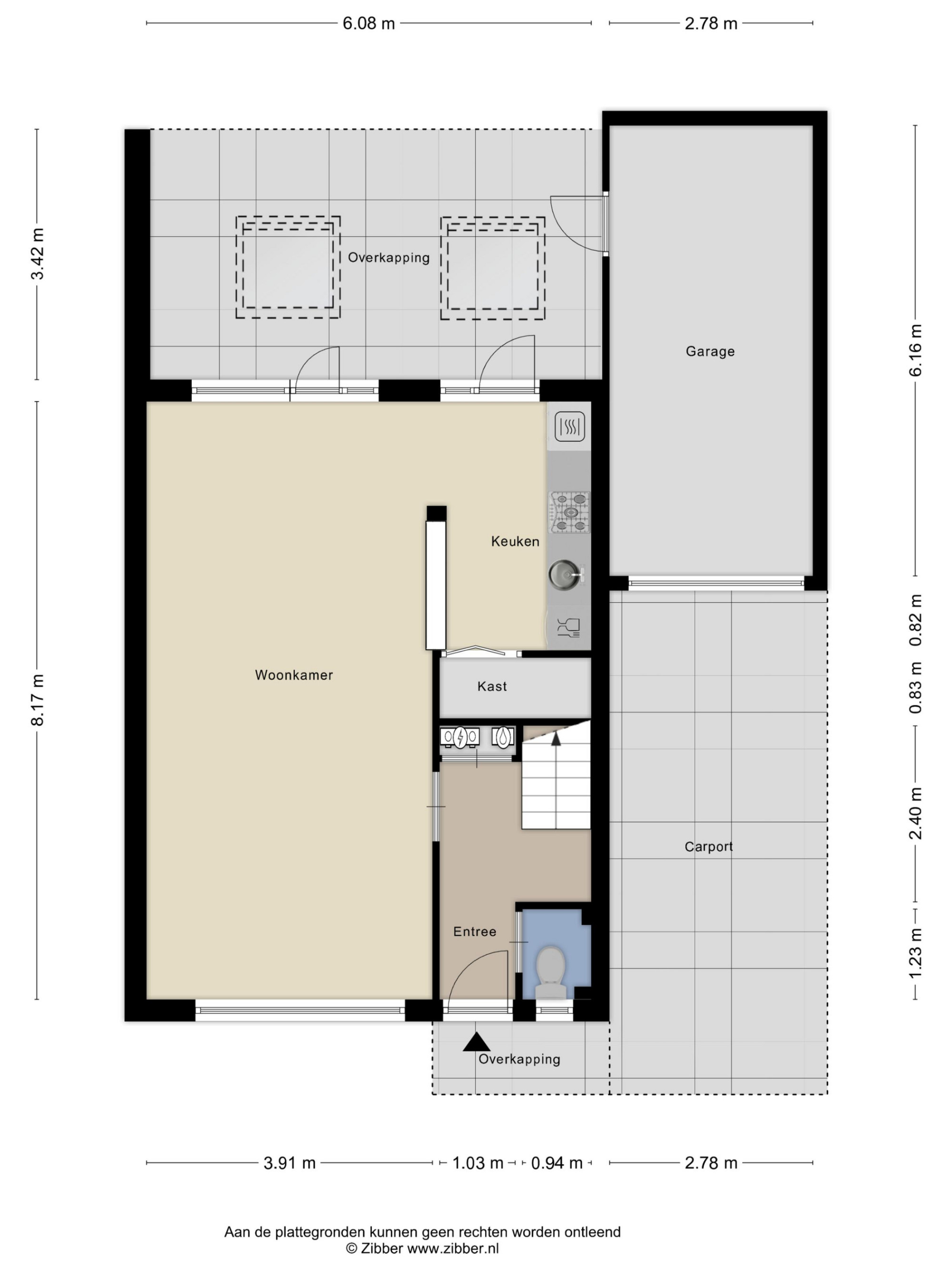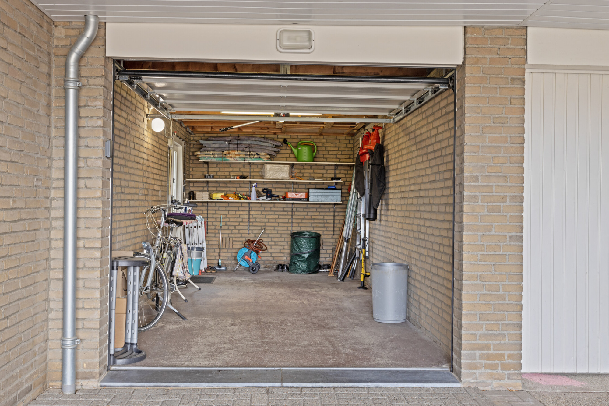 - Aangrenzend aan de carport ligt de garage van ca. 18 m² met elektra, sectionaalpoort en loopdeur naar de achtertuin.