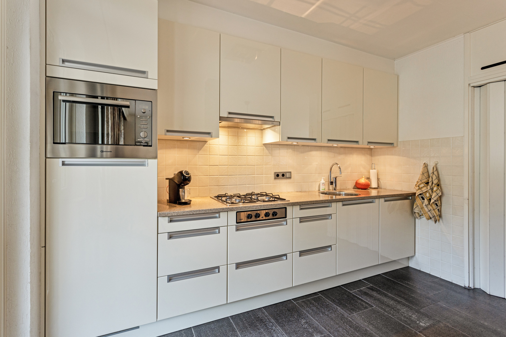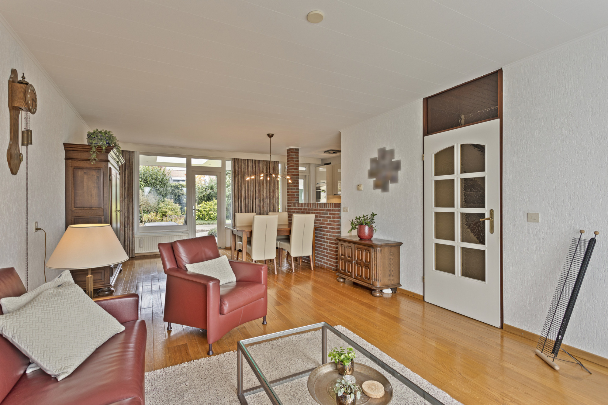 - Ruime woonkamer met open keuken (totaal ca. 40 m²) voorzien van een sfeervolle parketvloer, een moderne keukenopstelling met inbouwapparatuur, muurkast (met geiser) en openslaande deuren naar de terrasoverkapping en achtertuin.
