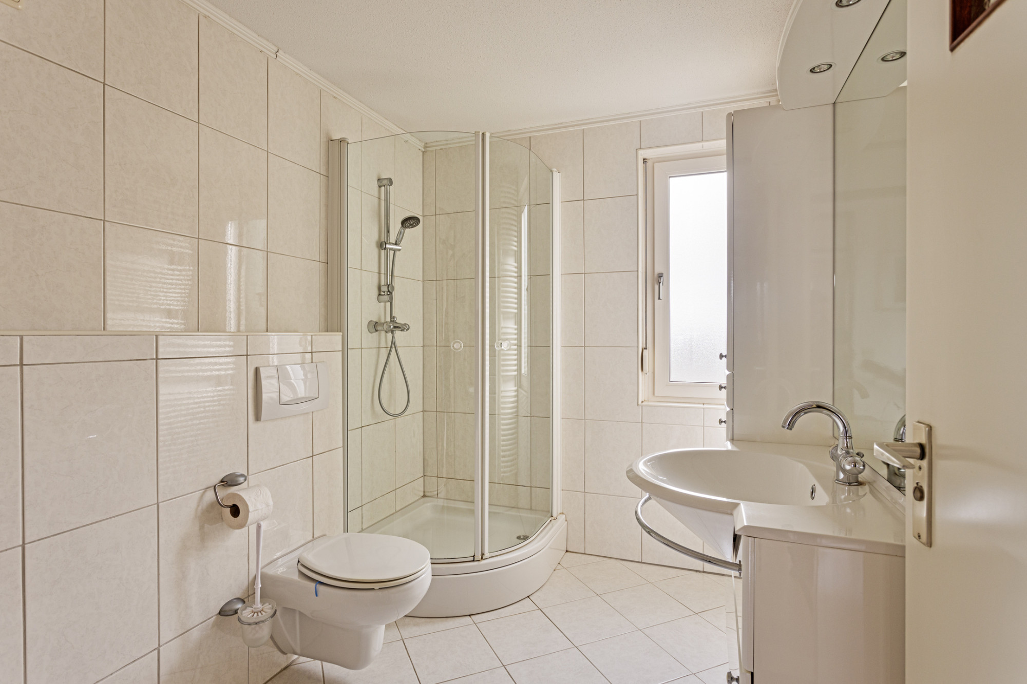 - Betegelde badkamer van ca. 6 m² met wasmachine aansluiting, douche, 2e toilet en wastafel.