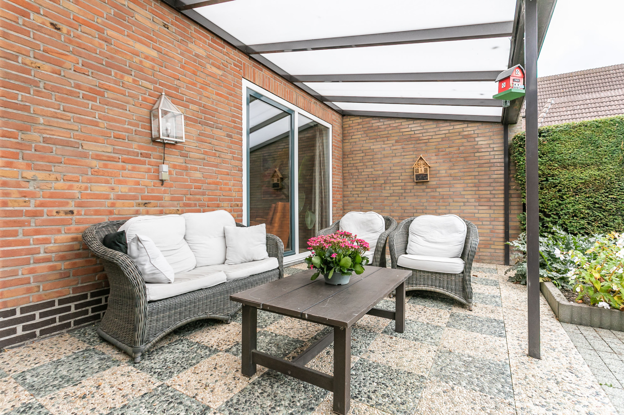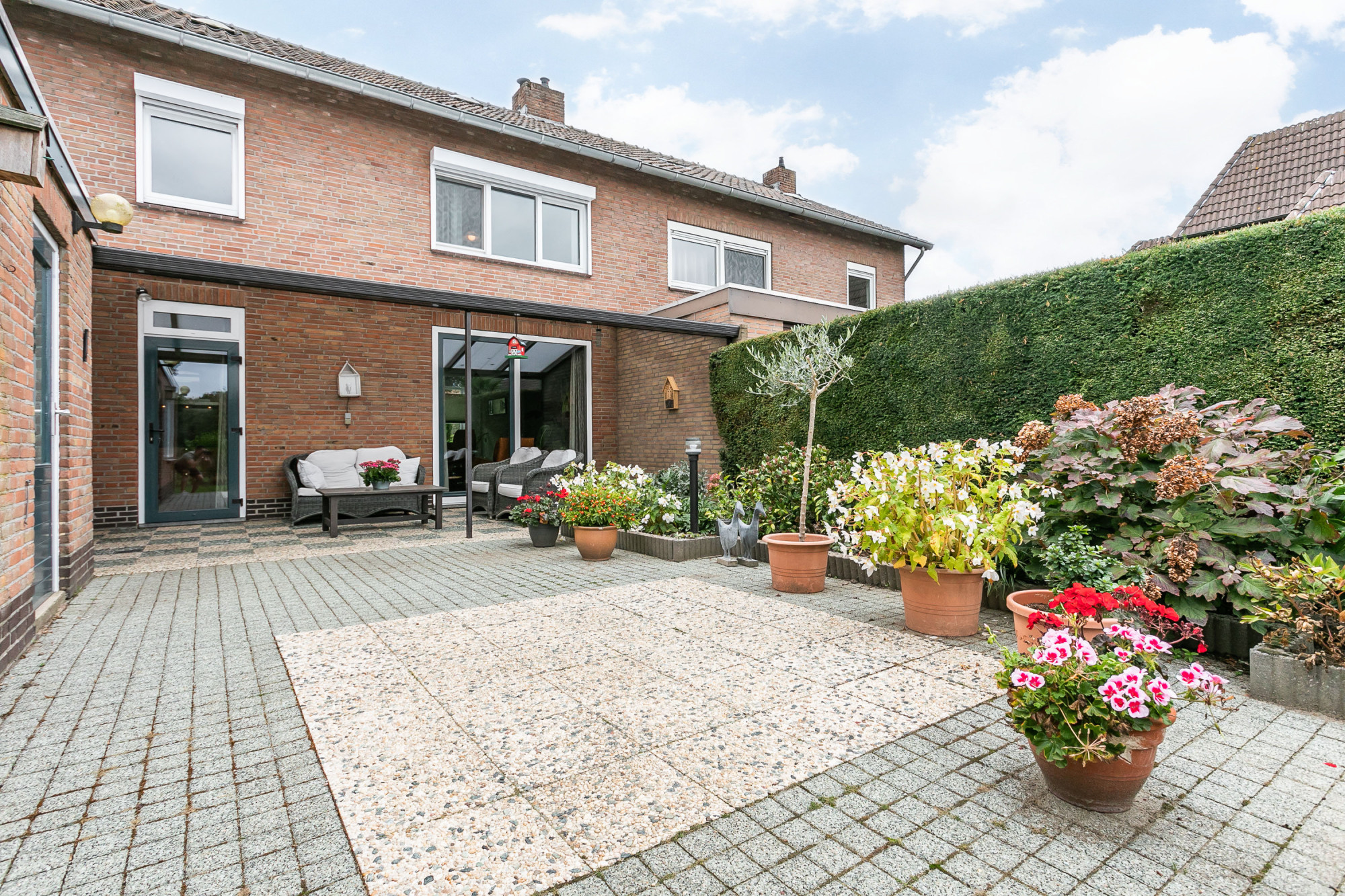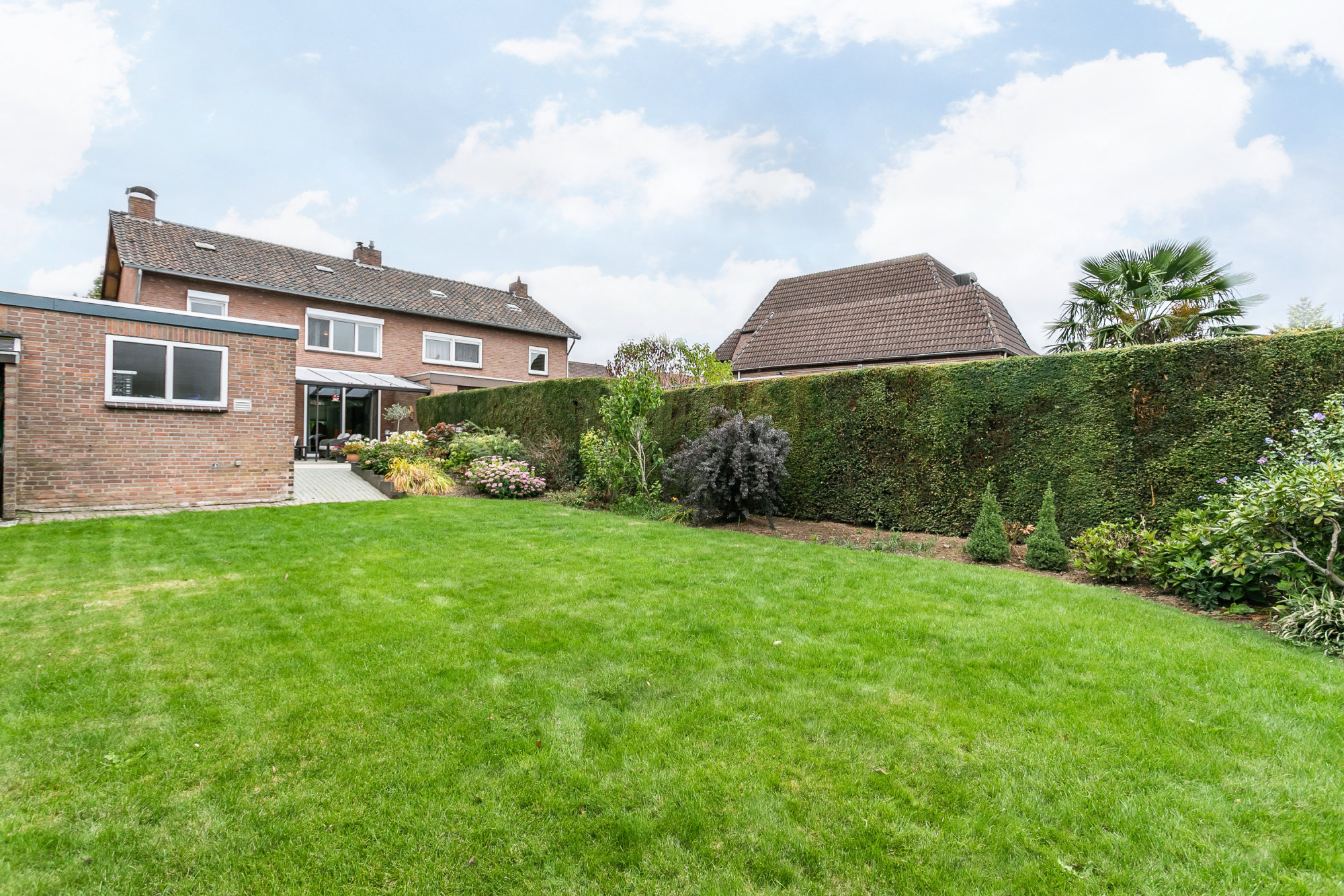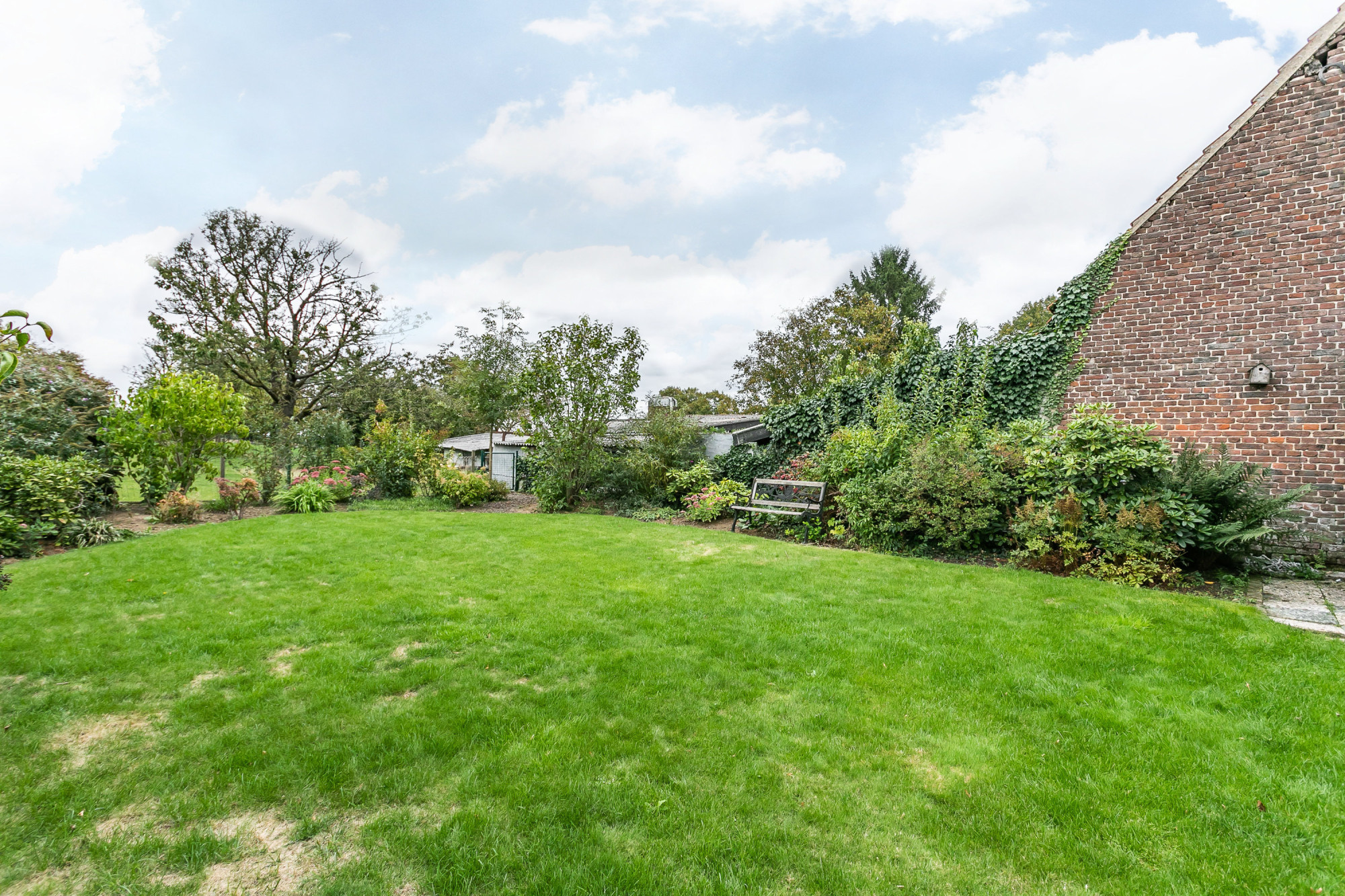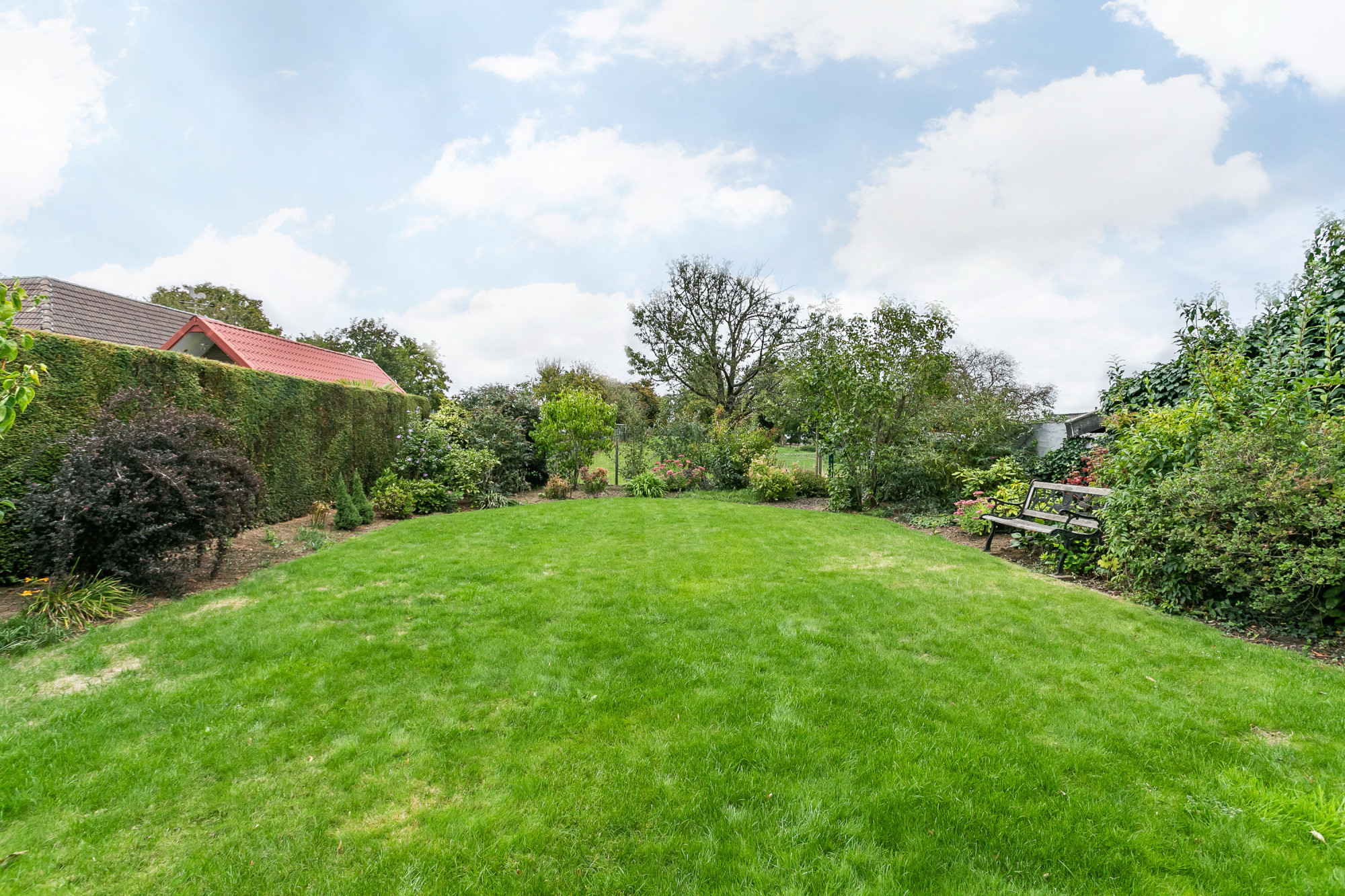 De diepe achtertuin vormt een waar buitenverblijf met een groot overdekt terras, een gazon, borders met aanplanting, een tuinberging en een zijingang. Het vrije uitzicht op de achtergelegen fruitboomgaard zorgt voor een gevoel van rust en ruimte — een heerlijke plek voor kinderen om te spelen of voor wie graag een moestuin aanlegt.