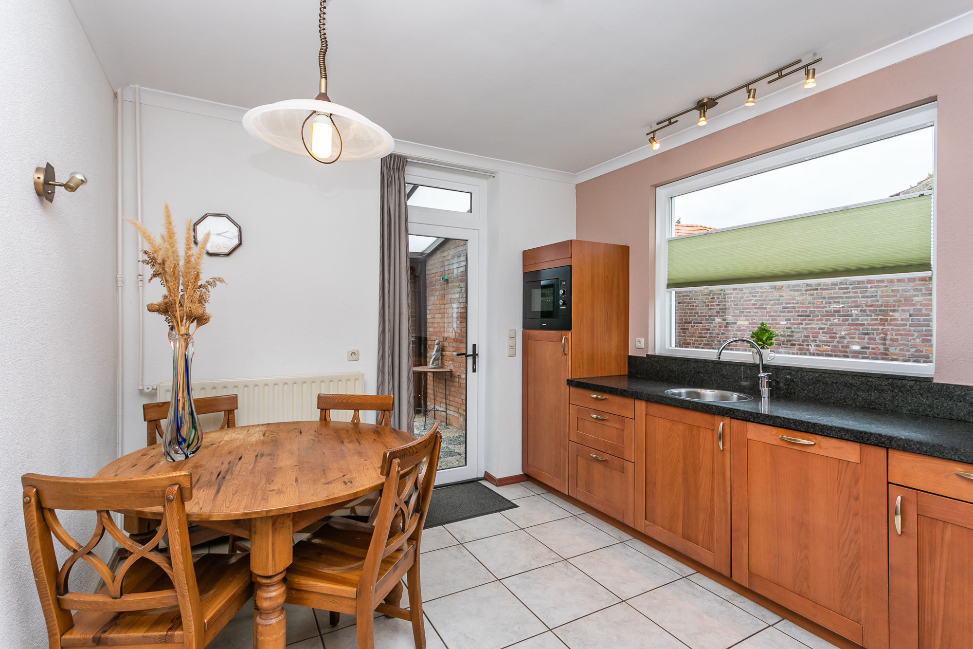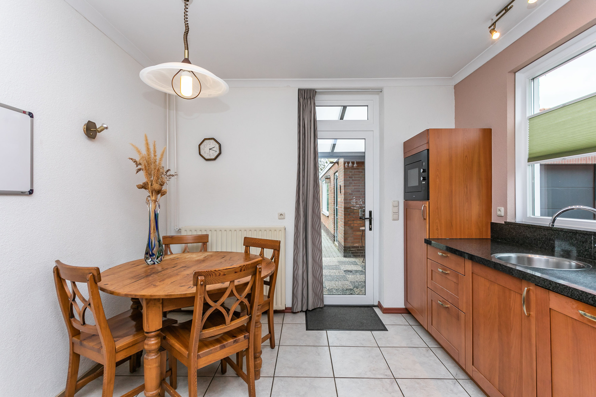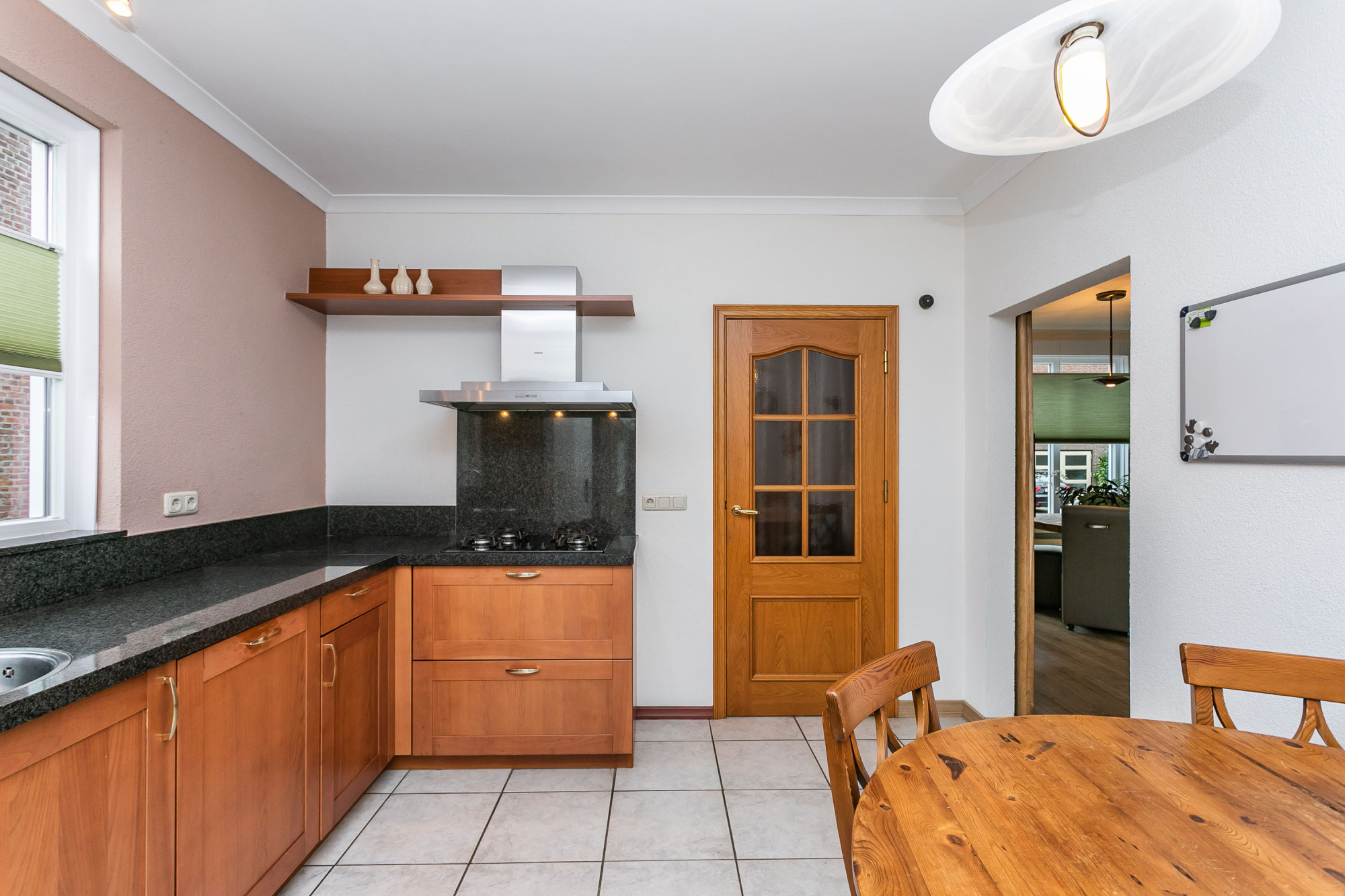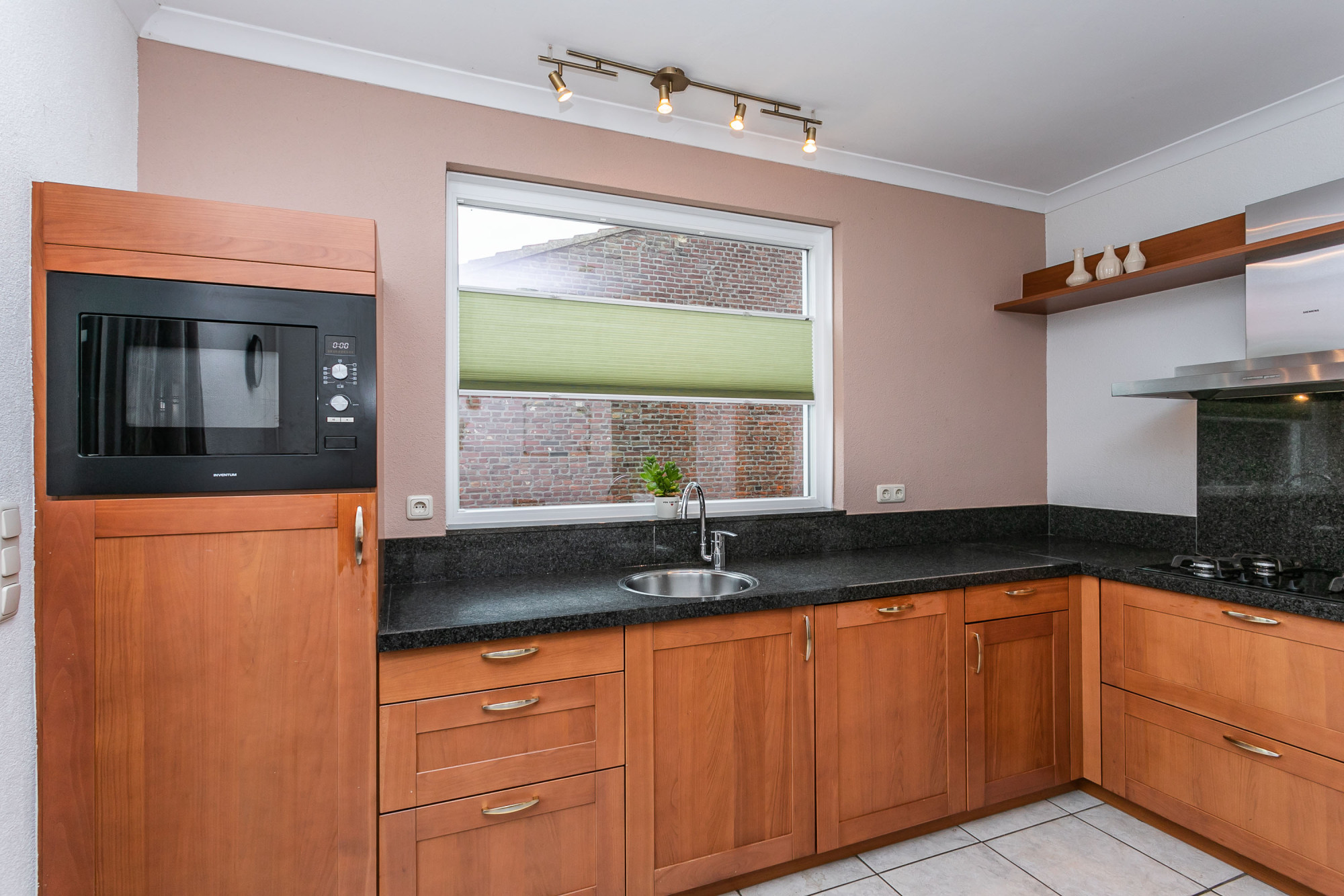 Een gesloten keukenruimte met een eigentijdse inbouwkeuken in hoekopstelling, voorzien van apparatuur, te weten: 4 pits gasfornuis / RVS wandschouw afzuigkap / combimagnetron / wasbak / vaatwasmachine / koelkast / granieten werkblad met daglicht en veel opbergruimte. Loftdeur naar de woonkamer en een loopdeur naar het achtergelegen terras.