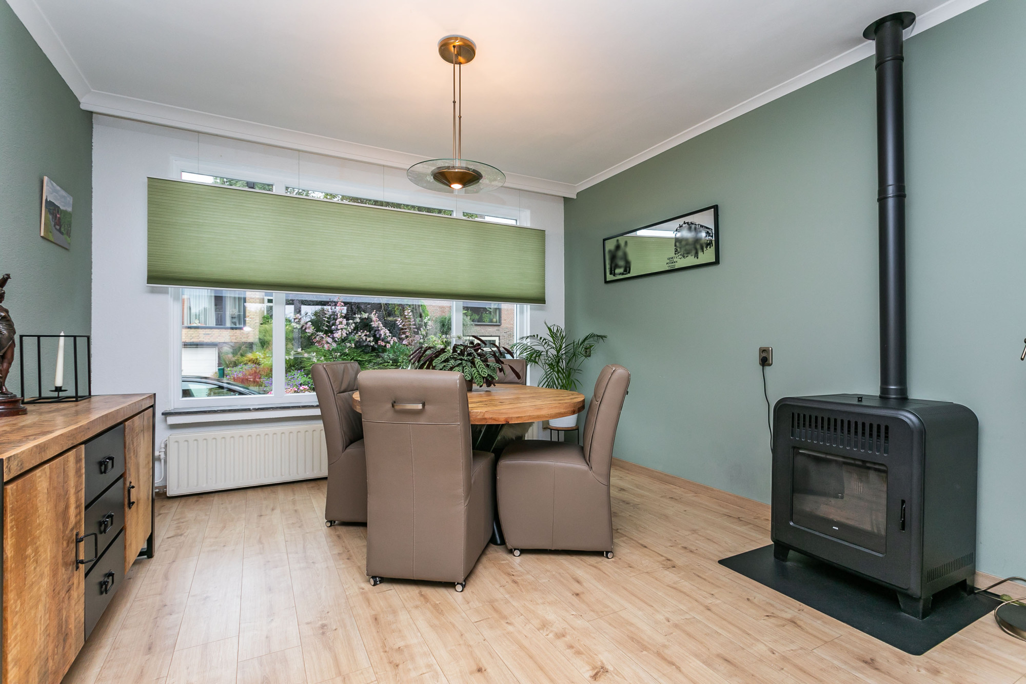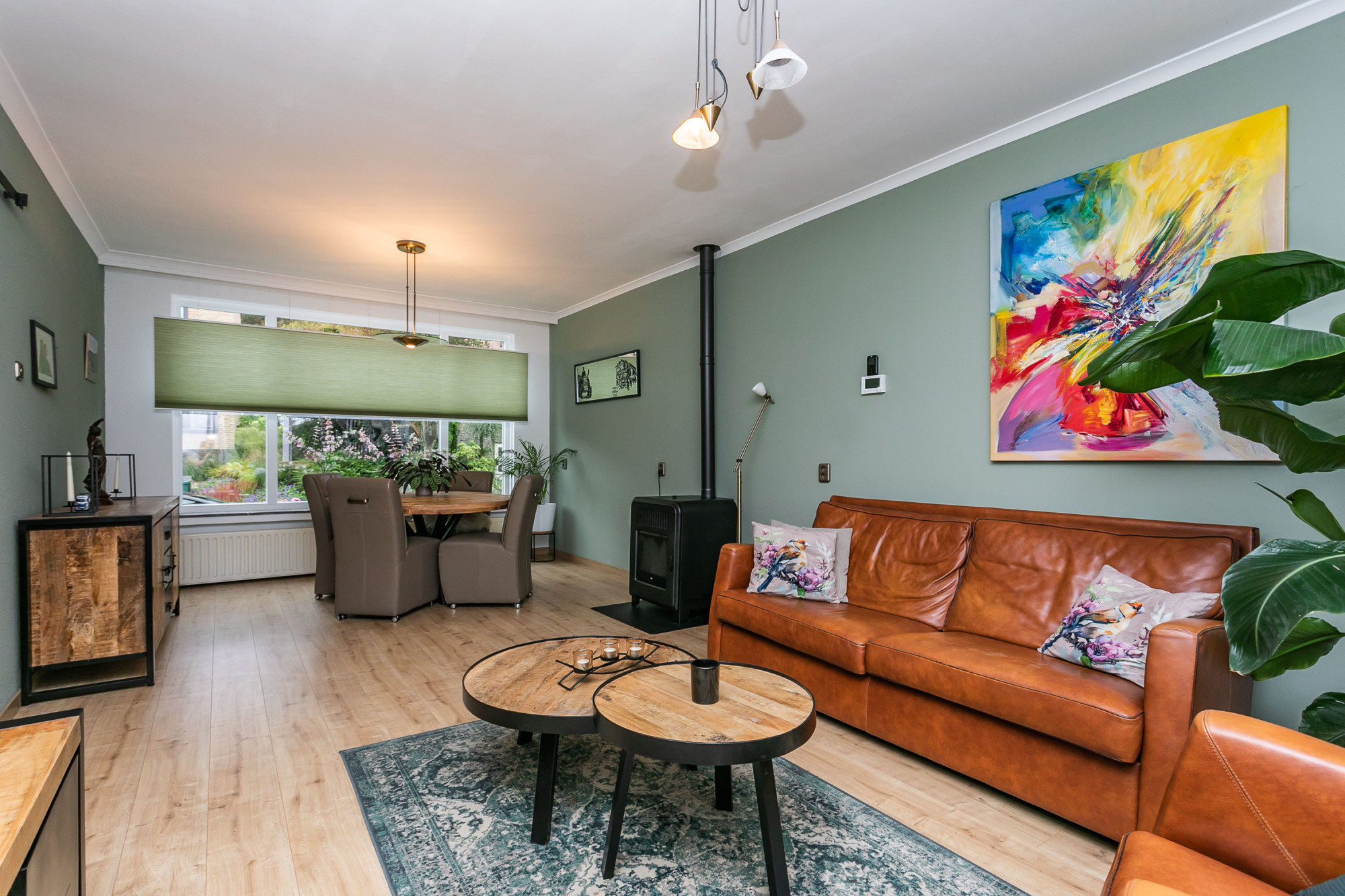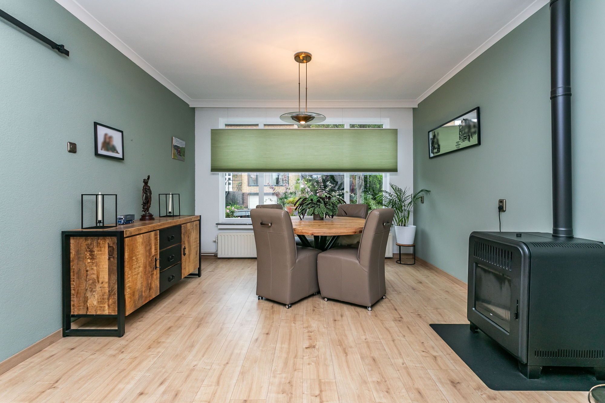 De woning heeft een lichte doorzon-woonkamer met een eethoek aan de voorzijde en een sfeervolle pelletkachel als centraal middelpunt. Aan de achterzijde bevindt zich de living/lounge met zithoek, audio-/visuele aansluitingen en een schuifpui naar het grote overdekte terras met direct tuincontact.