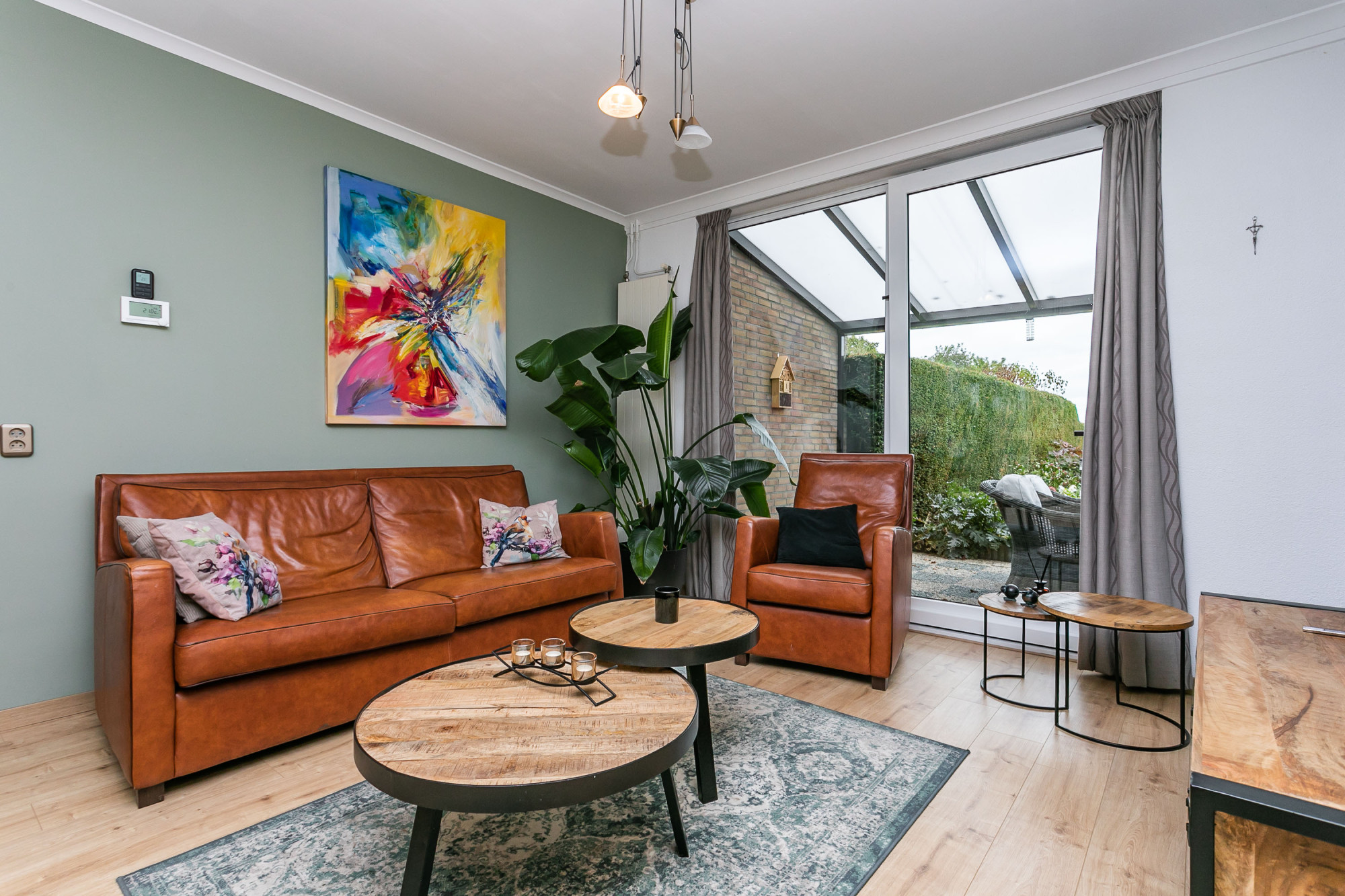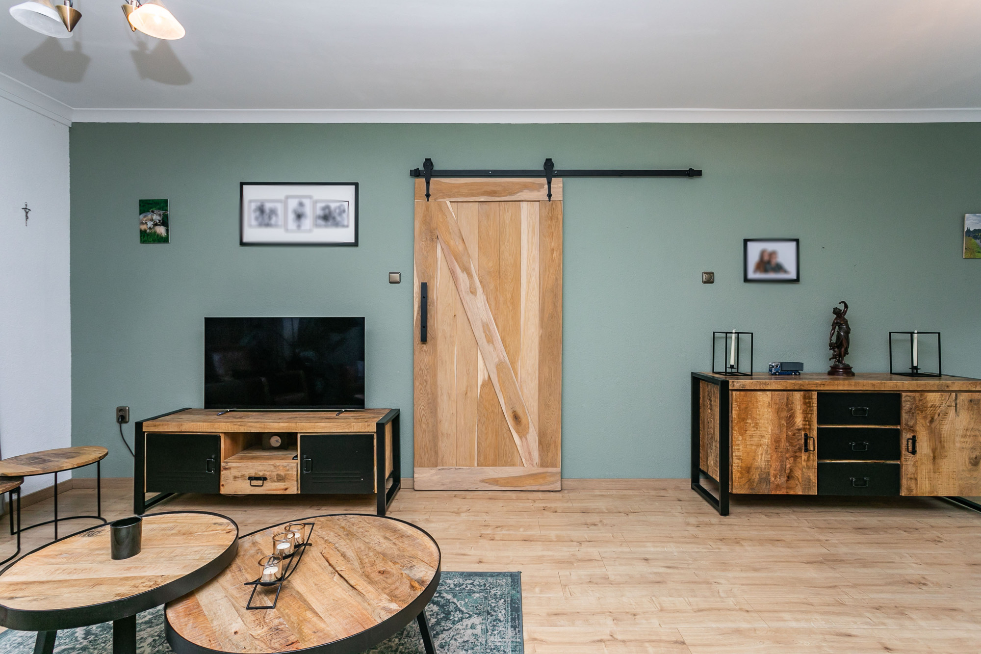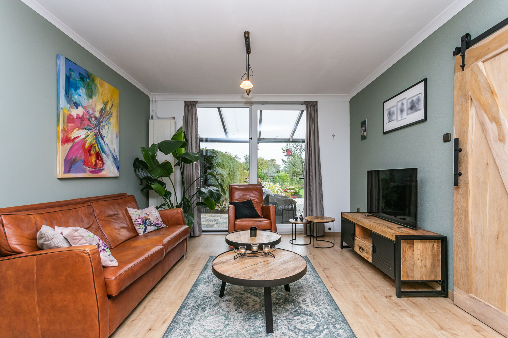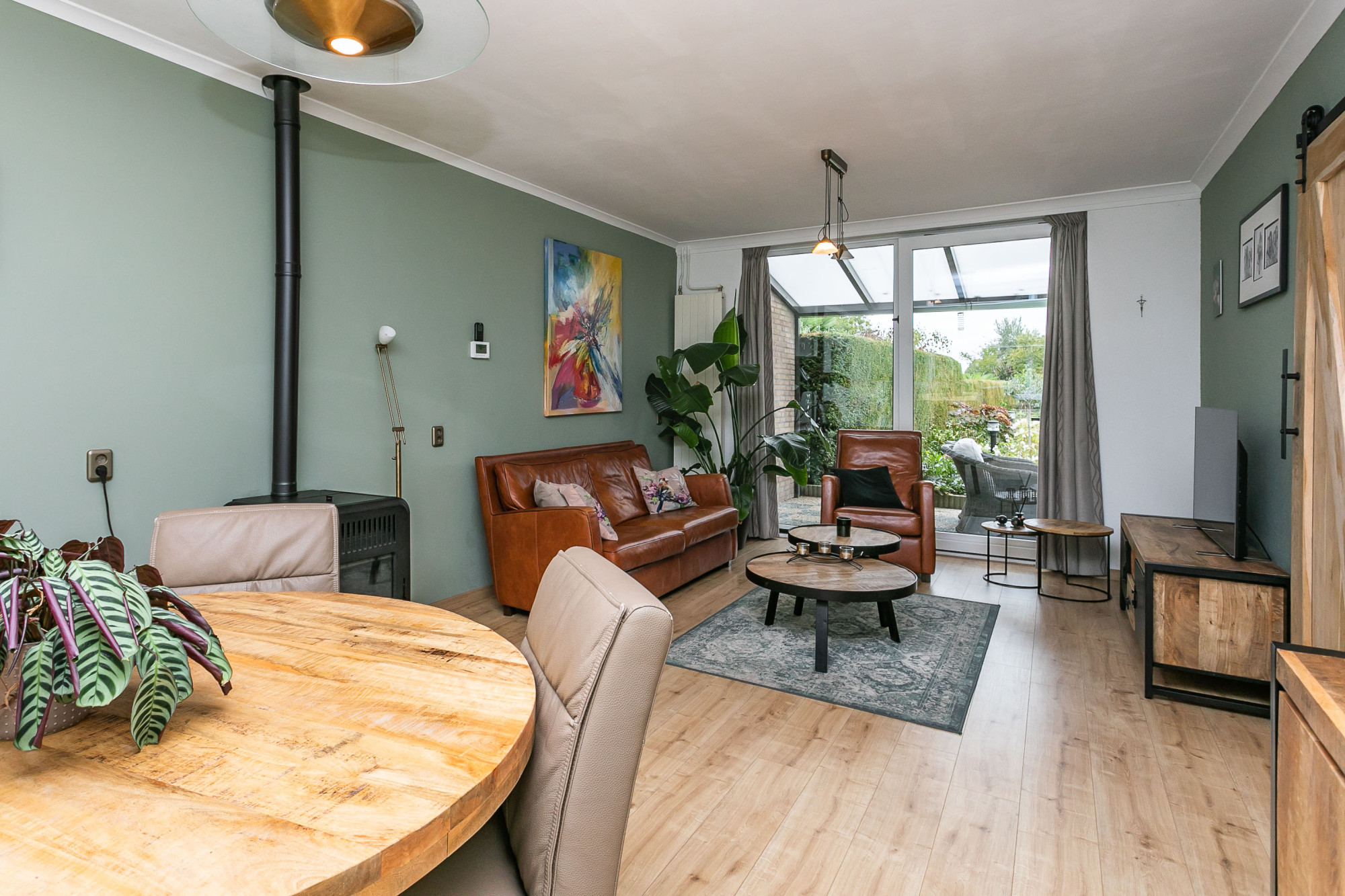 De woning heeft een lichte doorzon-woonkamer met een eethoek aan de voorzijde en een sfeervolle pelletkachel als centraal middelpunt. Aan de achterzijde bevindt zich de living/lounge met zithoek, audio-/visuele aansluitingen en een schuifpui naar het grote overdekte terras met direct tuincontact.