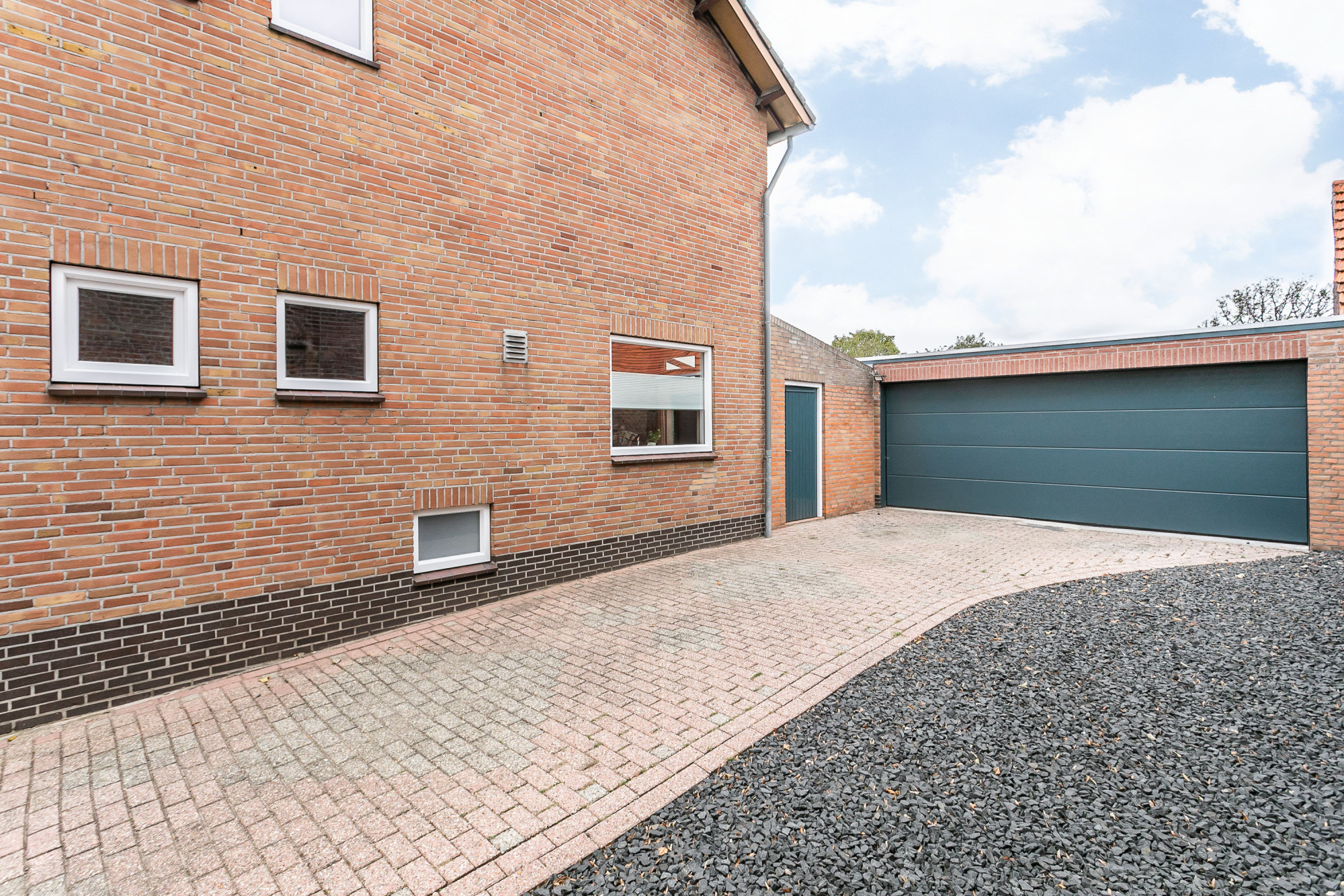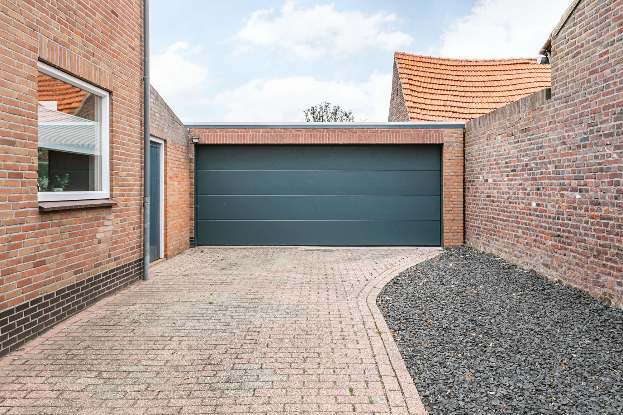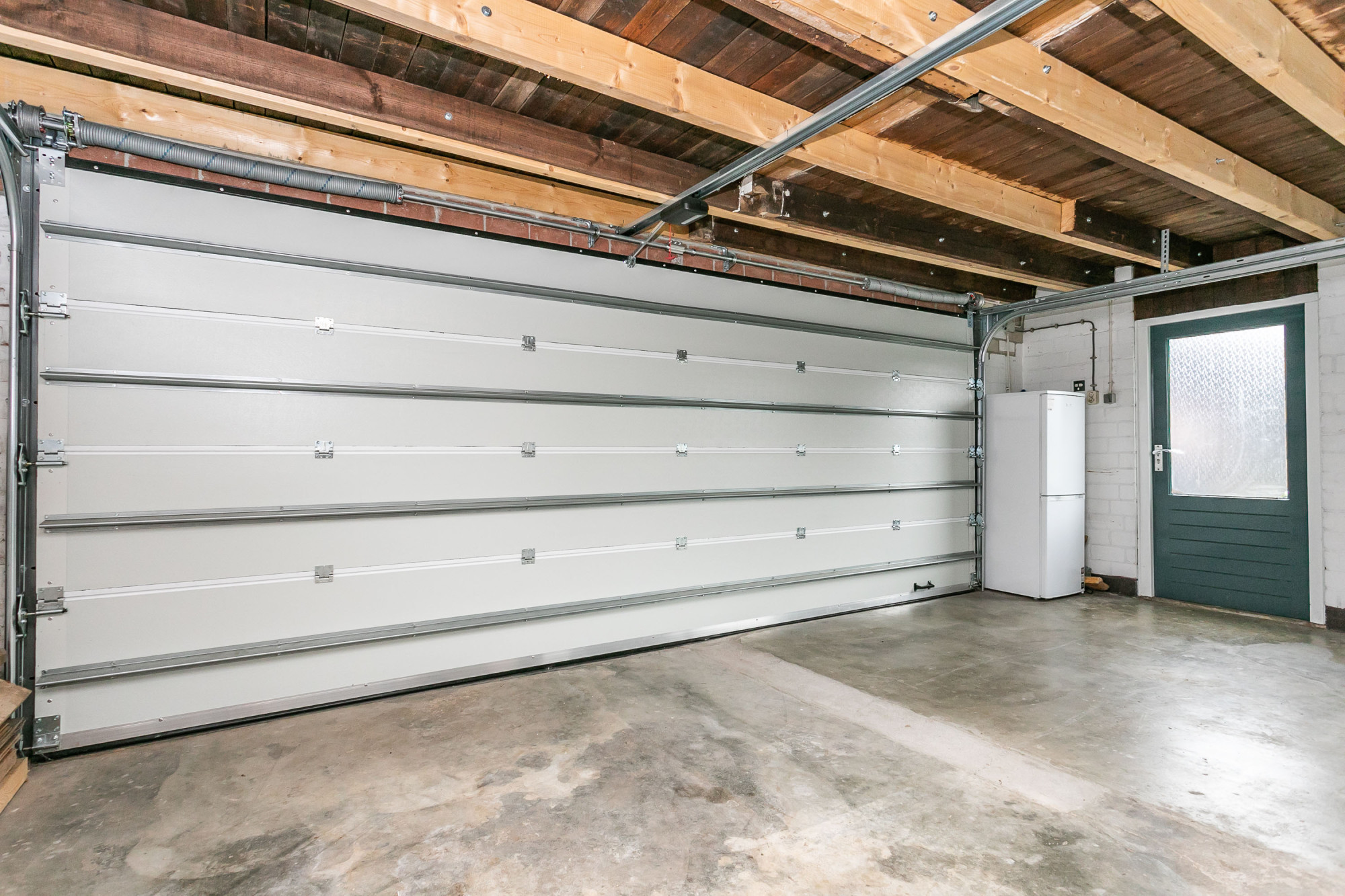 De royale dubbele garage is voorzien van een elektrisch bedienbare sectionaal poort, lichtkoepel en uitstortgootsteen. De ruime oprit biedt parkeergelegenheid voor meerdere voertuigen op eigen terrein.