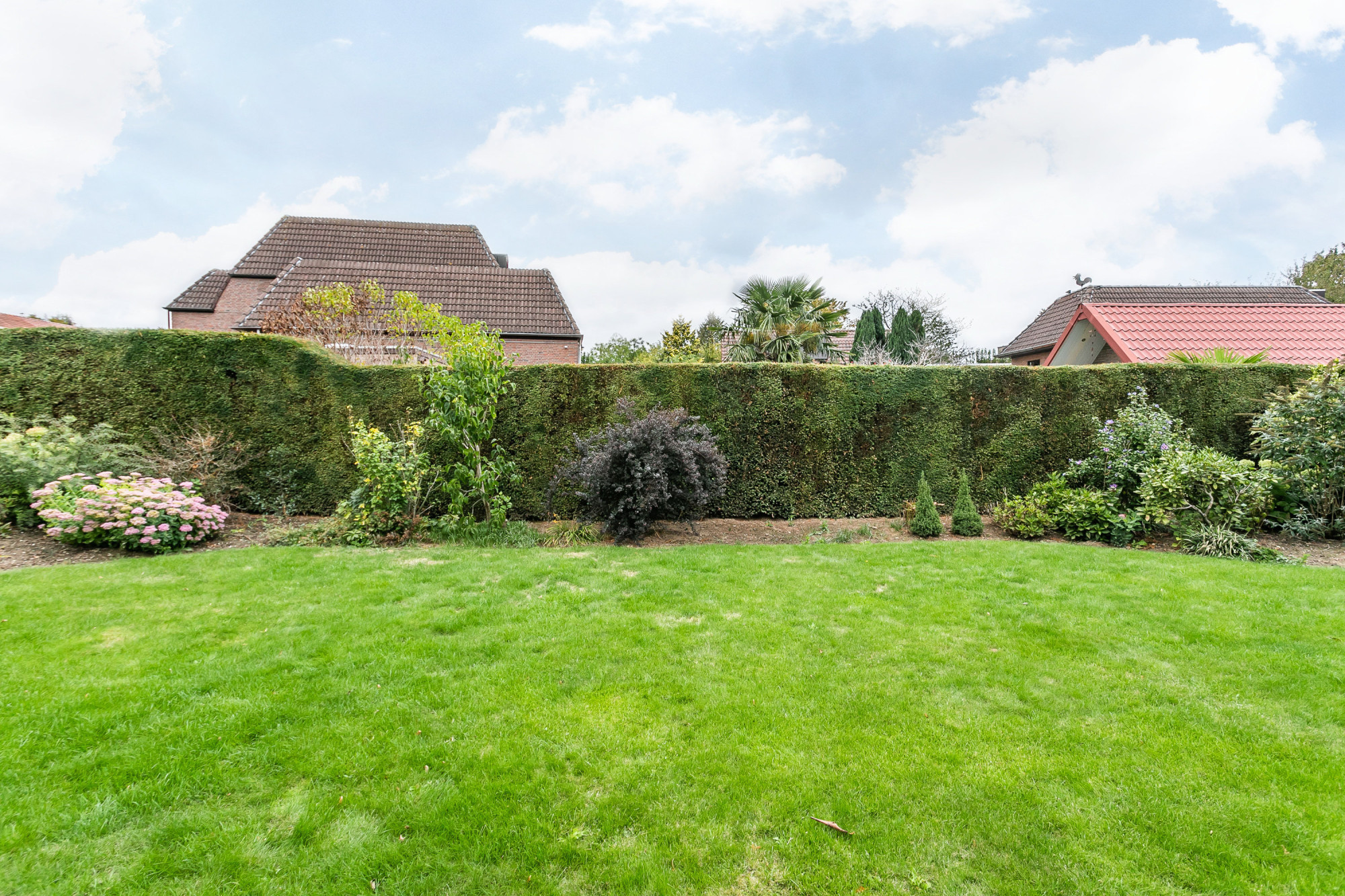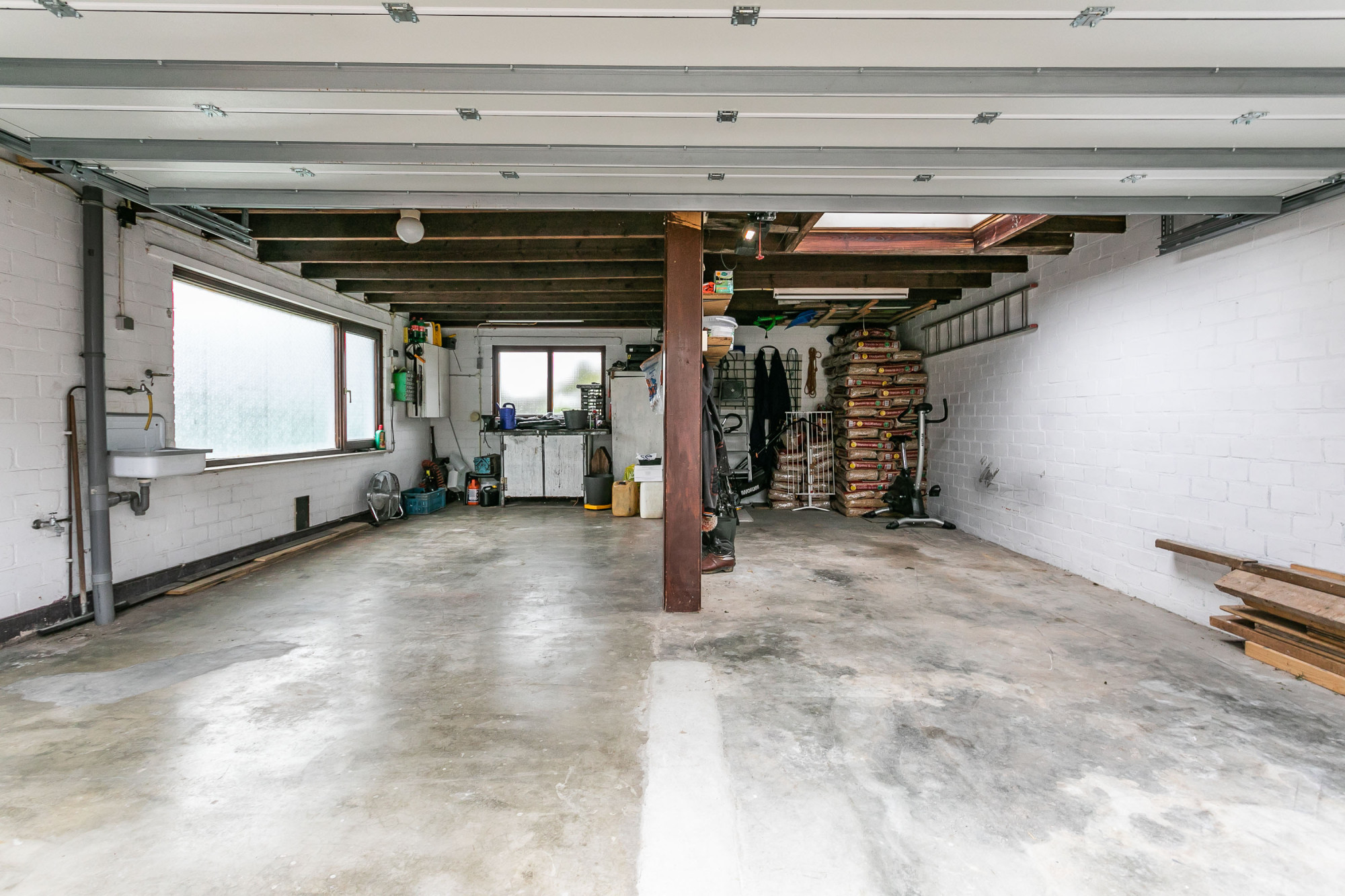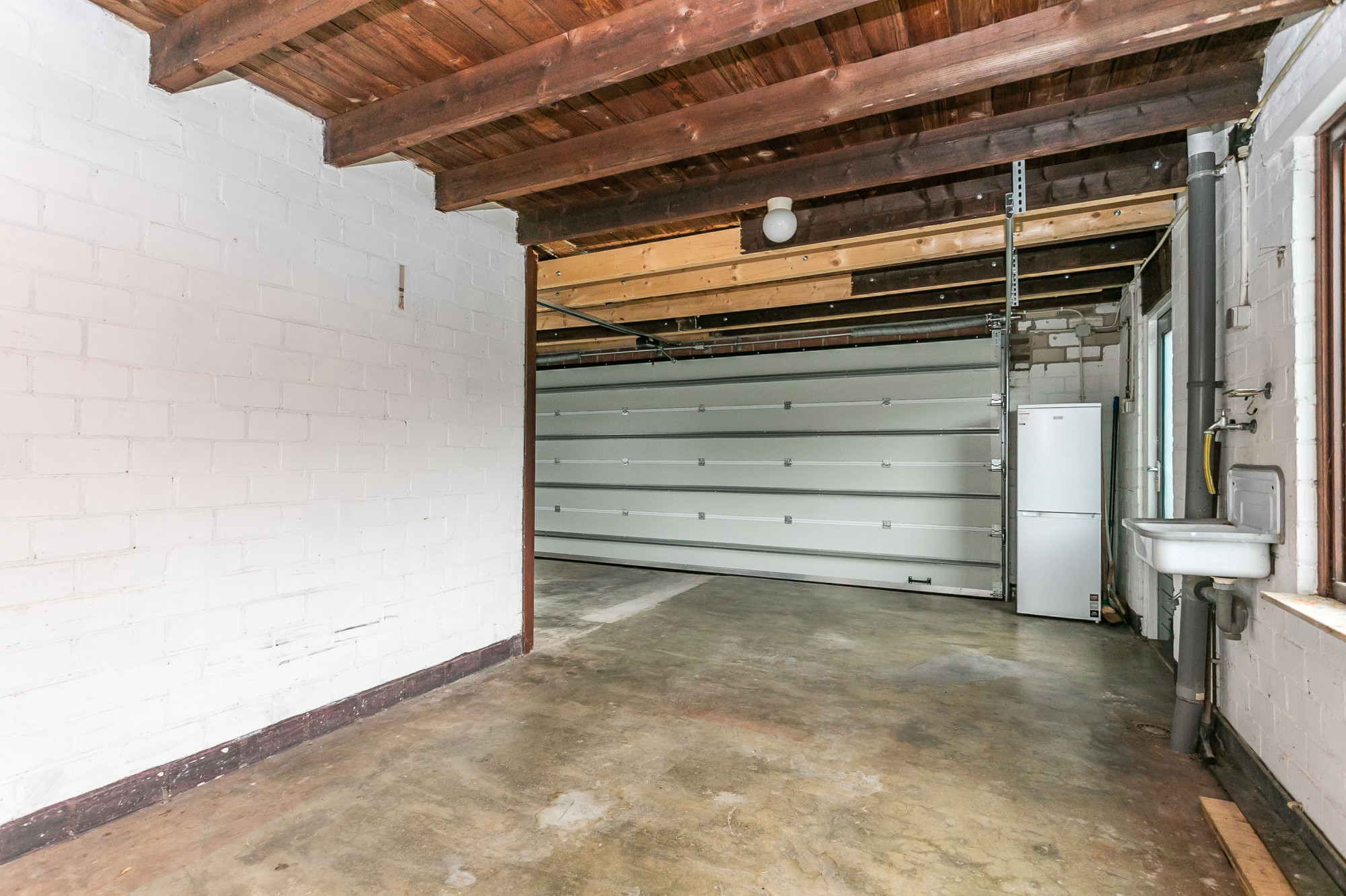 De royale dubbele garage is voorzien van een elektrisch bedienbare sectionaal poort, lichtkoepel en uitstortgootsteen. De ruime oprit biedt parkeergelegenheid voor meerdere voertuigen op eigen terrein.