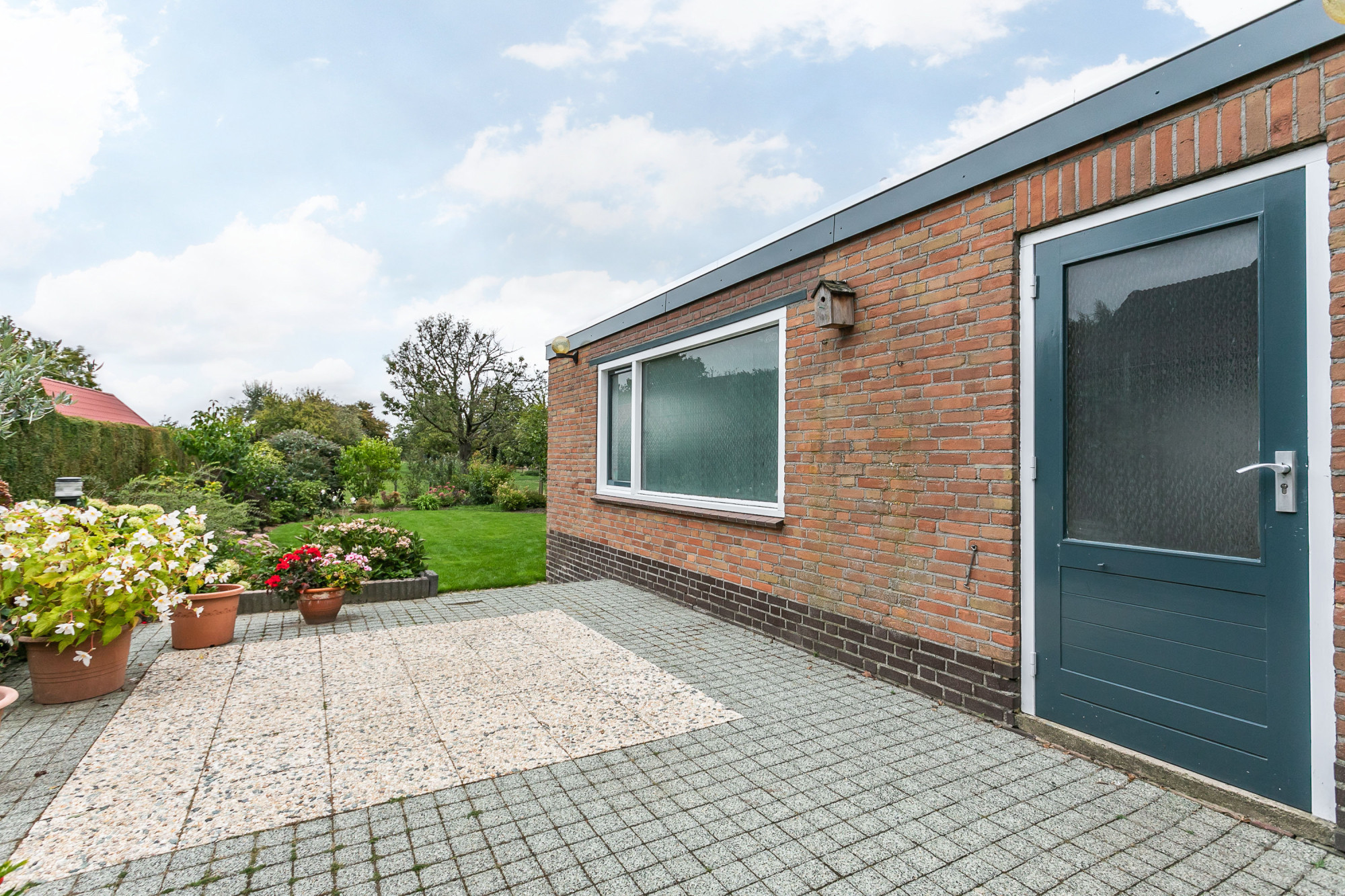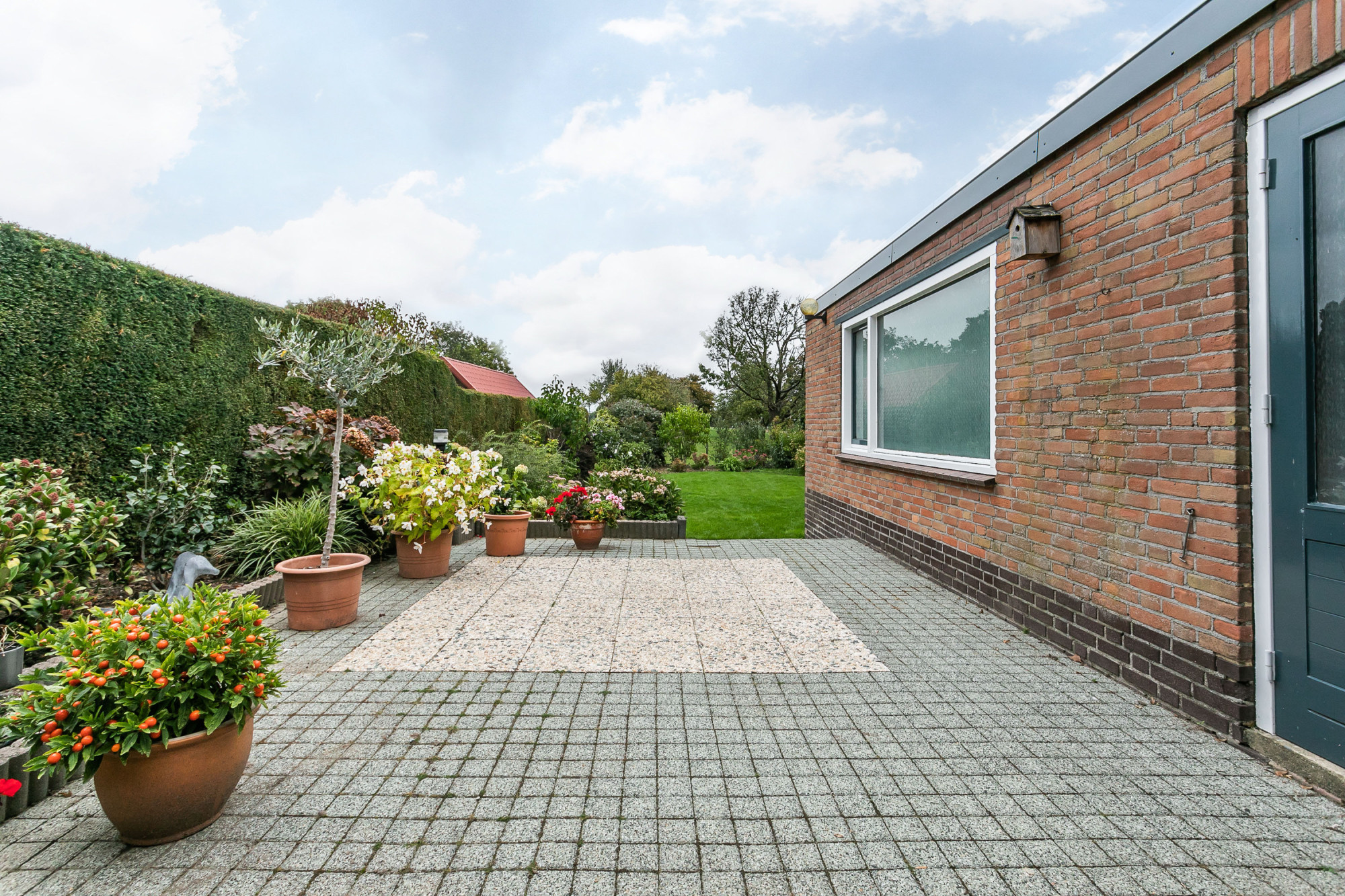 Diepe achtertuin met ruim overdekt bordesterras / zijingang / borders met aanplanting, gazon en aangebouwde tuinberging. Vrij uitzicht op een fruitboomgaard, voldoende speelruimte voor de kinderen of het aanleggen van een moestuin.