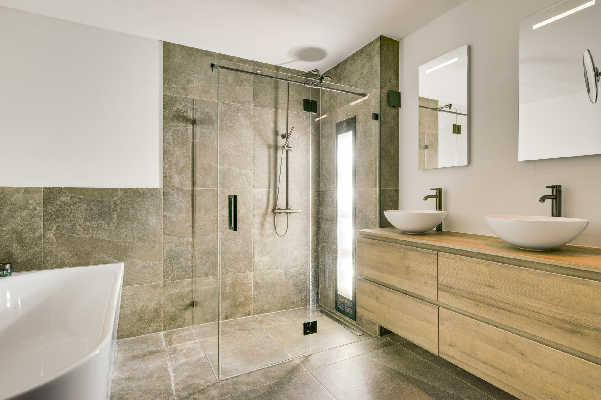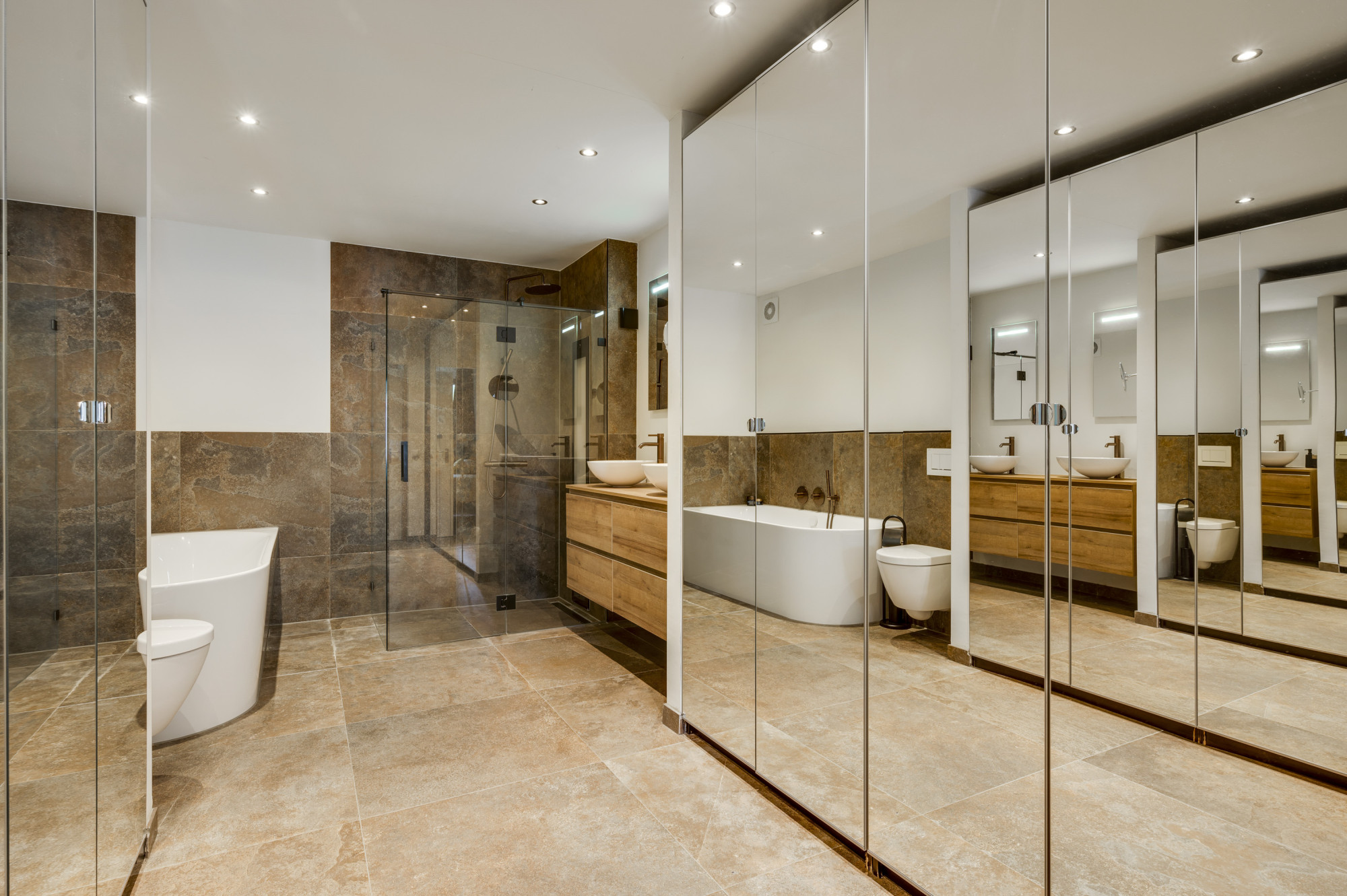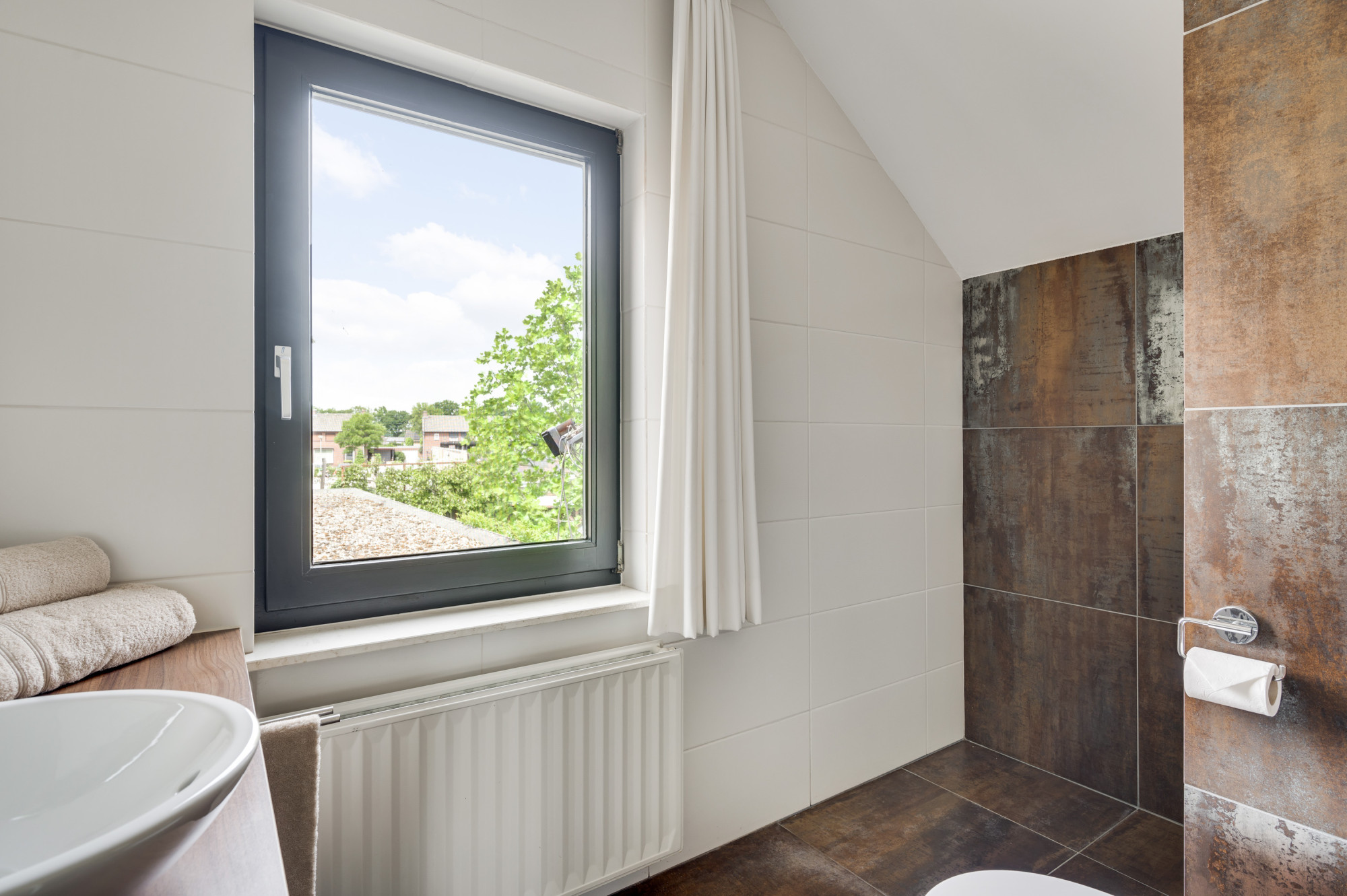 Op de eerste verdieping bevinden zich nog twee comfortabele slaapkamers en een moderne tweede badkamer met inloopdouche, wastafel en een zwevend toilet. Ook op deze verdieping is een airco (Daikin) aanwezig, wat zorgt voor extra comfort tijdens warme en koele dagen.