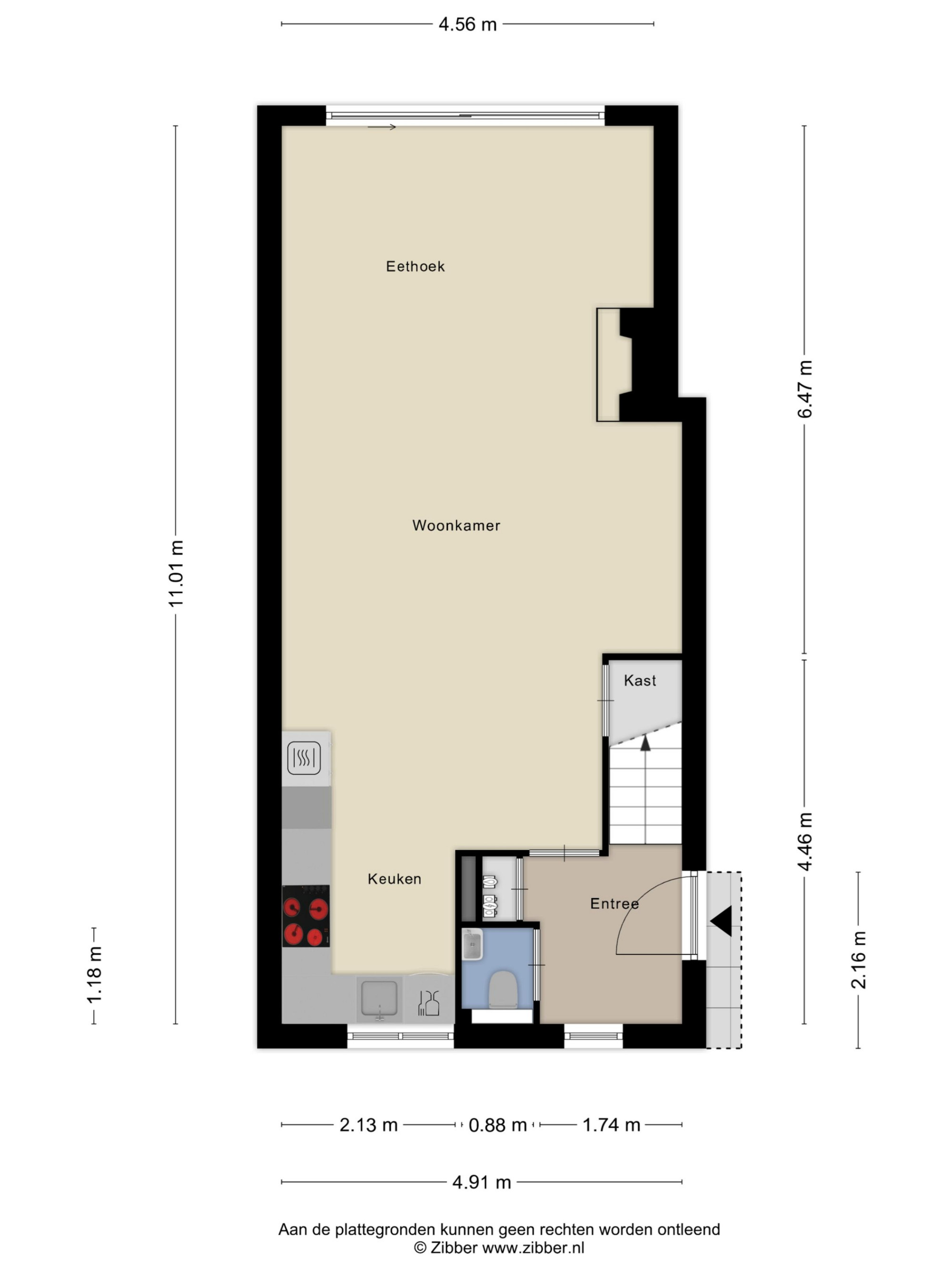 Begane grond: Entree, meterkast, modern toilet met fonteintje, woonkamer met open keuken voorzien van granieten aanrechtblad, inductie kookplaat, afzuigkap, vaatwasser, combi oven/magnetron en koelkast, de woonkamer heeft een airco, een parketvloer en een schuifpui naar de tuin.