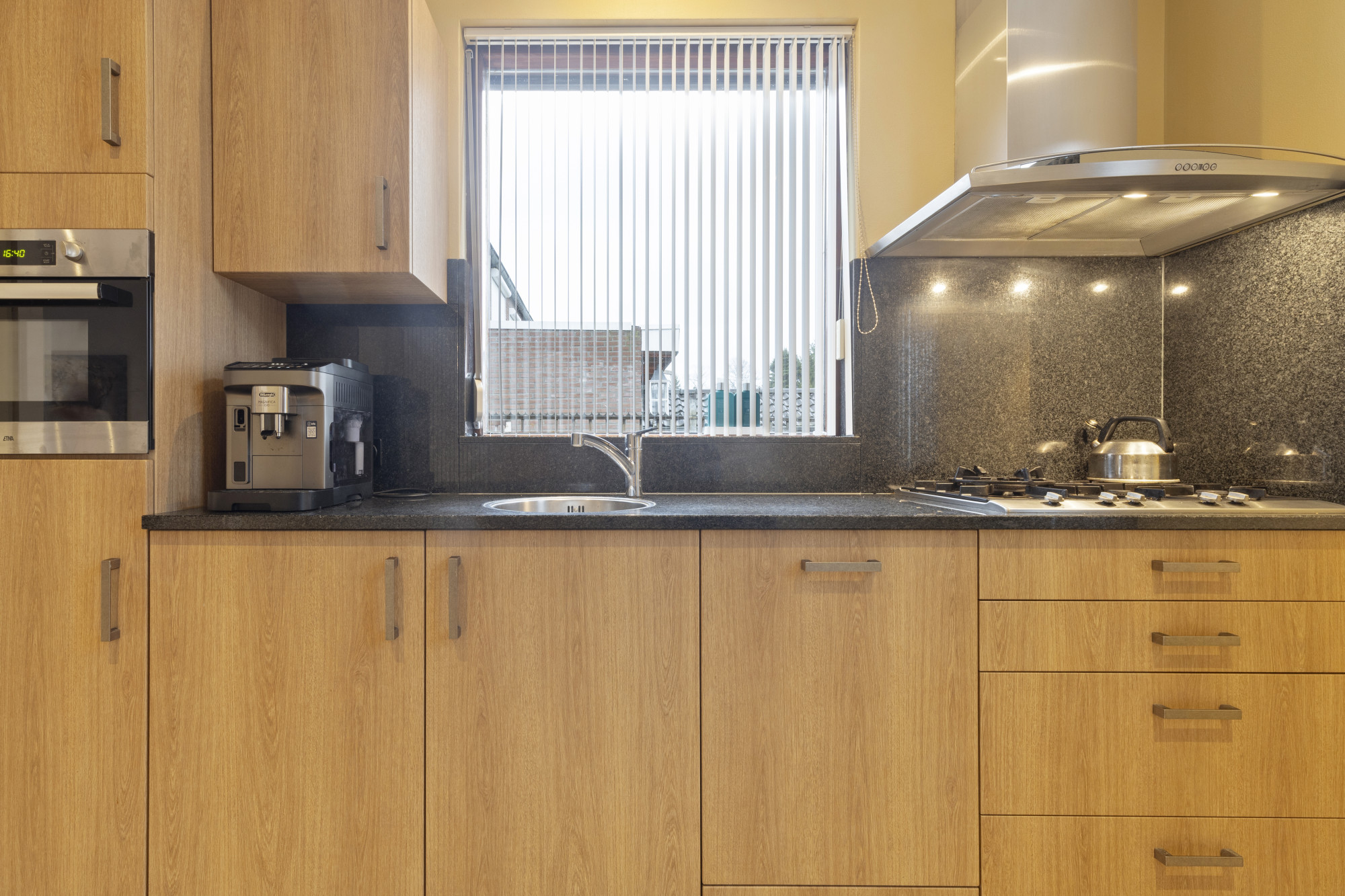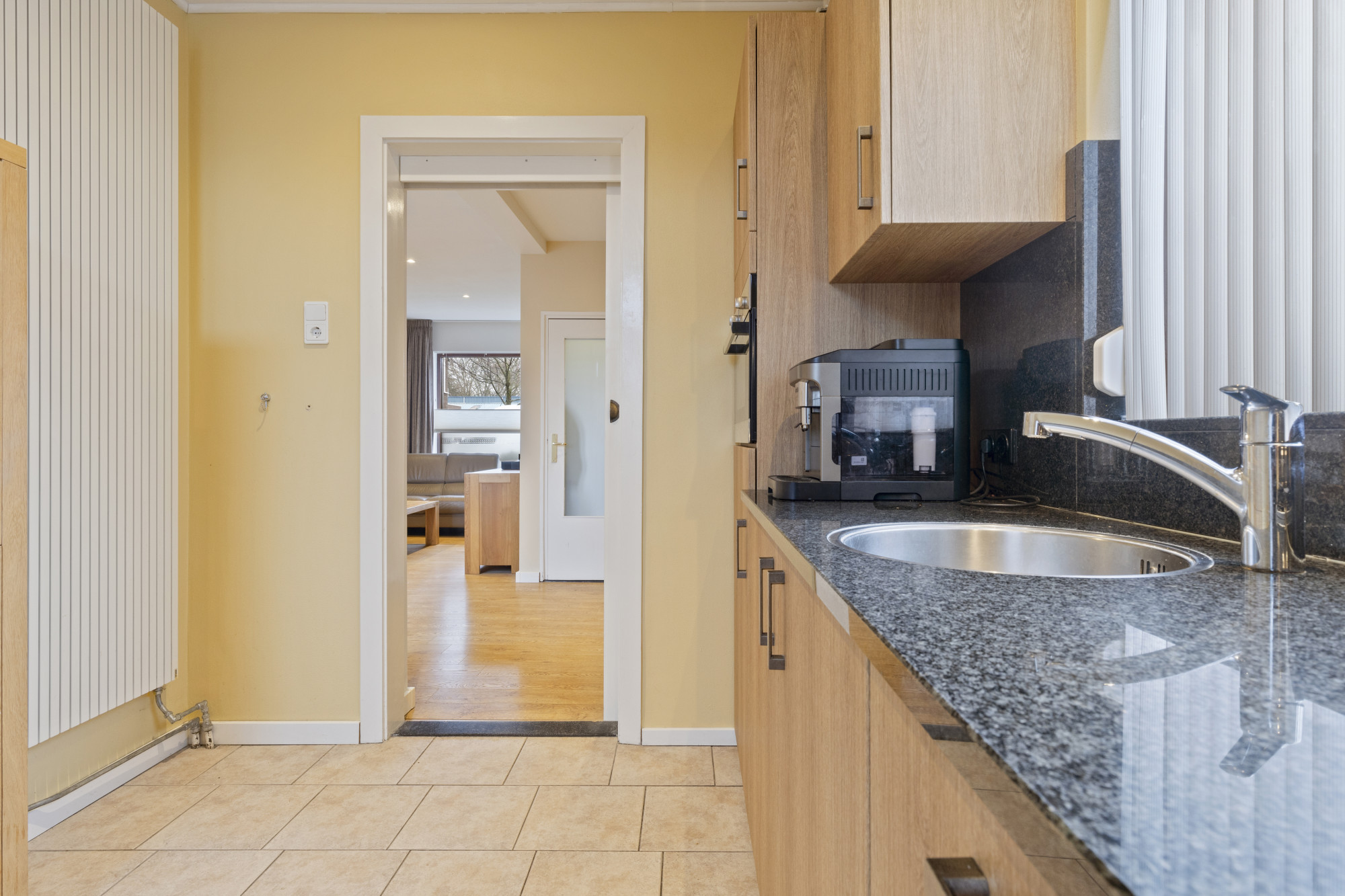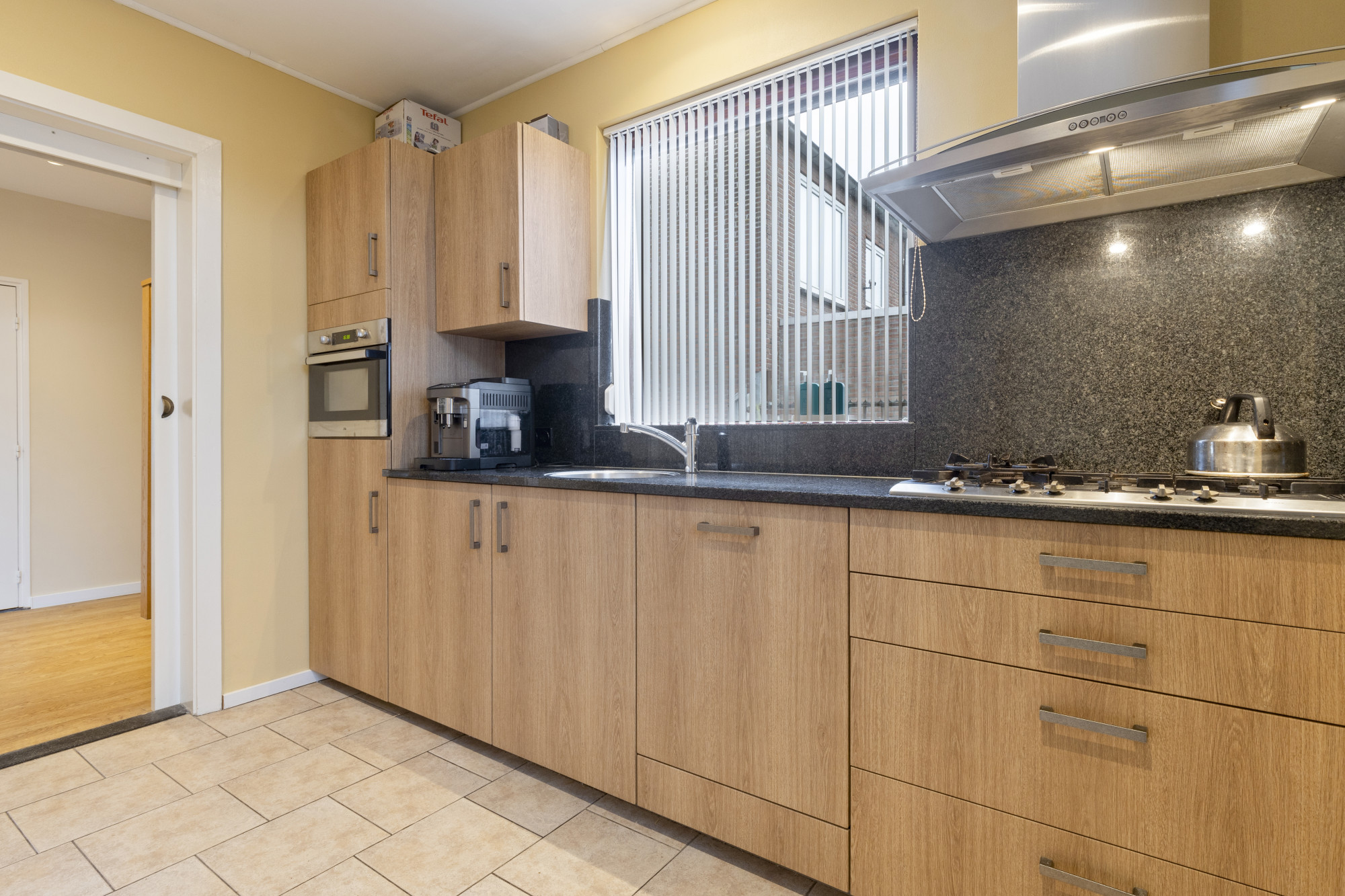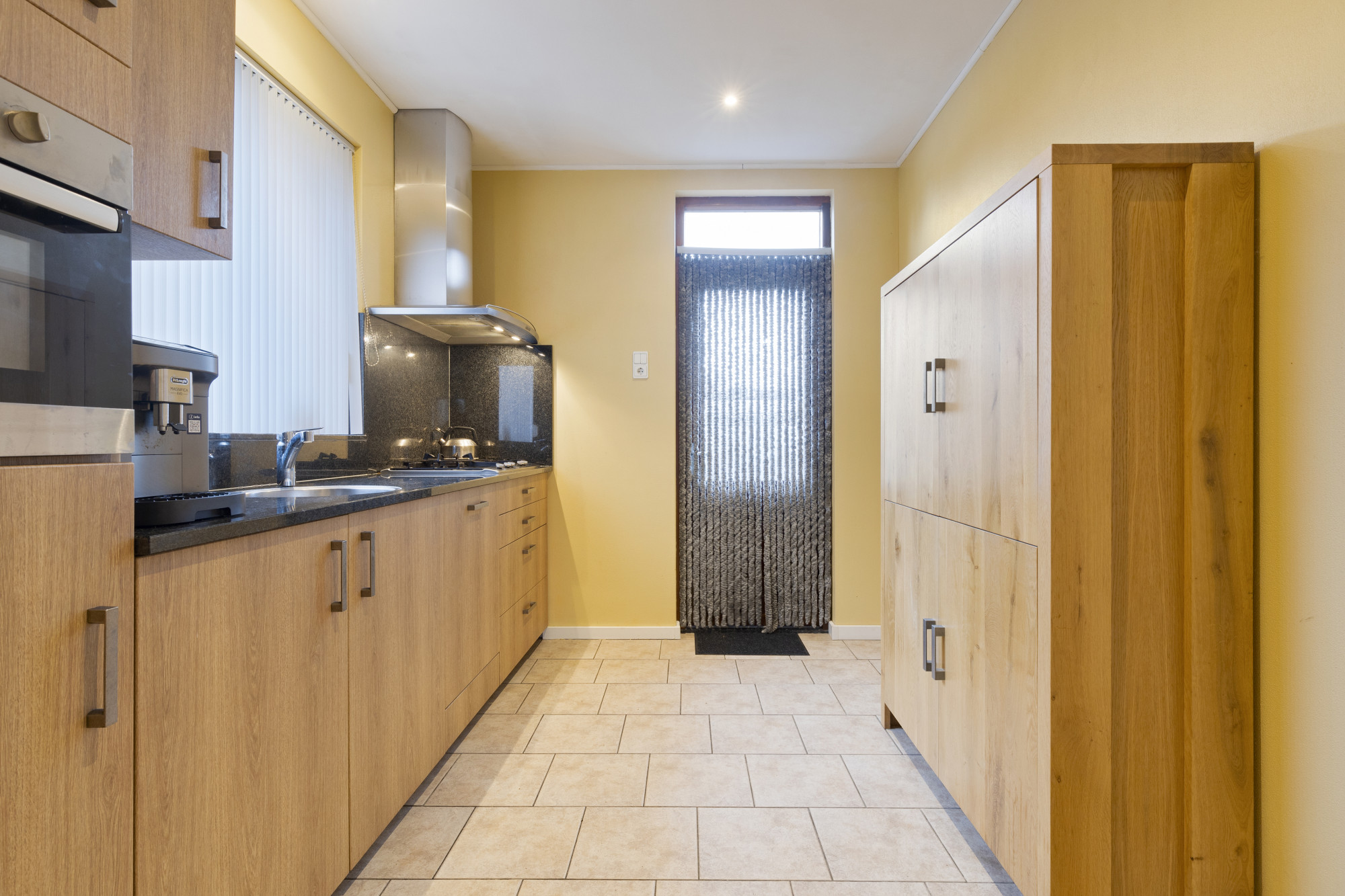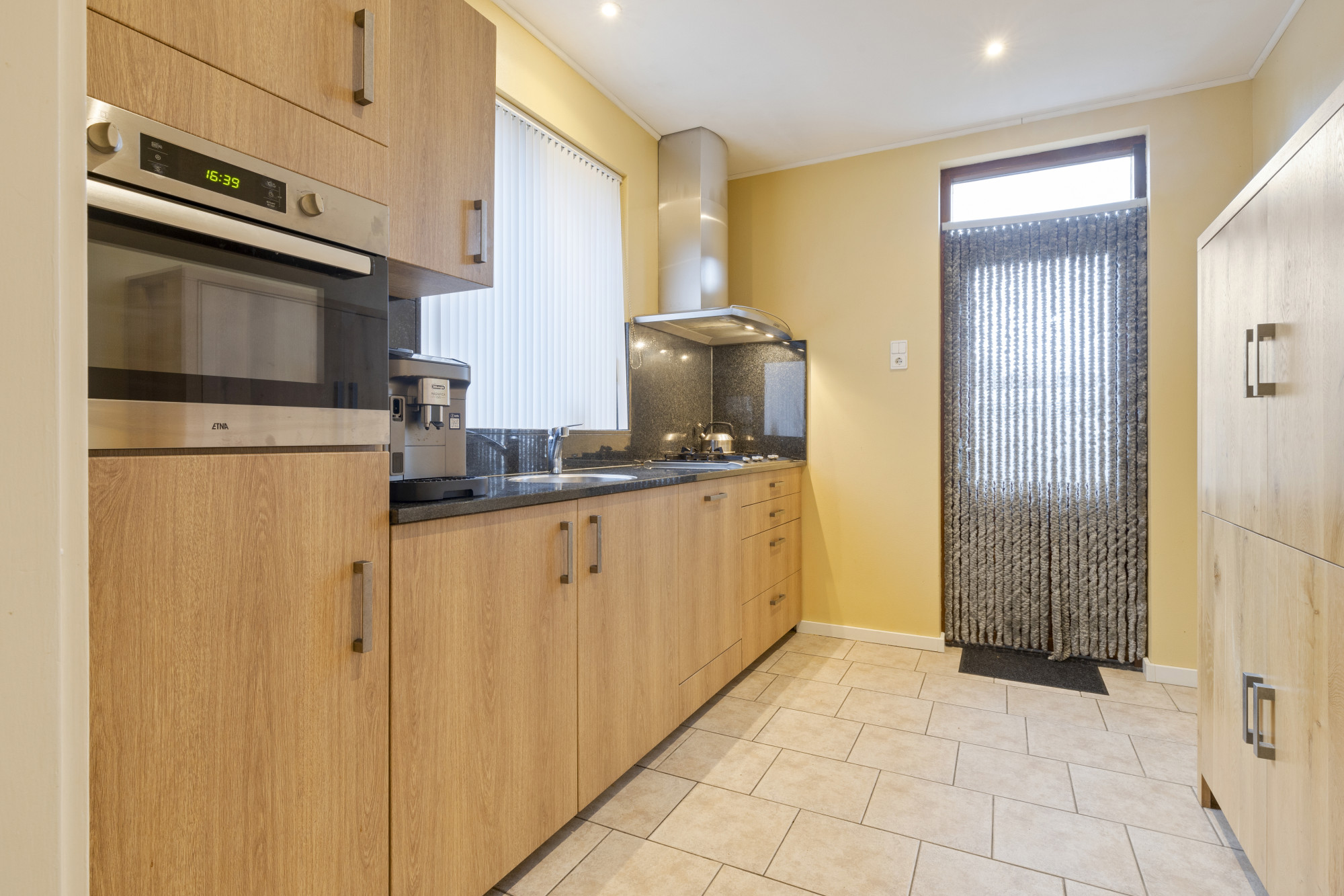 De gesloten leefkeuken is voorzien van een tegelvloer, veel kastruimte en diverse inbouwapparatuur, waaronder een 5-pits gaskomfoor, afzuigkap, combimagnetron, vaatwasser en koelkast. Een deur geeft direct toegang tot de tuin, waardoor binnen en buiten naadloos in elkaar overgaan.