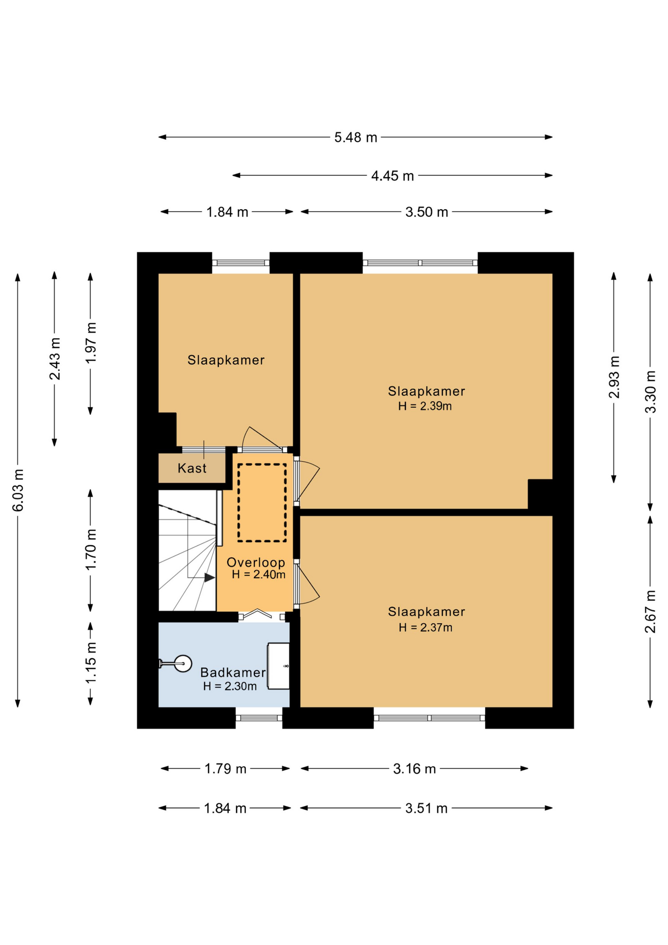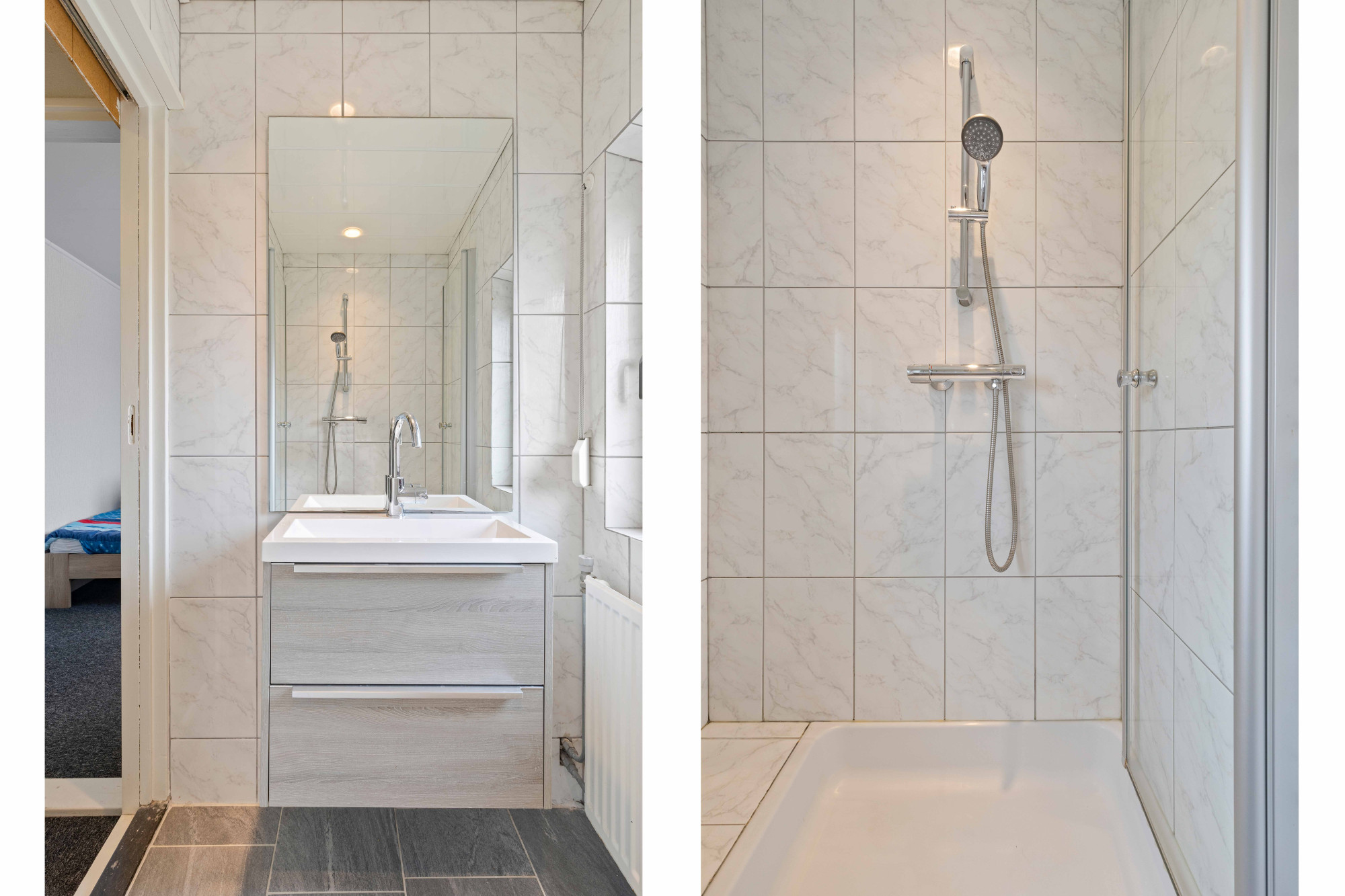 Overloop met toegang tot drie slaapkamers, allen voorzien van vloerbedekking. De compacte maar functionele badkamer beschikt over een douchecabine en een wastafel.