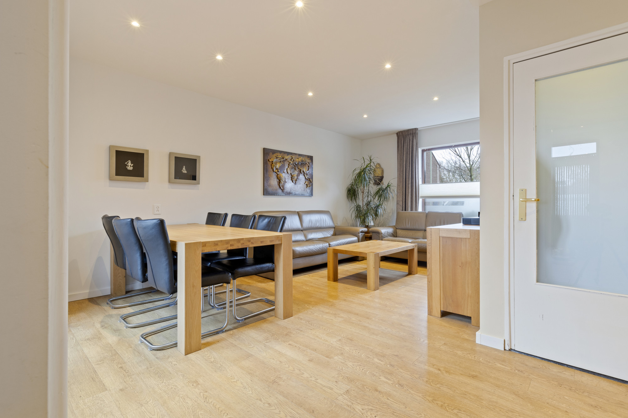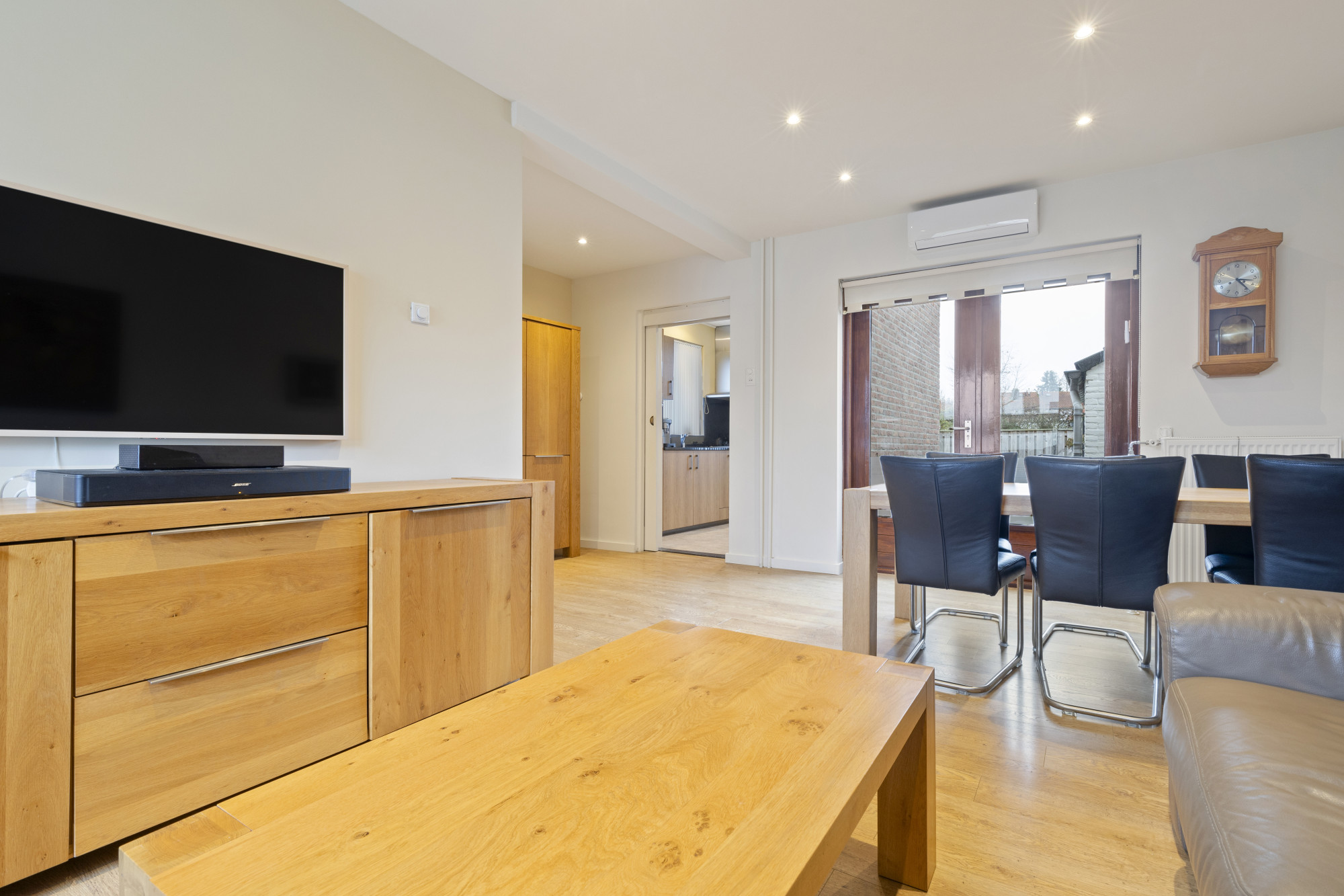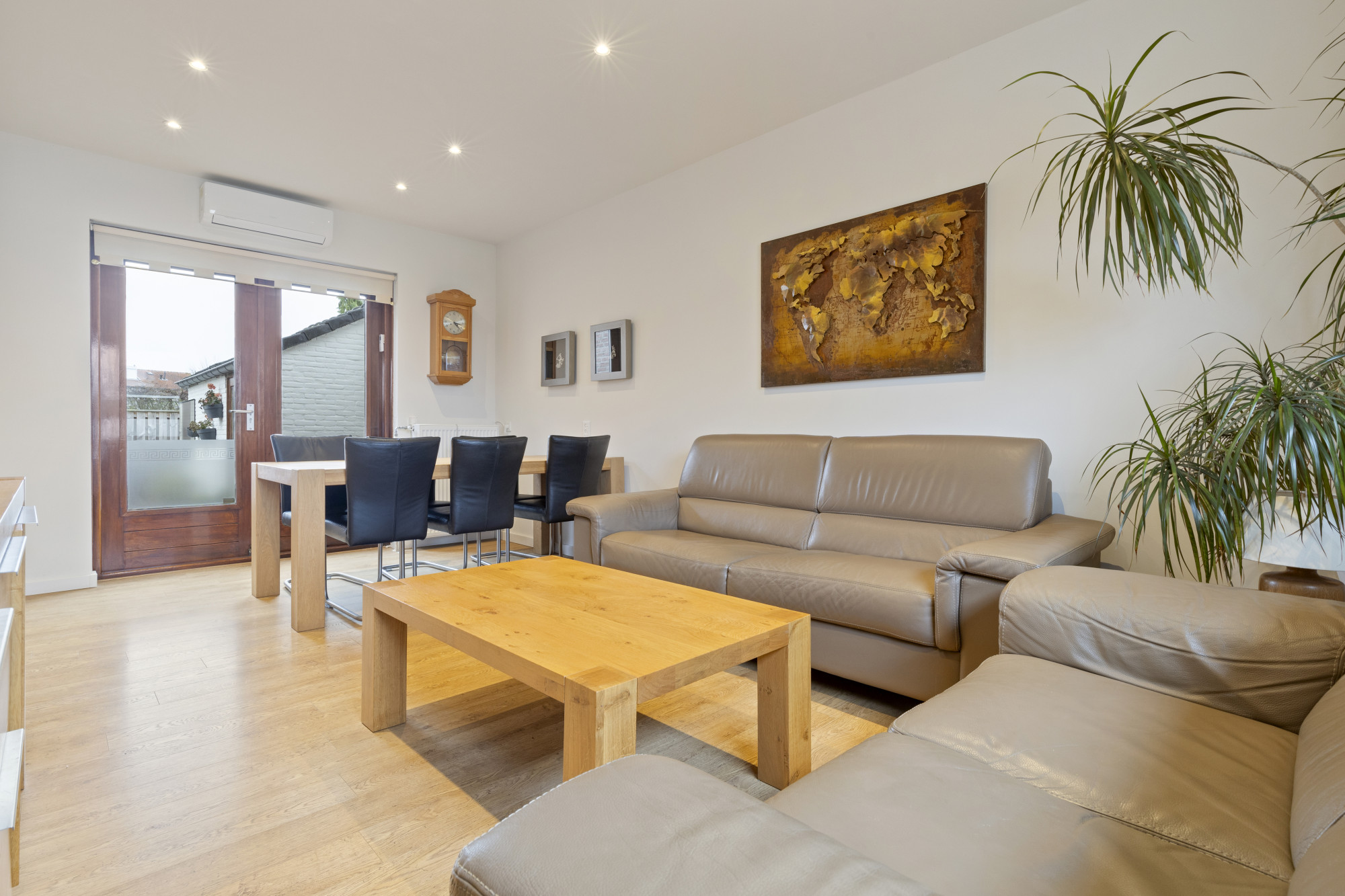 De lichte woonkamer biedt dankzij de openslaande deuren een mooie verbinding met de tuin en heeft een prettige leefruimte.
