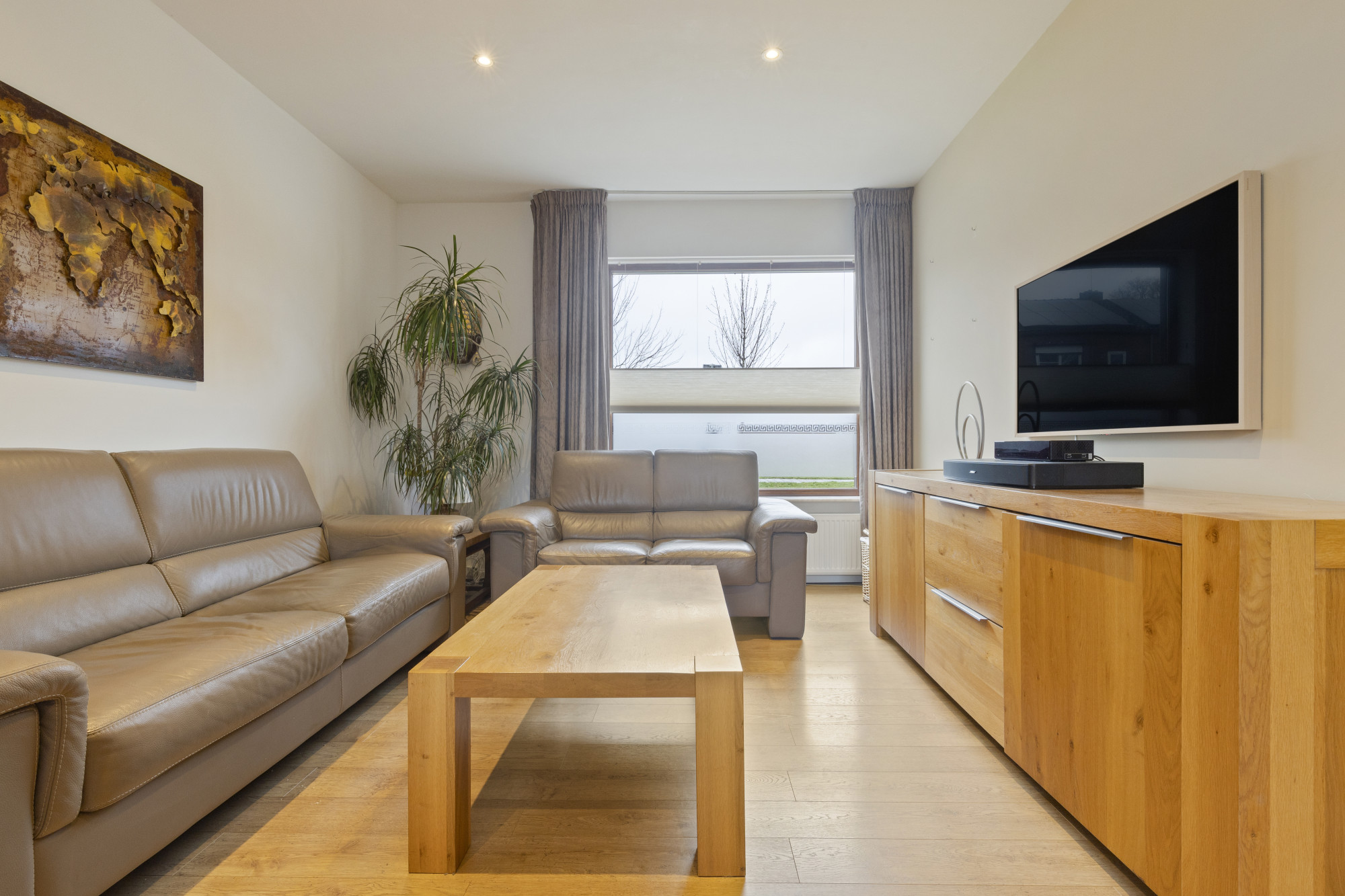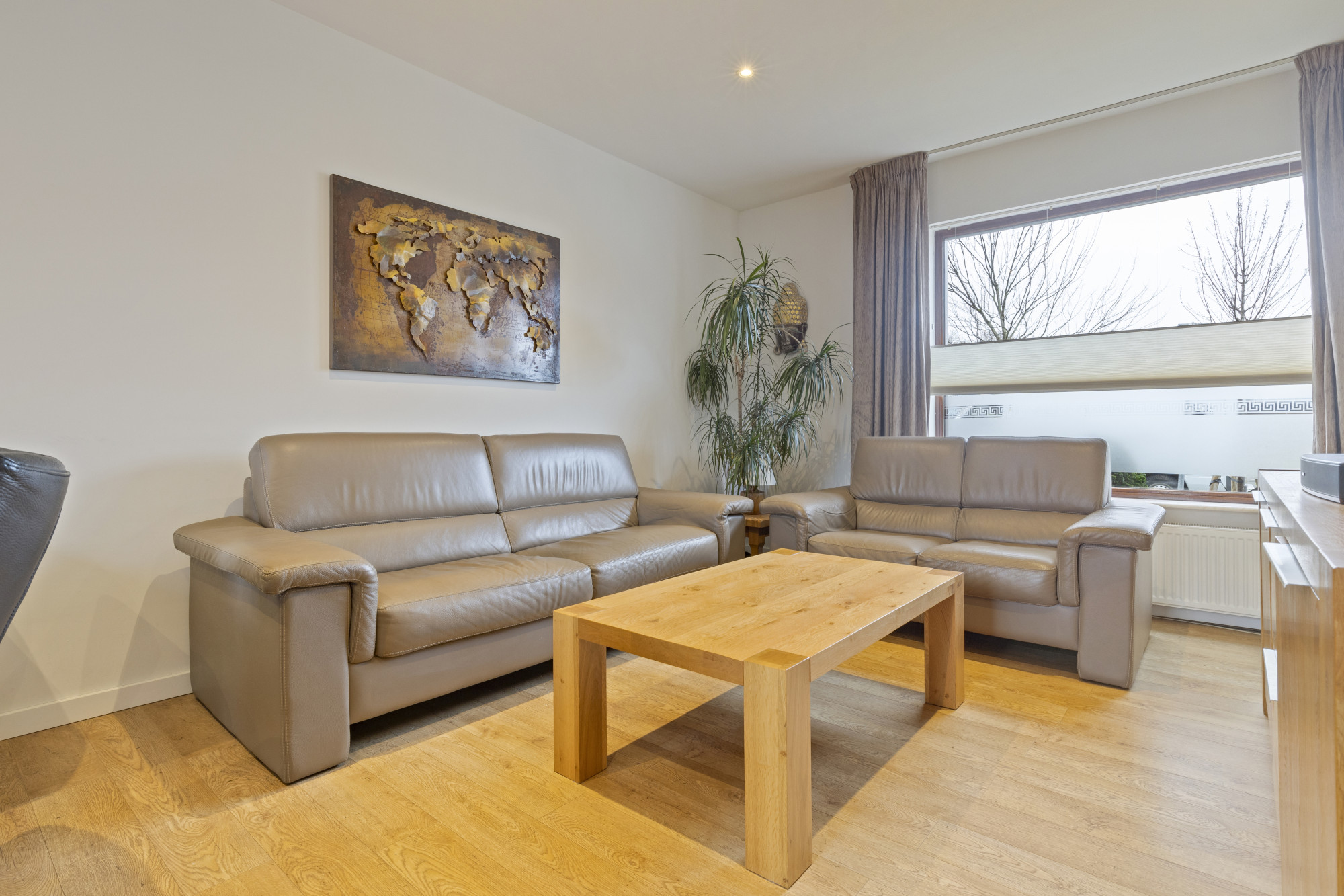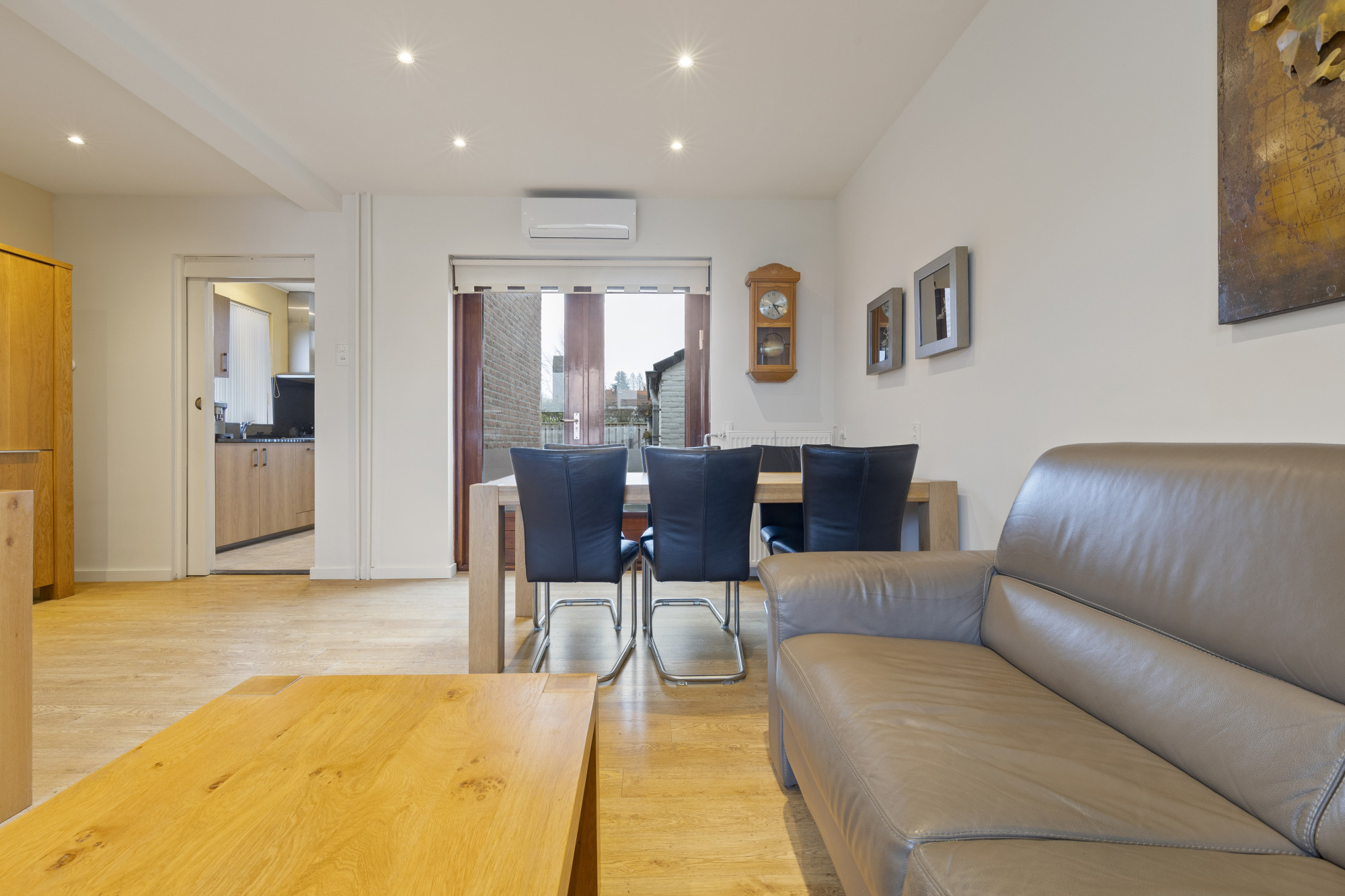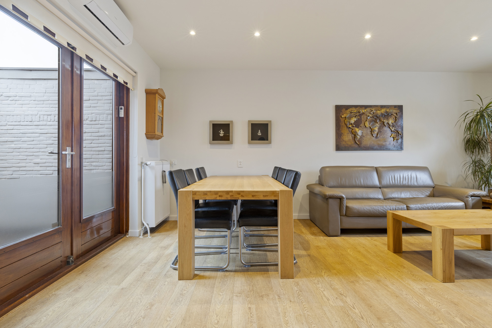 De lichte woonkamer biedt dankzij de openslaande deuren een mooie verbinding met de tuin en heeft een prettige leefruimte.