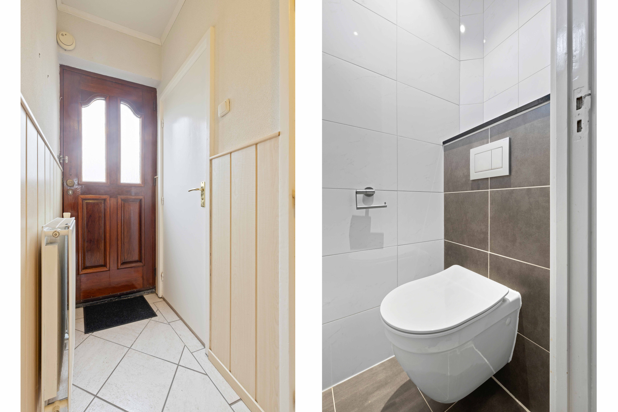 Via de voordeur betreedt u de hal met toegang tot de meterkast en het modern betegelde toilet met zwevend closet.