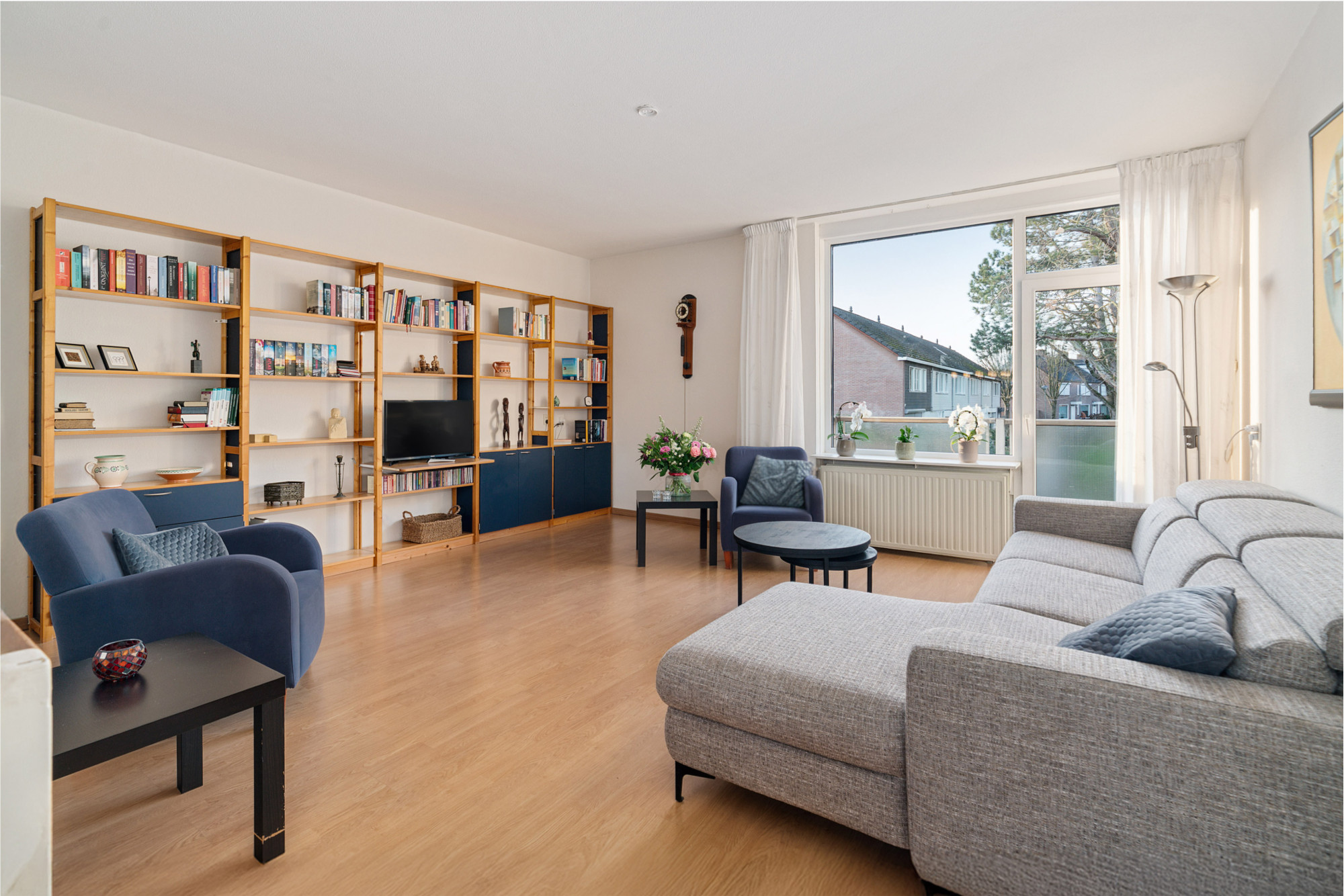 Op de eerste verdieping bevindt zich de ruime en lichte woonkamer. Grote raampartijen zorgen voor een prettige sfeer en een mooie lichtinval. Aan de voorzijde is een balkon aanwezig, ideaal om even buiten te zitten. De woonkamer beschikt bovendien over een praktisch keukenblokje met koelkast en wastafel, wat deze verdieping extra comfortabel maakt. Ook hier is de laminaatvloer stijlvol doorgetrokken.