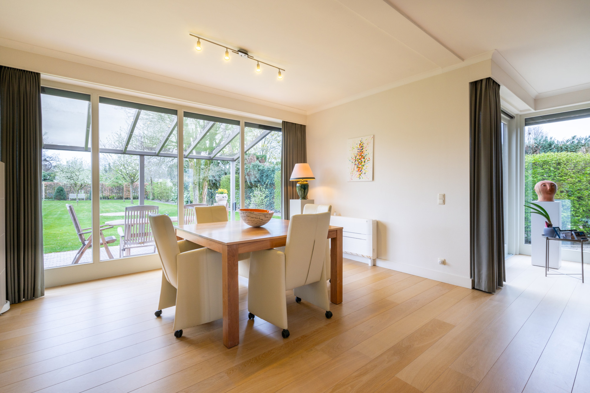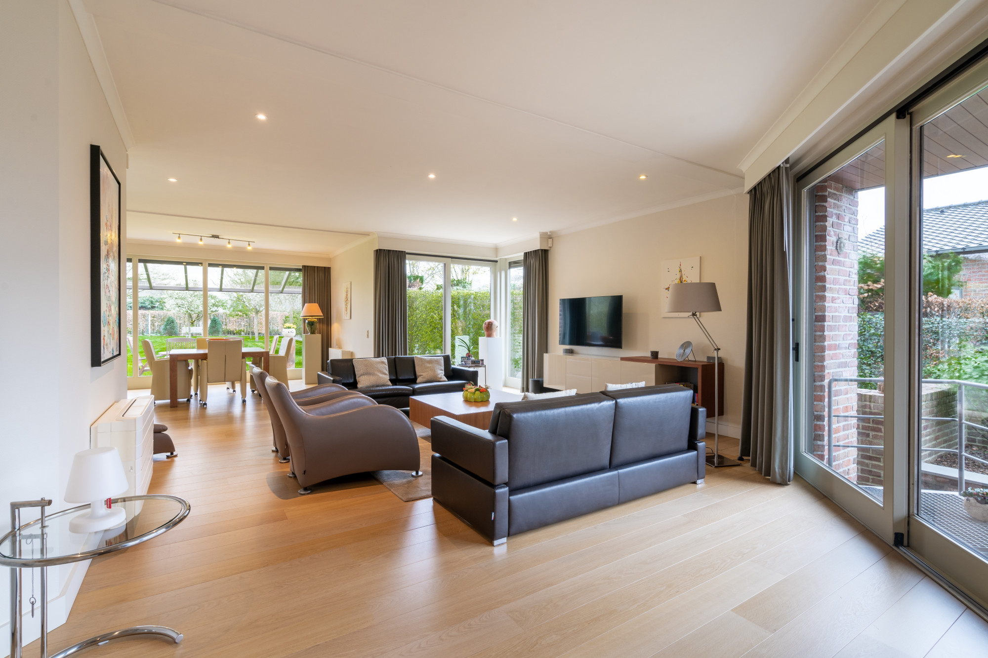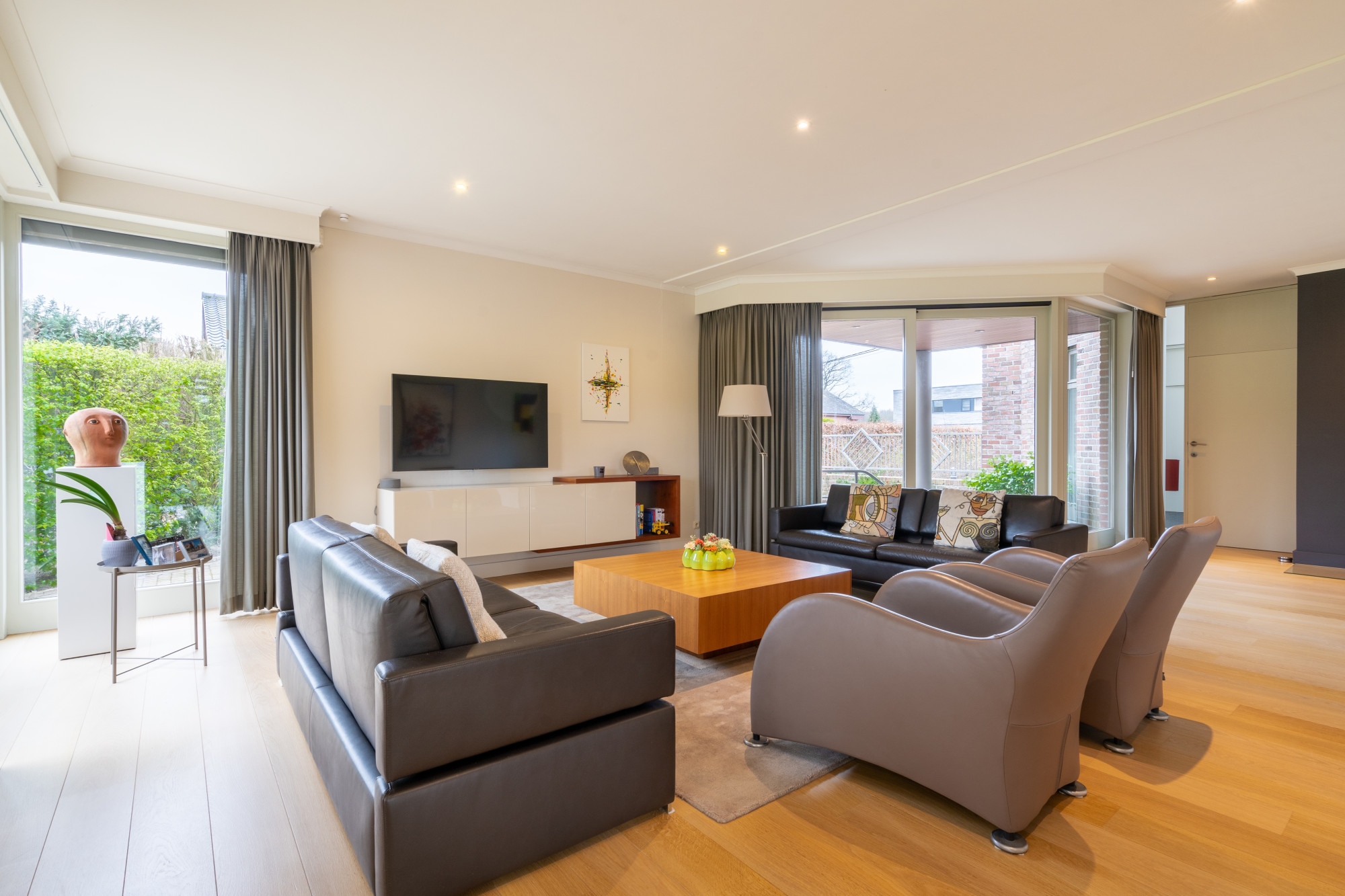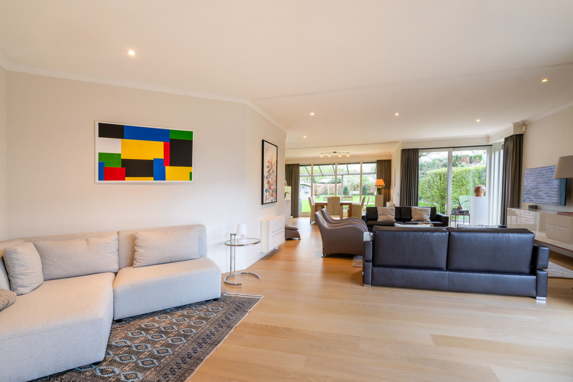 Op het gelijkvloers biedt de woning een inkomhal met vestiaire en een gastentoilet. De riante leefruimte is momenteel ingericht met een lees-, zit- en eethoek en grenst aan de halfopen, volledig geïnstalleerde keuken die uitgeeft op het terras. Bijkomend beschikt het gelijkvloers over een bijkeuken en een wasplaats die beiden voorzien zijn van inbouwkasten. De inpandige garage voor 2 voertuigen geeft mogelijkheden voor een thuiskantoor of een vrij beroep.