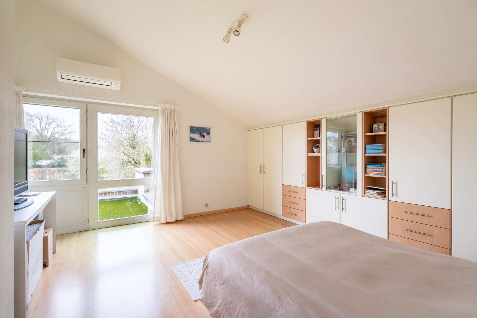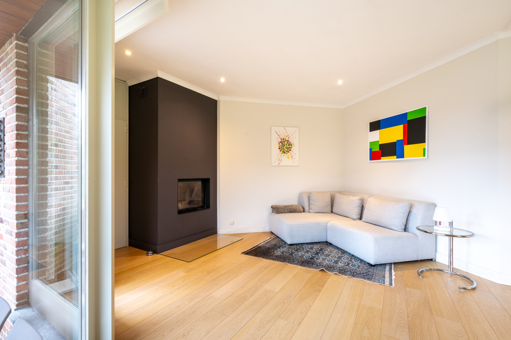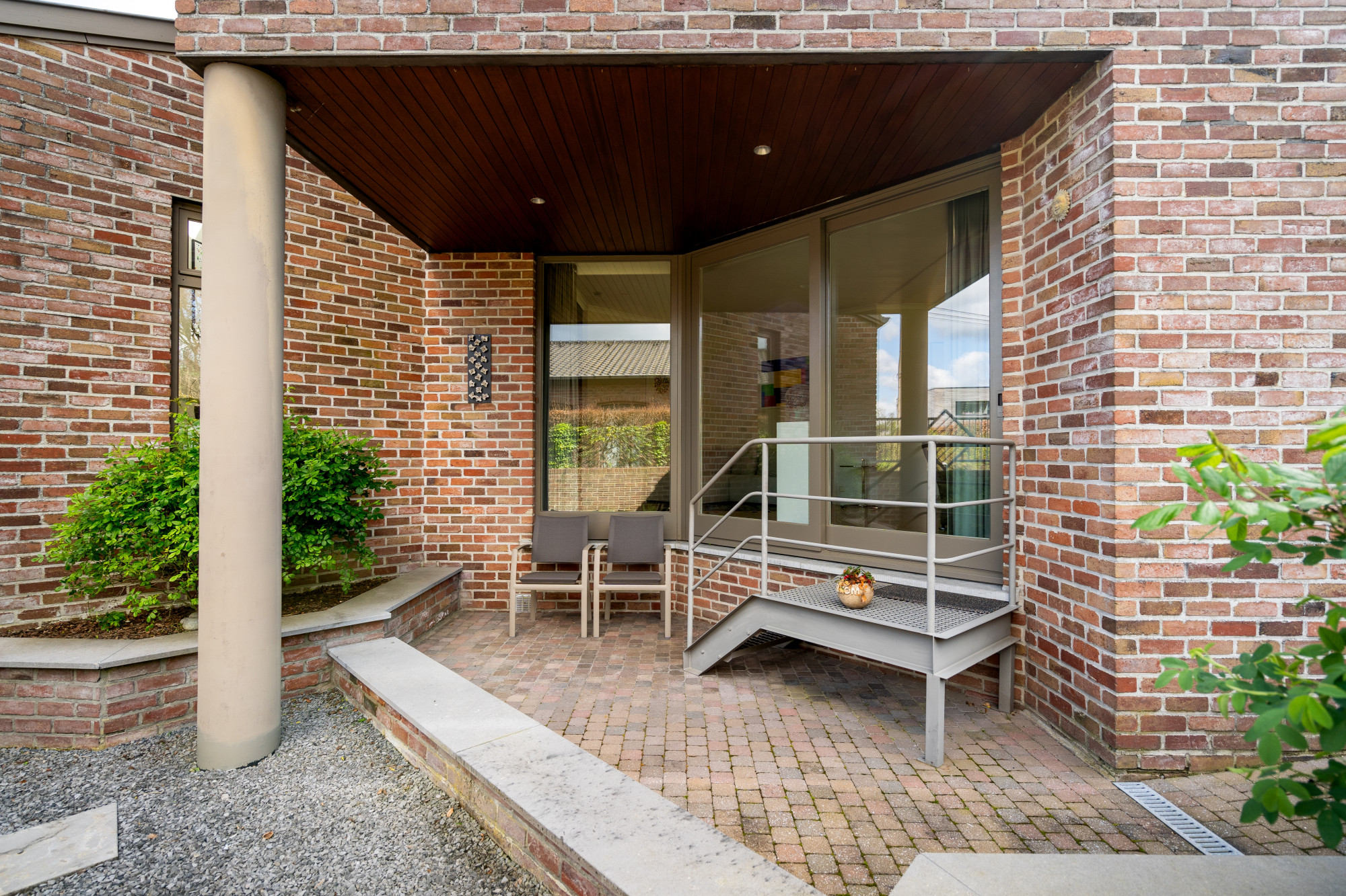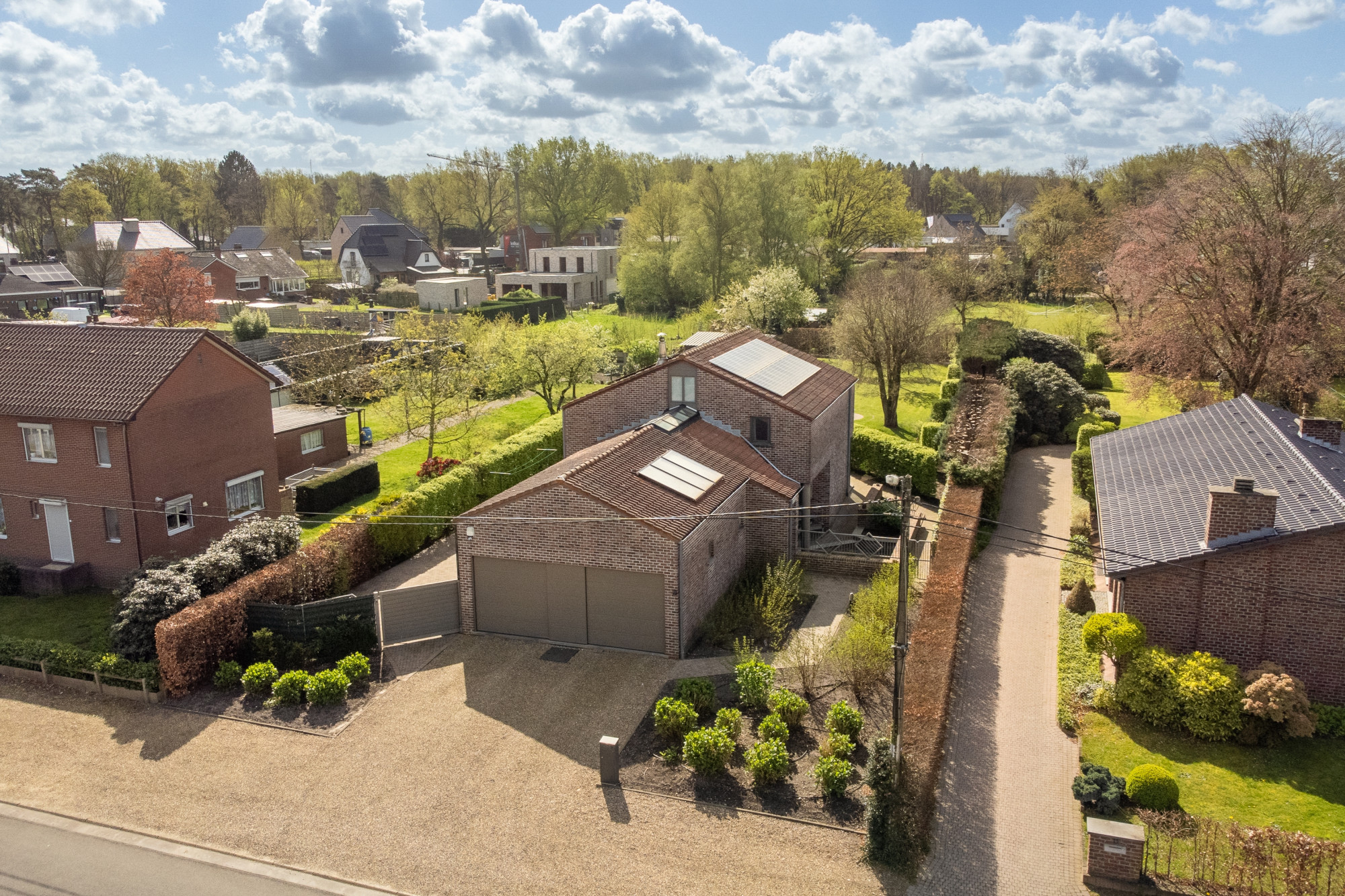 Op het gelijkvloers biedt de woning een inkomhal met vestiaire en een gastentoilet. De riante leefruimte is momenteel ingericht met een lees-, zit- en eethoek en grenst aan de halfopen, volledig geïnstalleerde keuken die uitgeeft op het terras. Bijkomend beschikt het gelijkvloers over een bijkeuken en een wasplaats die beiden voorzien zijn van inbouwkasten. De inpandige garage voor 2 voertuigen geeft mogelijkheden voor een thuiskantoor of een vrij beroep.