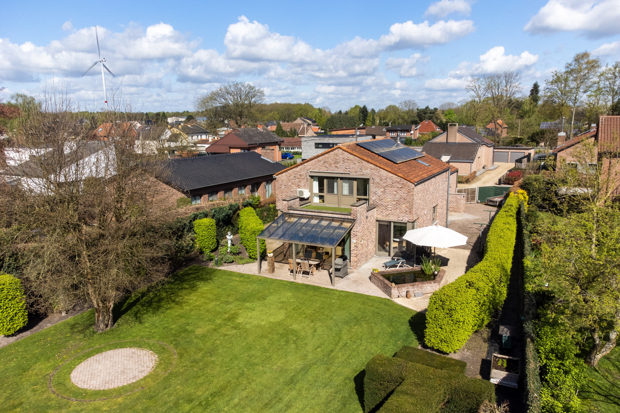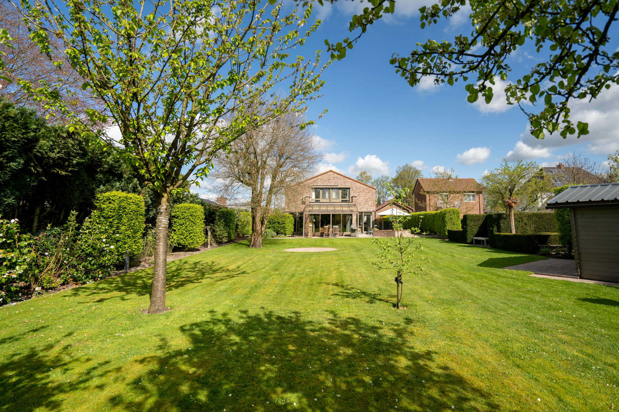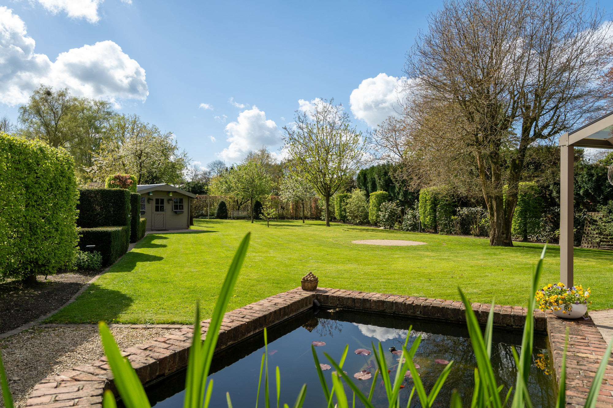 De zuidelijk georiënteerde, aangelegde tuin is volledig omheind en voorzien van een automatische toegangspoort, een tuinhuis, een vijverpartij, verlichting, een bestrating in klinkers en een overdekt terras.