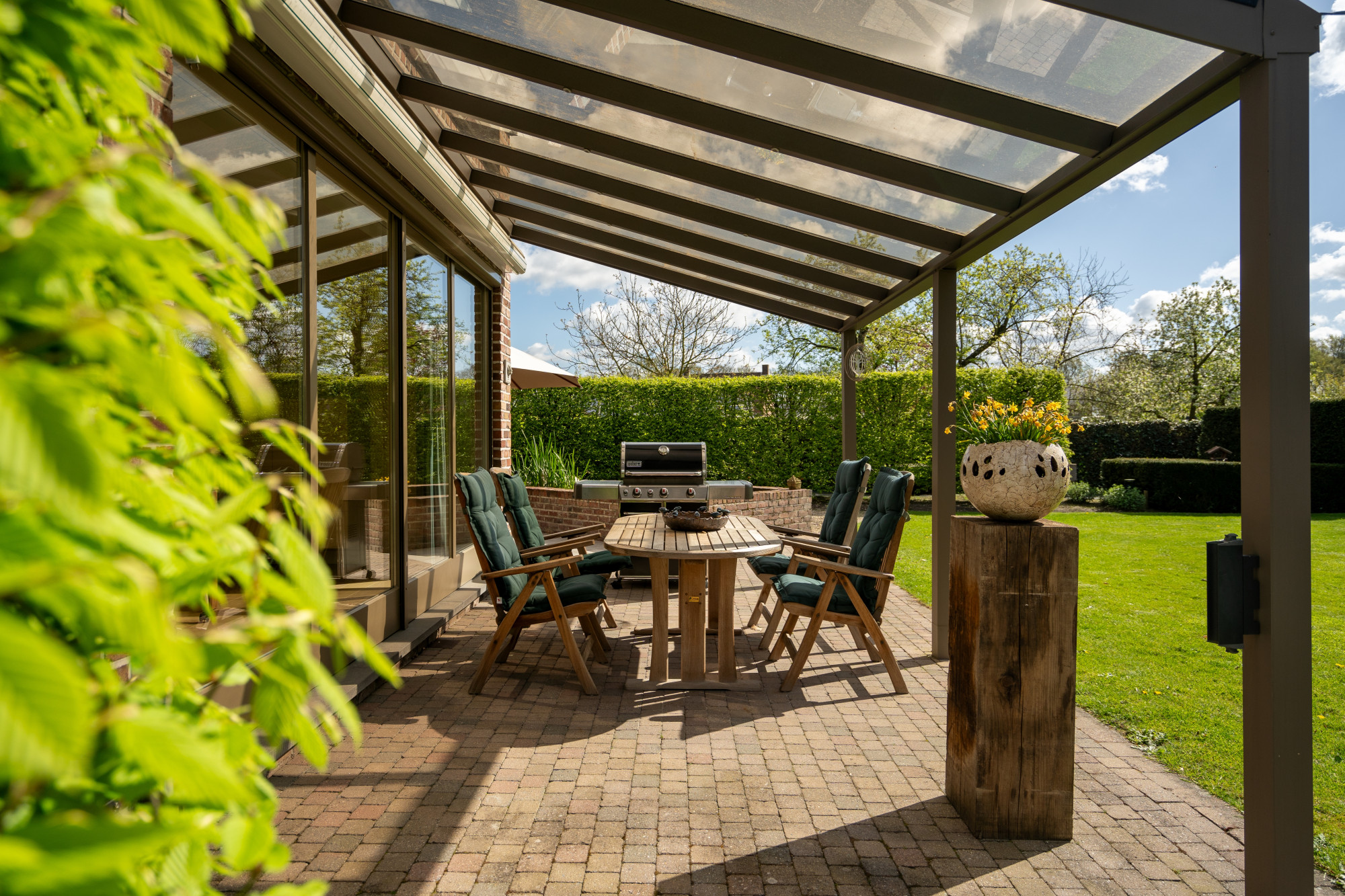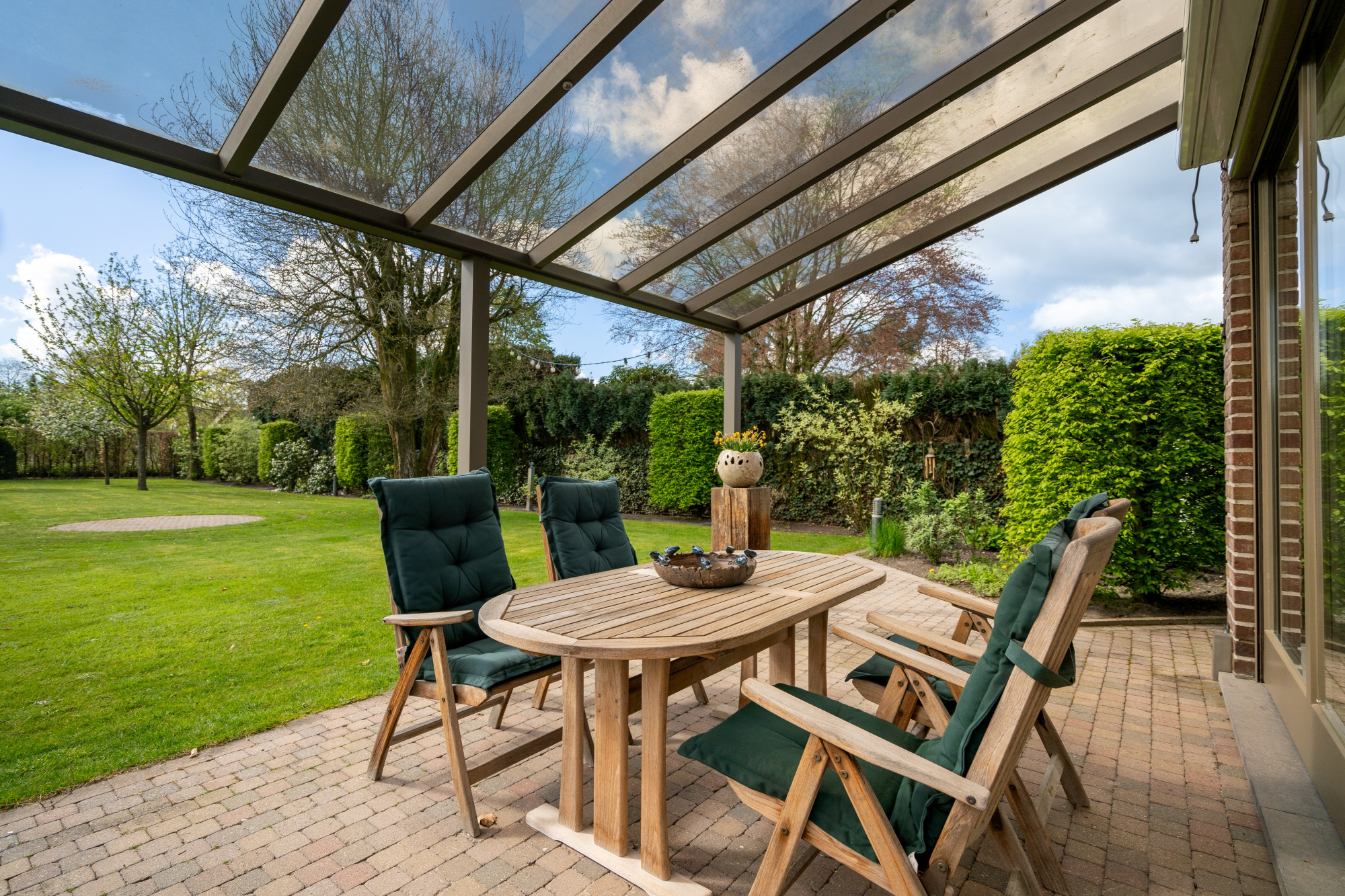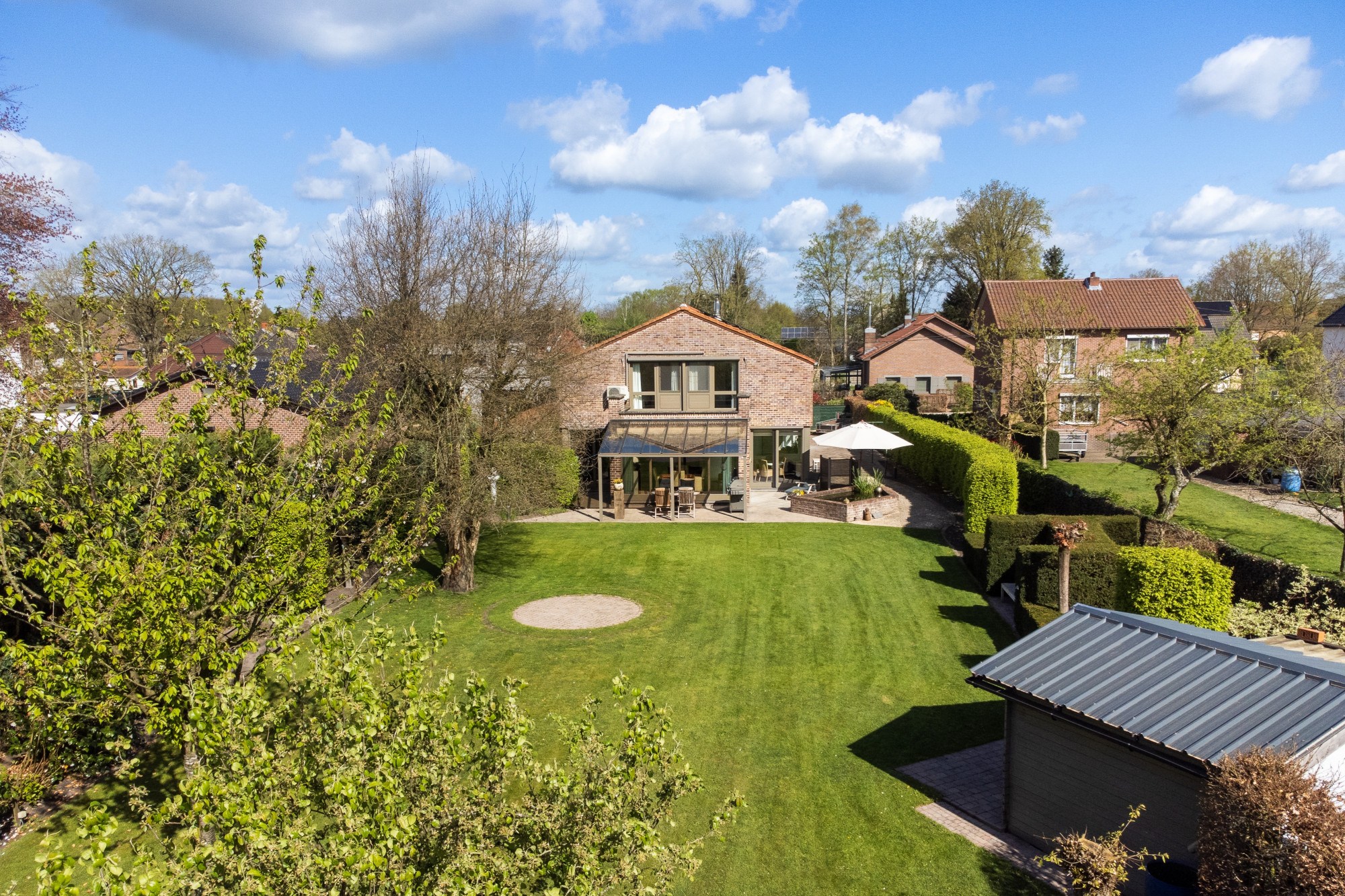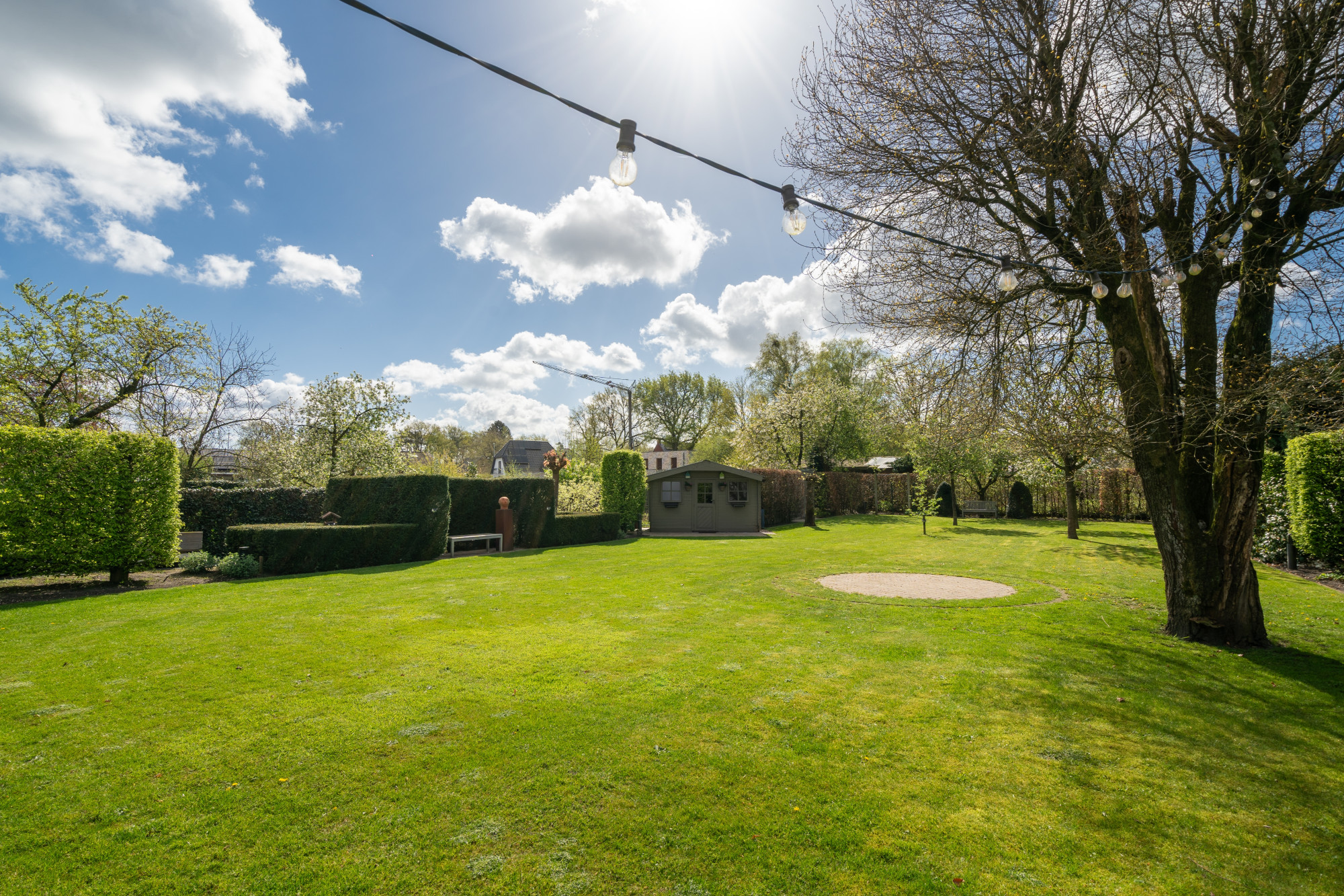 De zuidelijk georiënteerde, aangelegde tuin is volledig omheind en voorzien van een automatische toegangspoort, een tuinhuis, een vijverpartij, verlichting, een bestrating in klinkers en een overdekt terras.