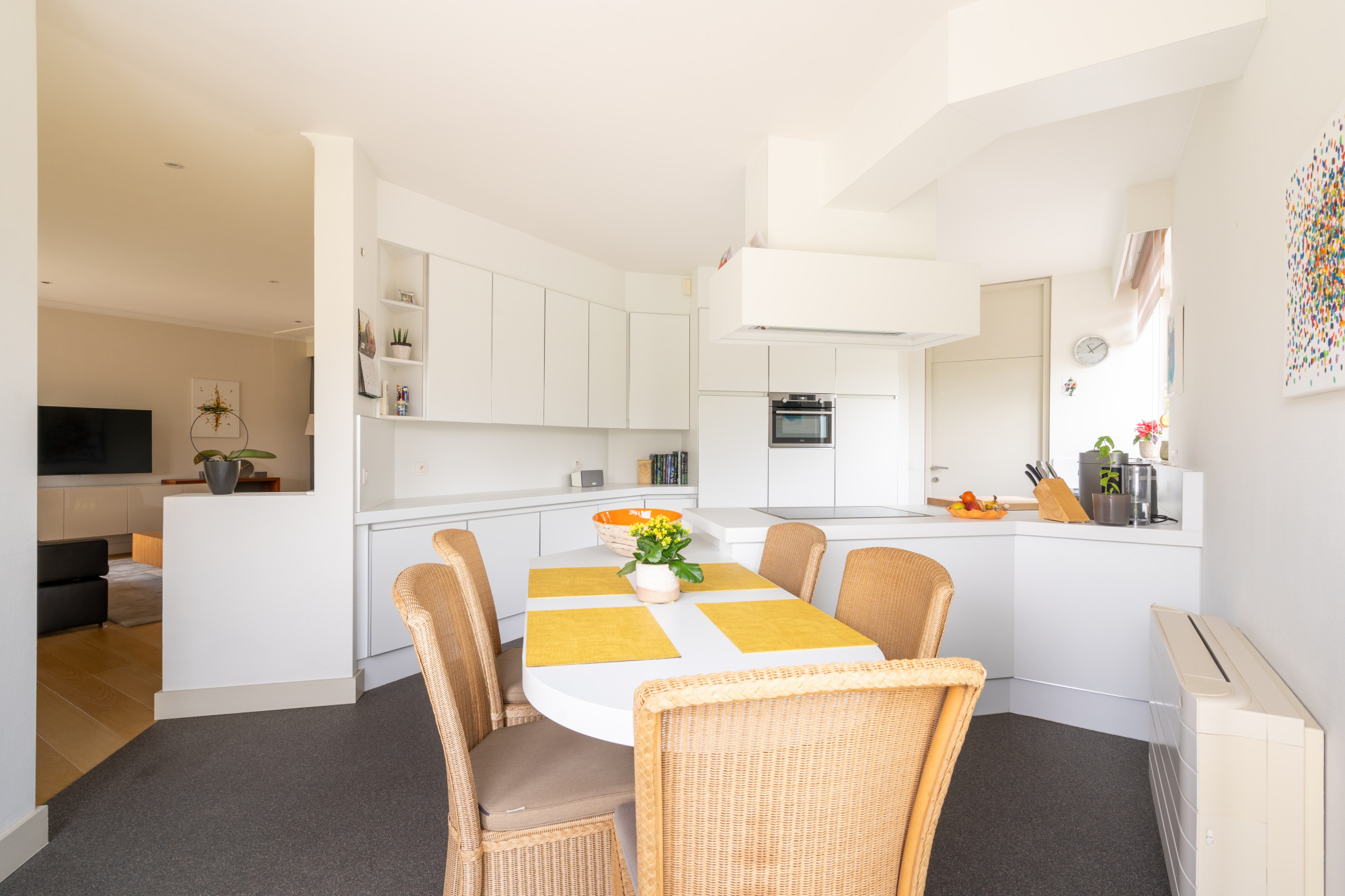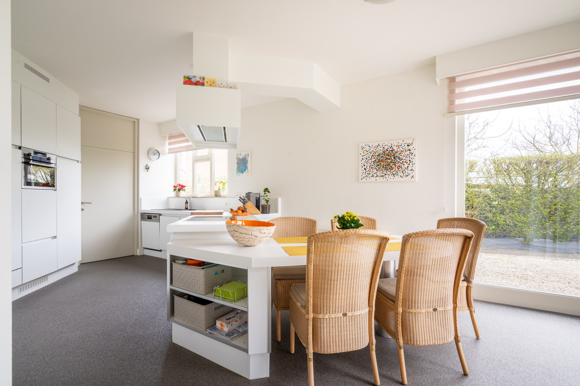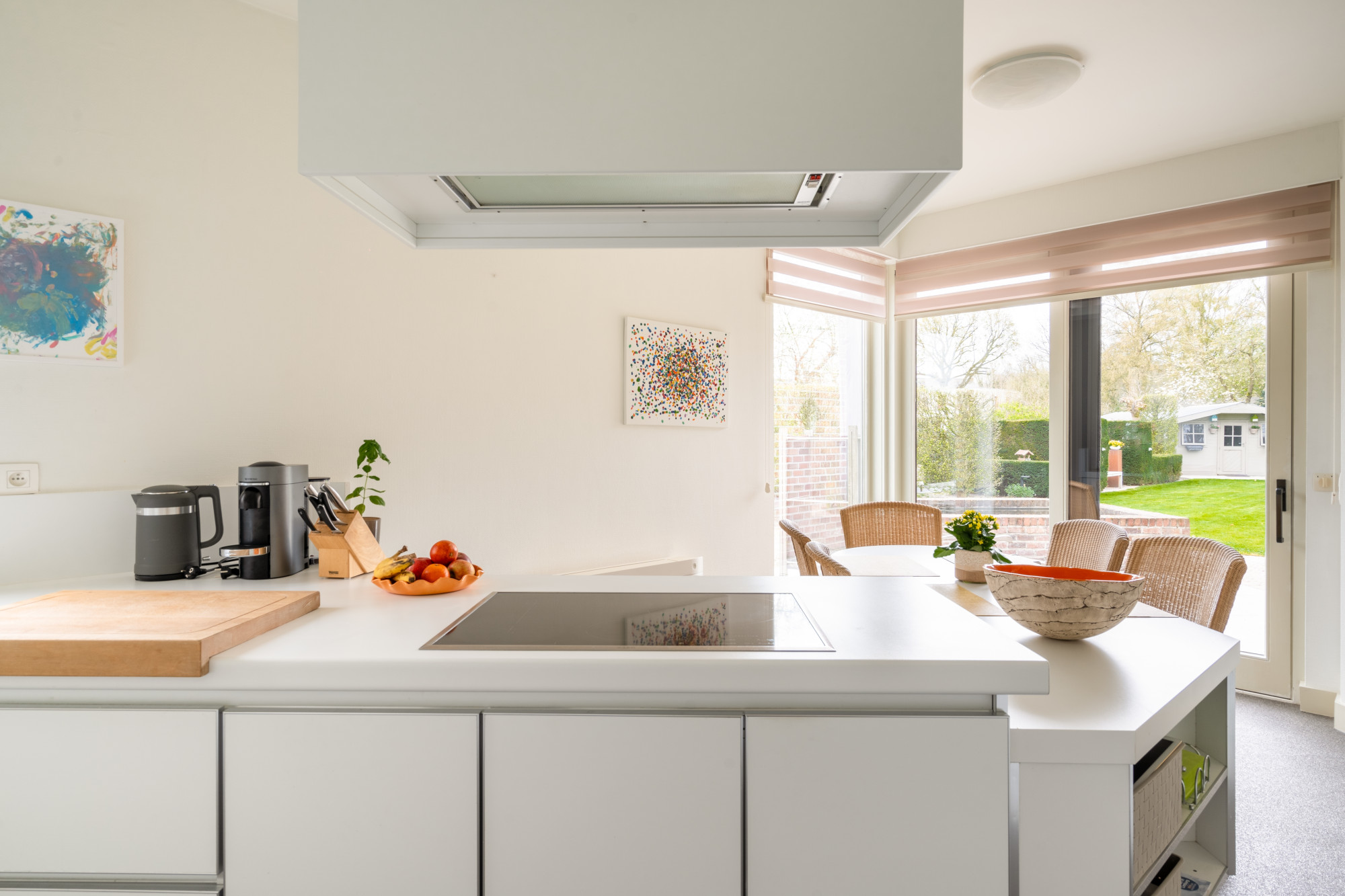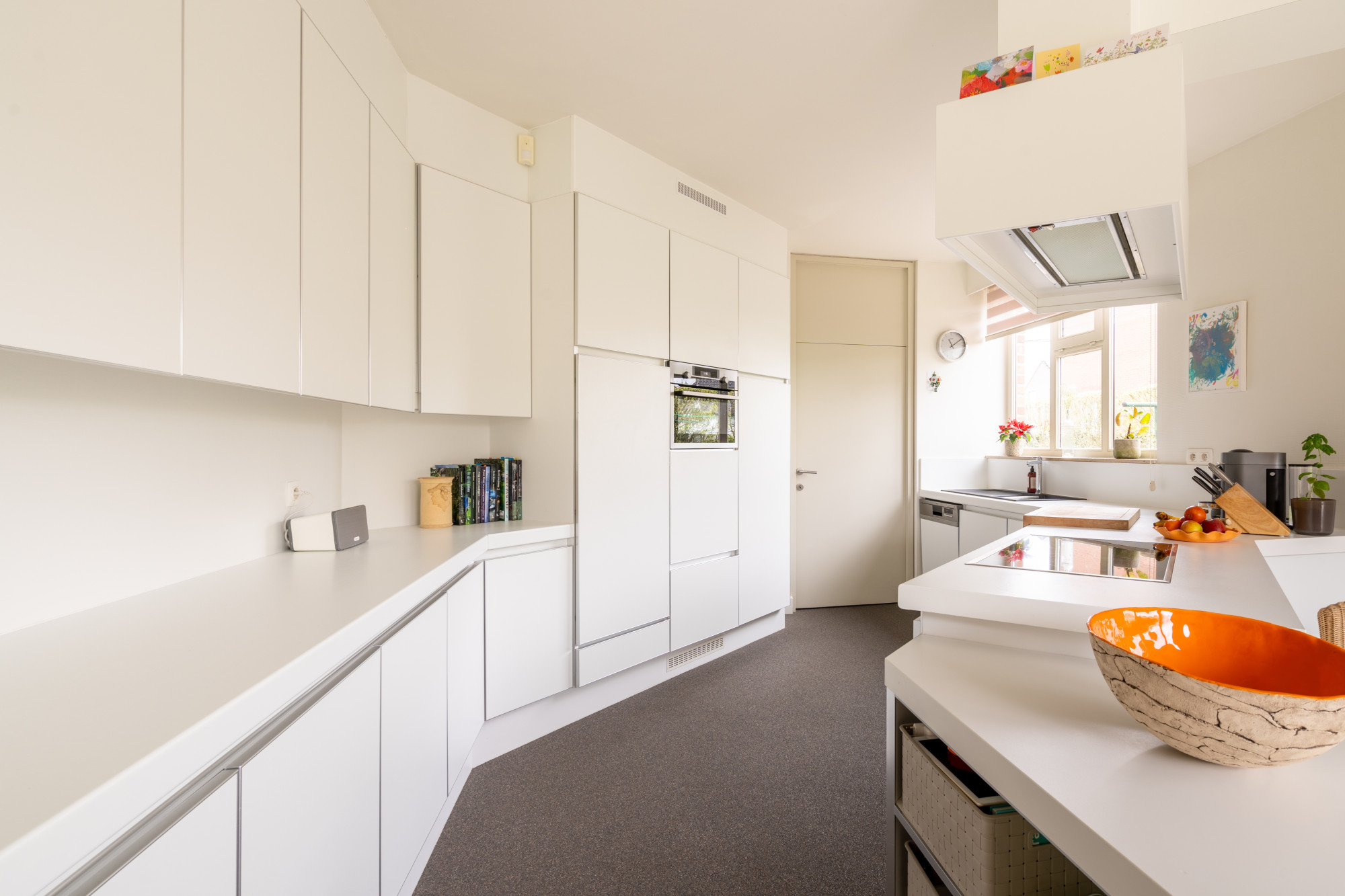De maatwerkkeuken is voorzien van een inductie kookplaat, een afzuigkap, een combi-oven, een vaatwasser, een koelkast en anderhalve spoelbak met verlek.
