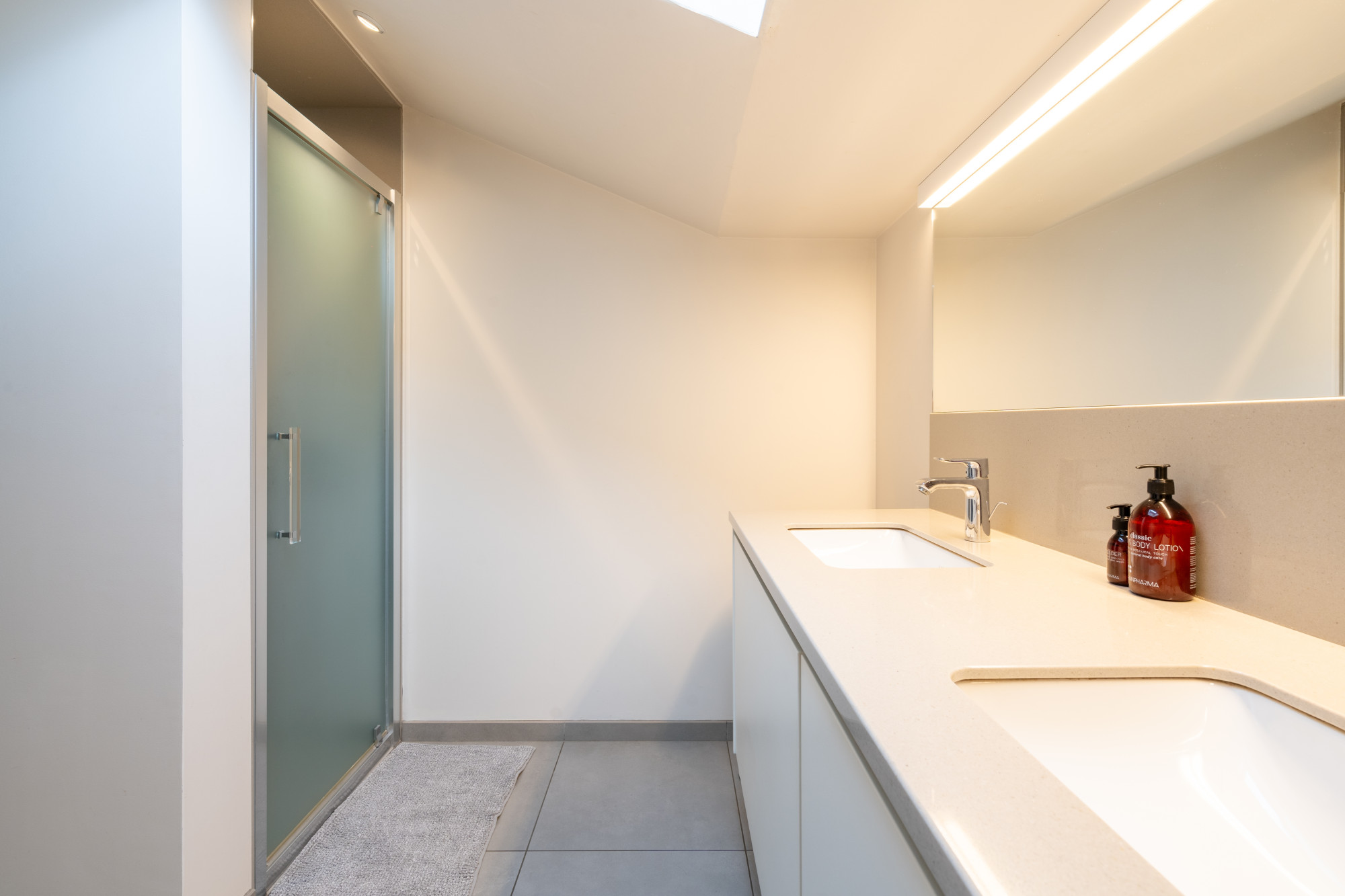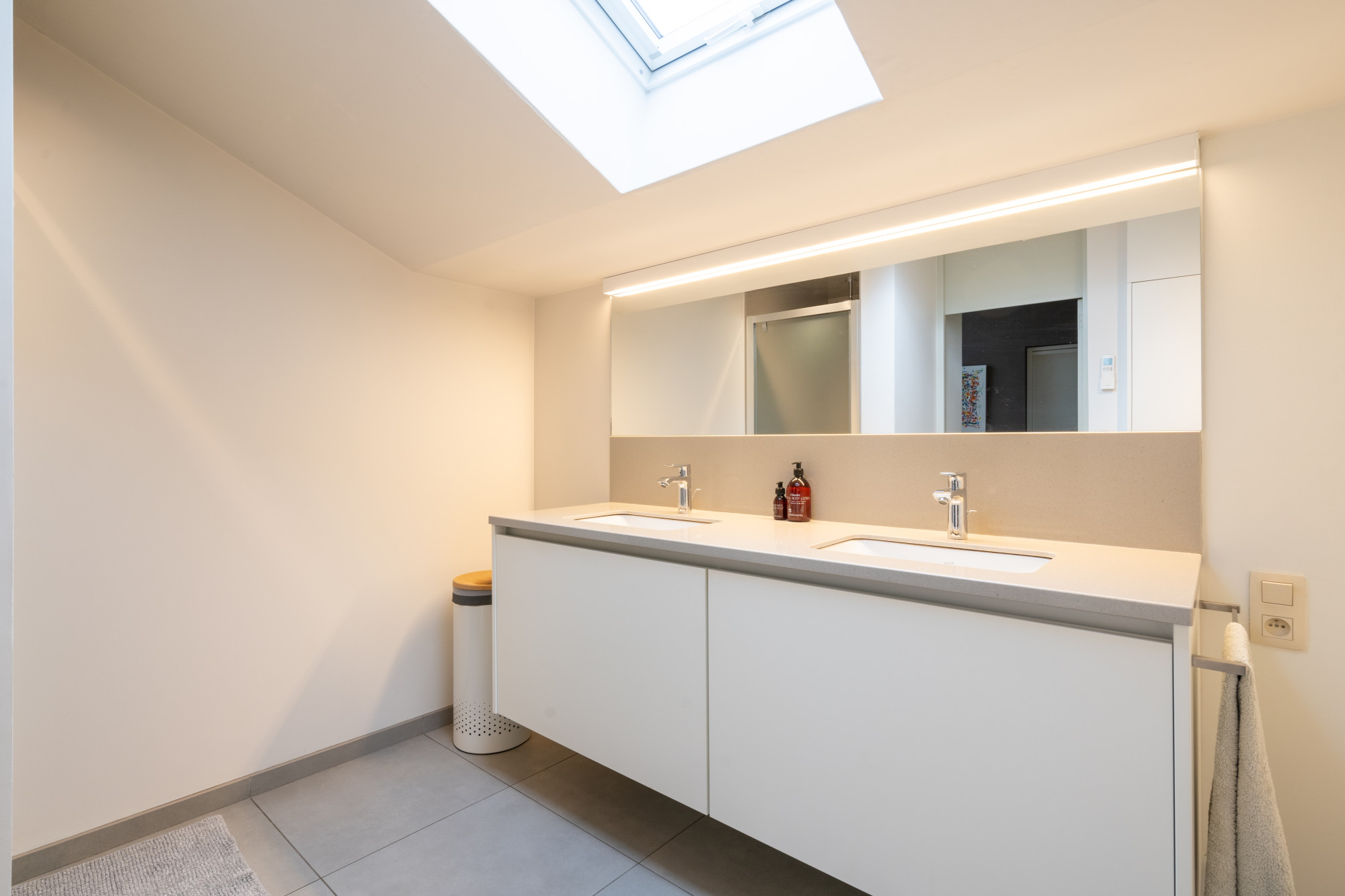 De badkamer is voorzien van een douche en dubbele wastafel. De aansluitingen voor een ligbad werden voorzien.