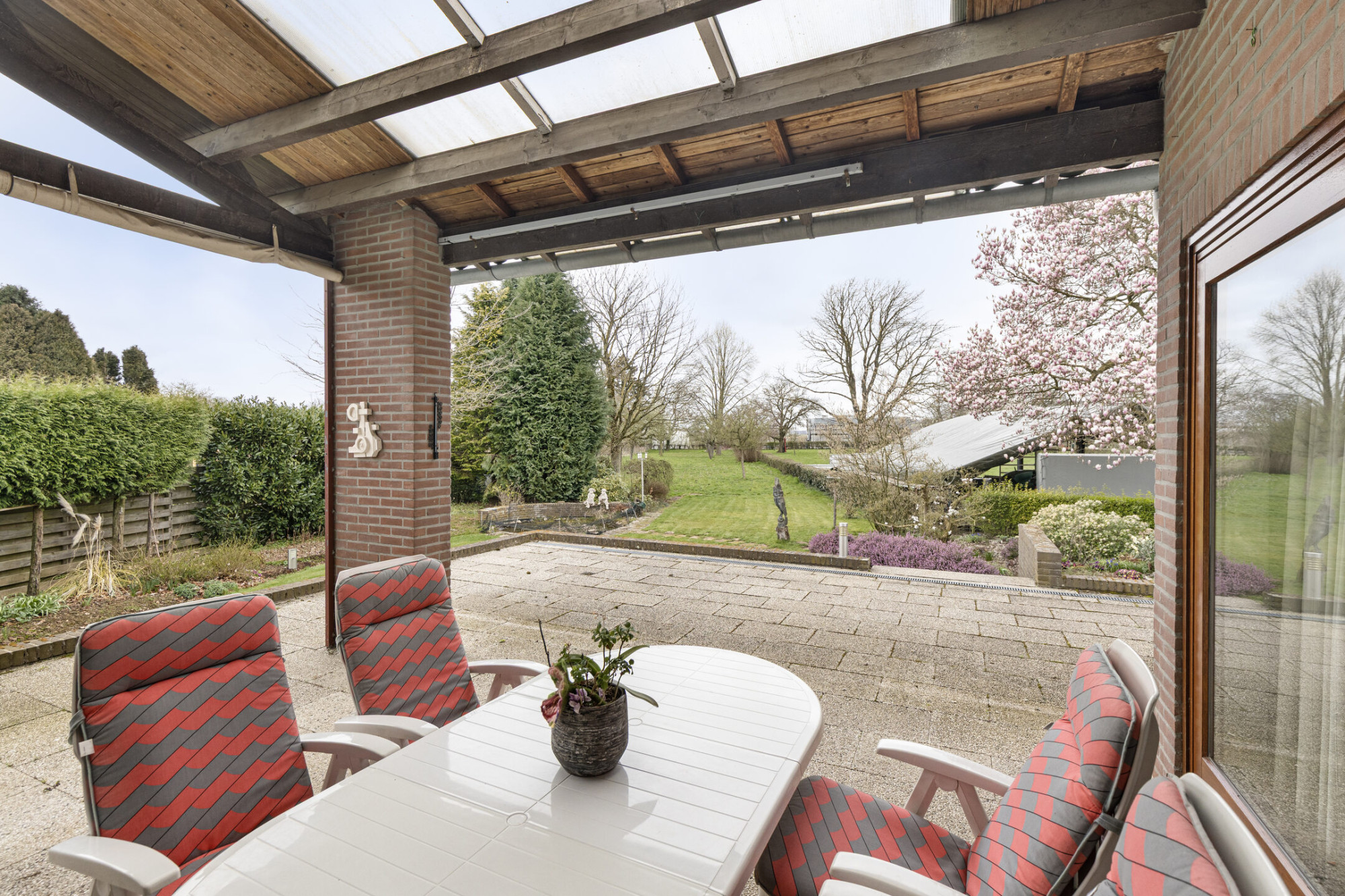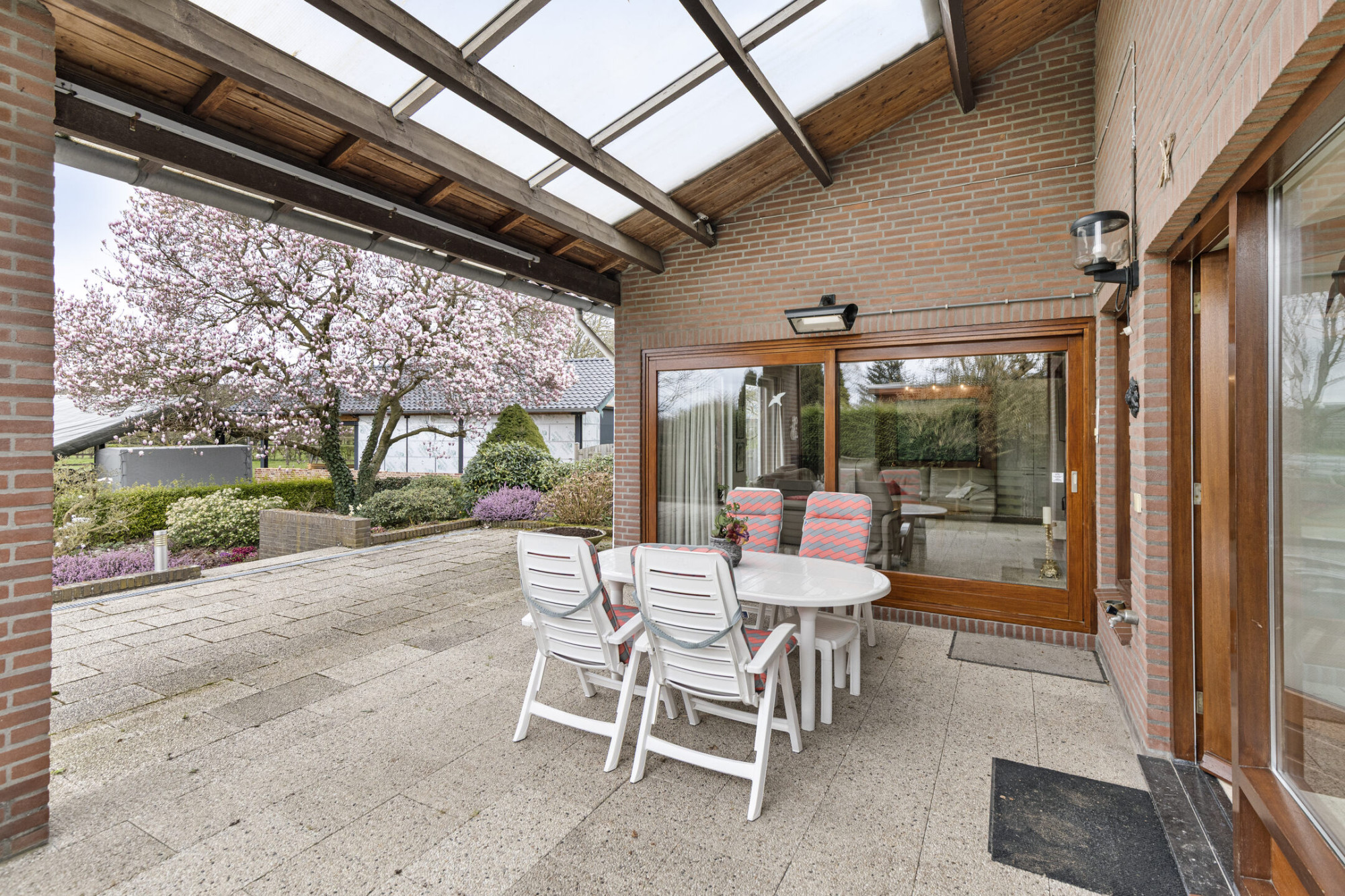 - Het overdekte terras met vrij zicht op de achtertuin is bereikbaar middels een openslaande deur vanuit de keuken en middels een schuifpui vanuit de woonkamer.