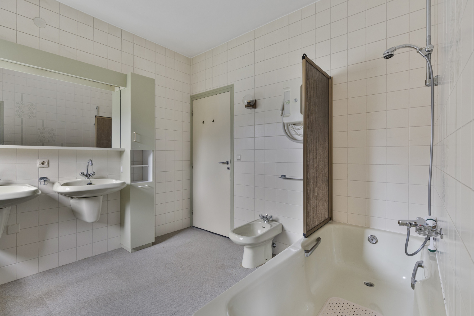 - Betegelde badkamer van ca. 9 m² met ligbad, bidet en dubbele wastafel.
