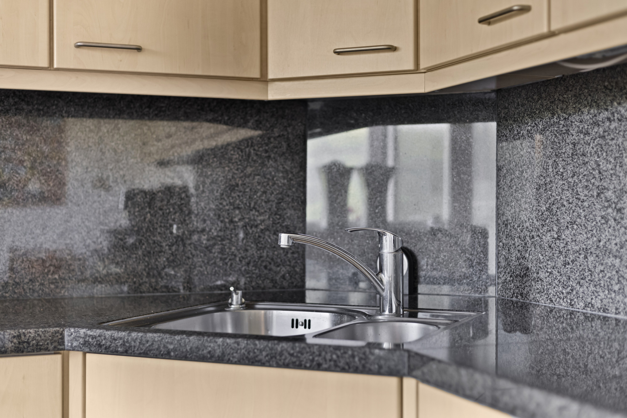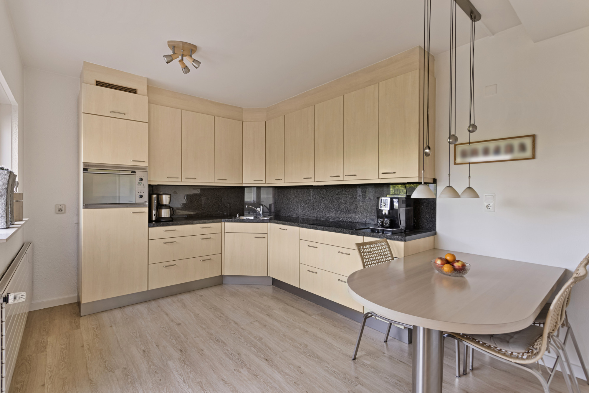 Aan de achterzijde gelegen keuken voorzien van L-vormige inrichting met granieten werkblad, en ingebouwde koelkast, inductiekookplaat, afzuigkap, vaatwasser, boiler en combimagnetron.