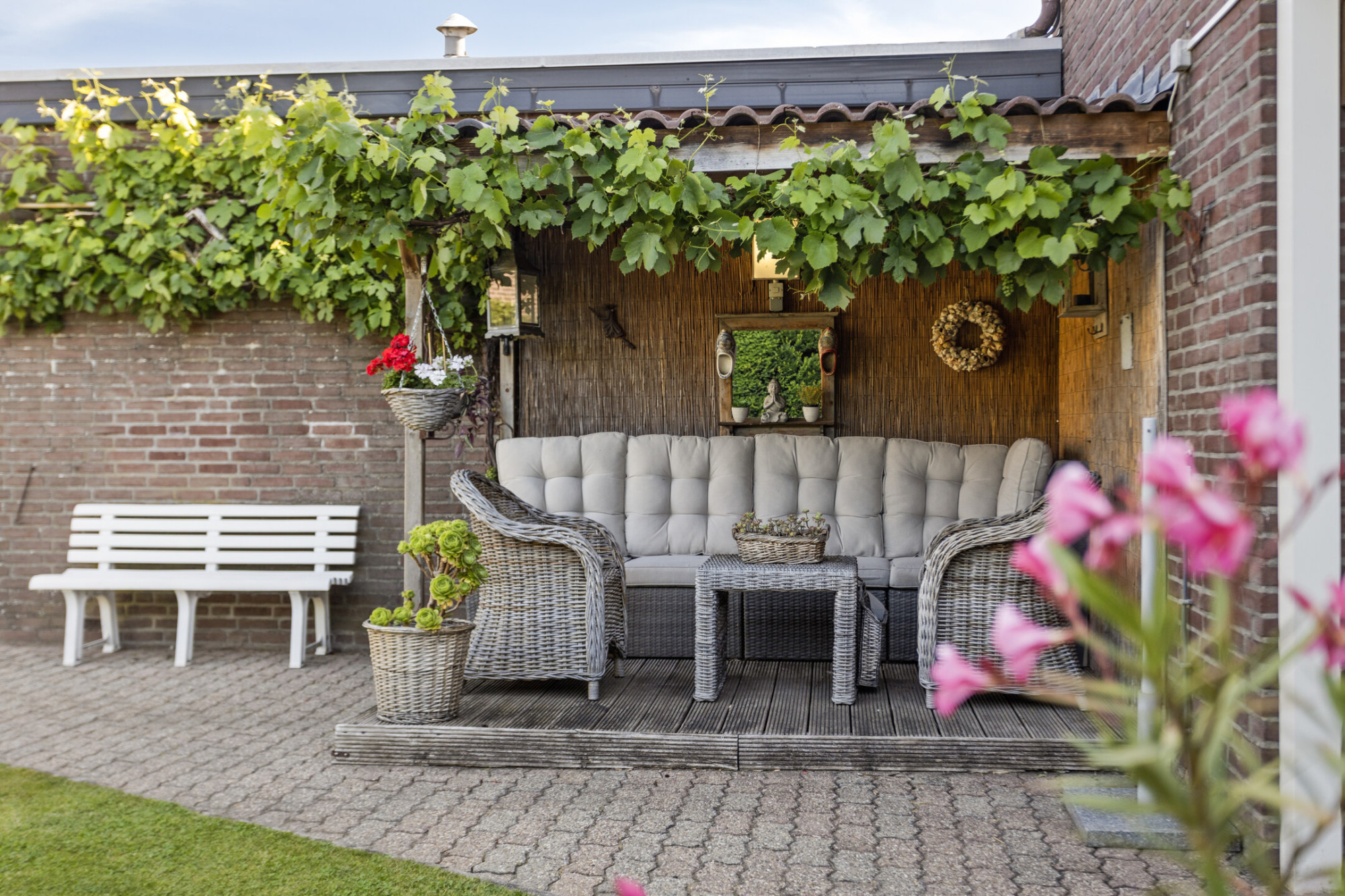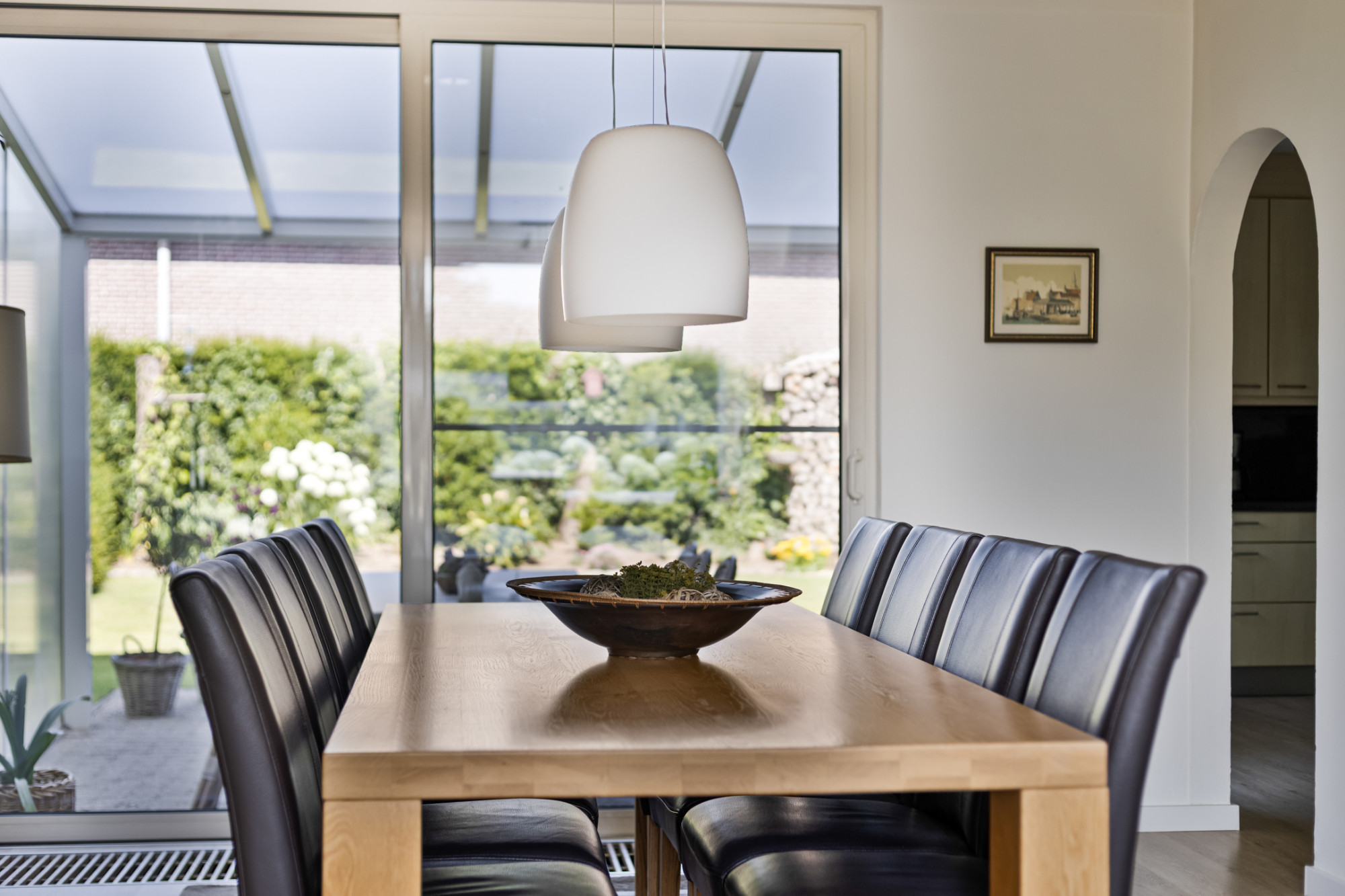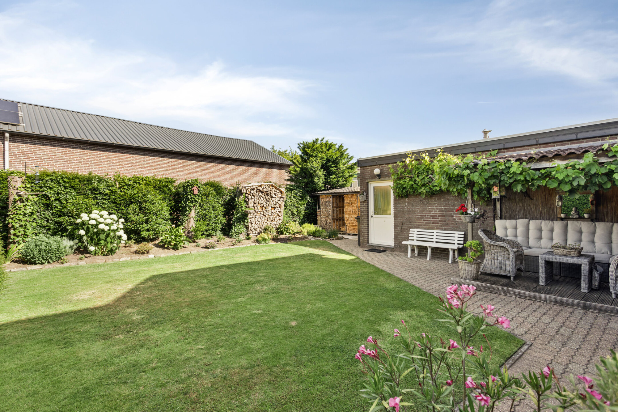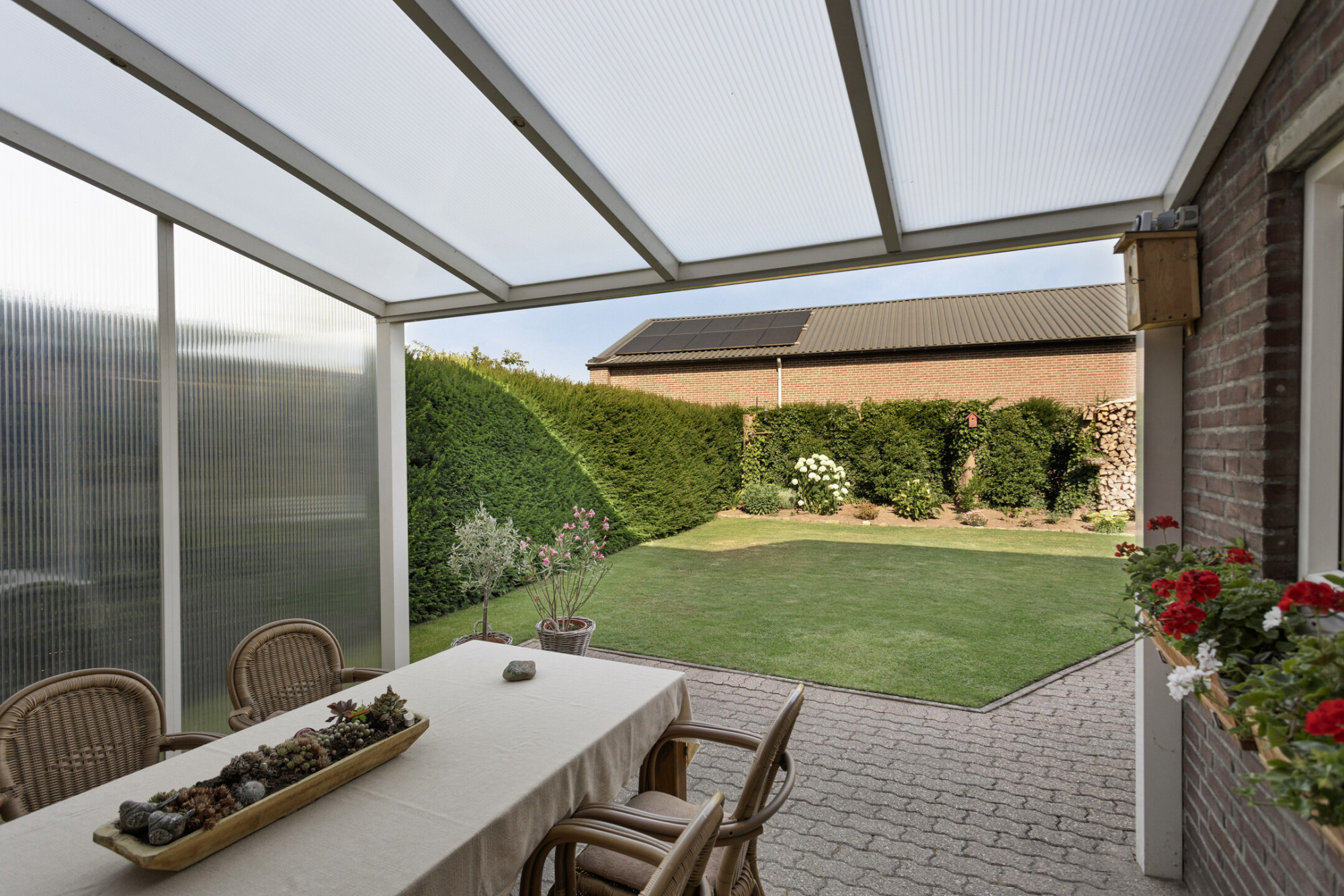 Vanuit de keuken toegang tot de achtertuin met grote terrasoverkapping en fraai aangelegde achtertuin met ene goede verhouding tussen beplanting en bestrating.