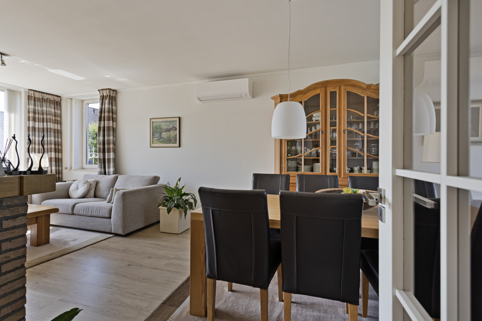 L-vormige woonkamer met houtkachel en airco (zowel koelen als verwarmen).