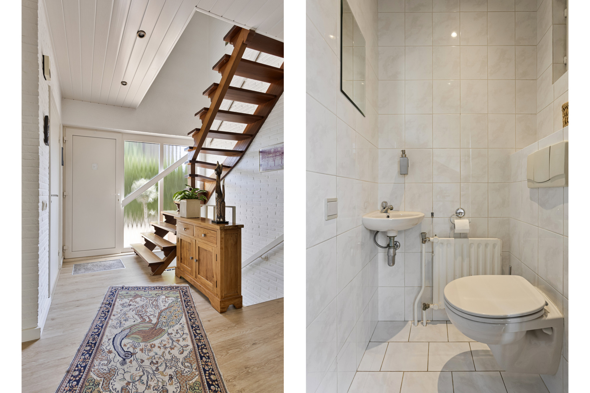 Entreehal met toiletruimte wandcloset, hoekfontein), meterkast en trap naar de kelder. In de kelder bevindt zich de aansluiting/afvoer voor de wasmachine.