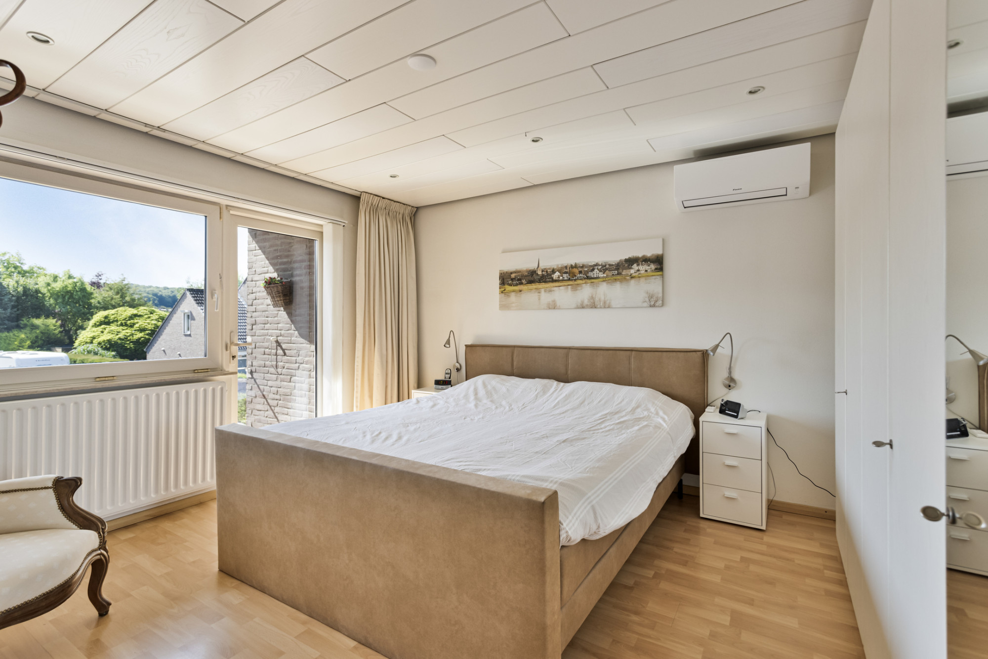 Overloop. Masterbedroom met balkon aan de voorzijde en airco. Tweede slaapkamer aan de voorzijde. Twee slaapkamers aan de achterzijde. Badkamer voorzien van douchecabine, ligbad, wandcloset, wastafelmeubel, handdoekradiator en mechanische ventilatie.