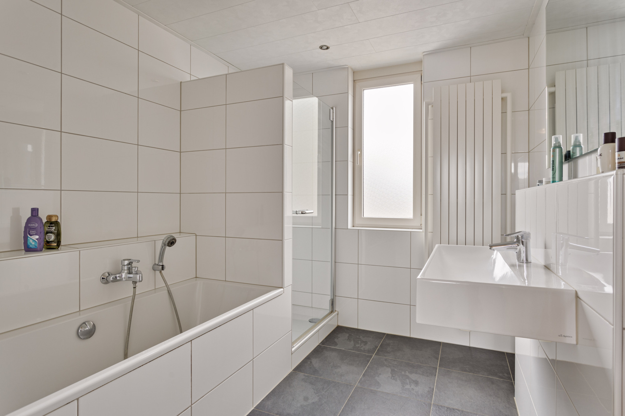 Eerste verdieping: via de overloop zijn twee slaapkamers (origineel 3 slaapkamers) bereikbaar: een compacte kamer (nu kantoortje) en een royale slaapkamer (22 m²). De royale slaapkamer is eenvoudig weer op te delen in twee kamers van 10 m². en 12 m2. De deuren op de overloop zijn nog intact. Er hoeft dus alleen een muurtje geplaatst te worden. Verder bevindt zich op deze verdieping nog een ruime geheel betegelde badkamer (2005) met douche, ligbad, wastafel en design radiator.
