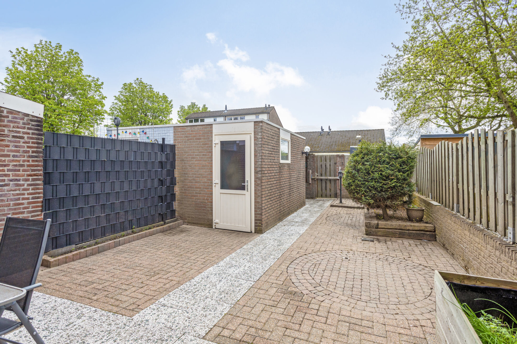 De tuin op het zuiden is onderhoudsarm aangelegd. De ruime berging heeft een oppervlakte van 9 m². Aan de berging is nog een overkapping gerealiseerd. Via het gezamenlijke achterpad is een parkeerplaats bereikbaar met ruim voldoende parkeerplaatsen.