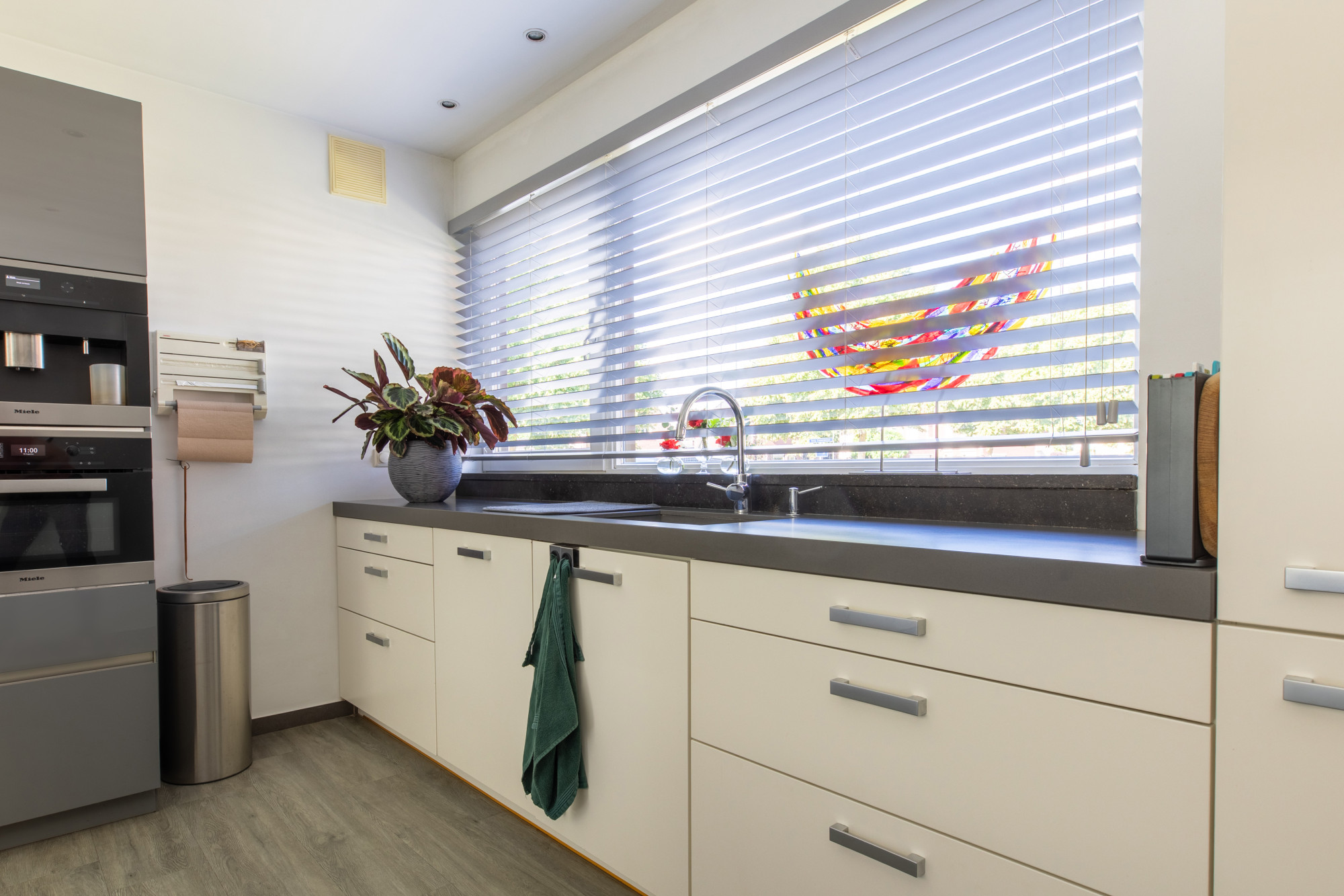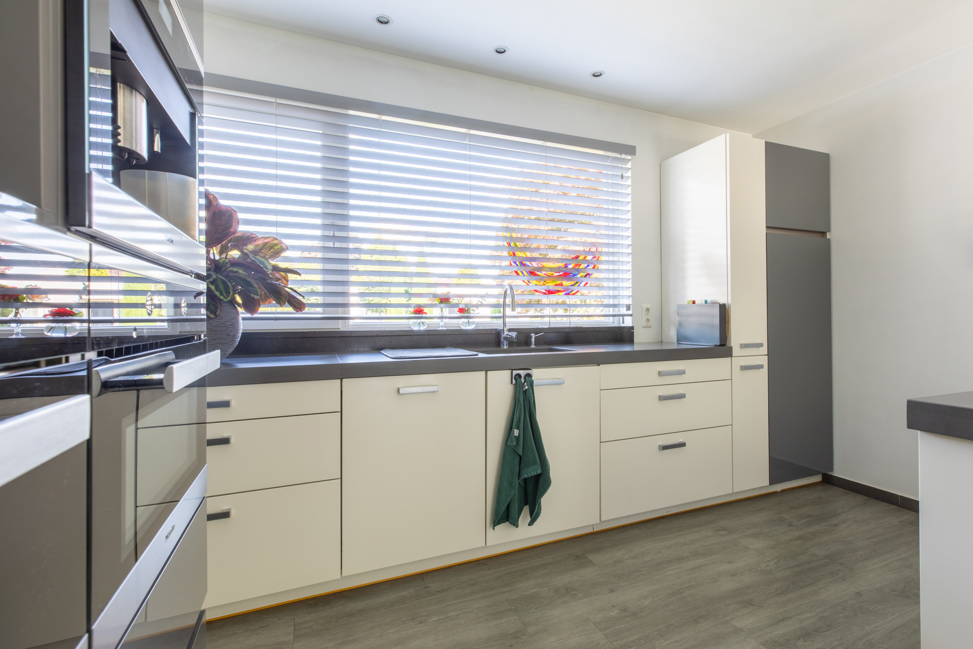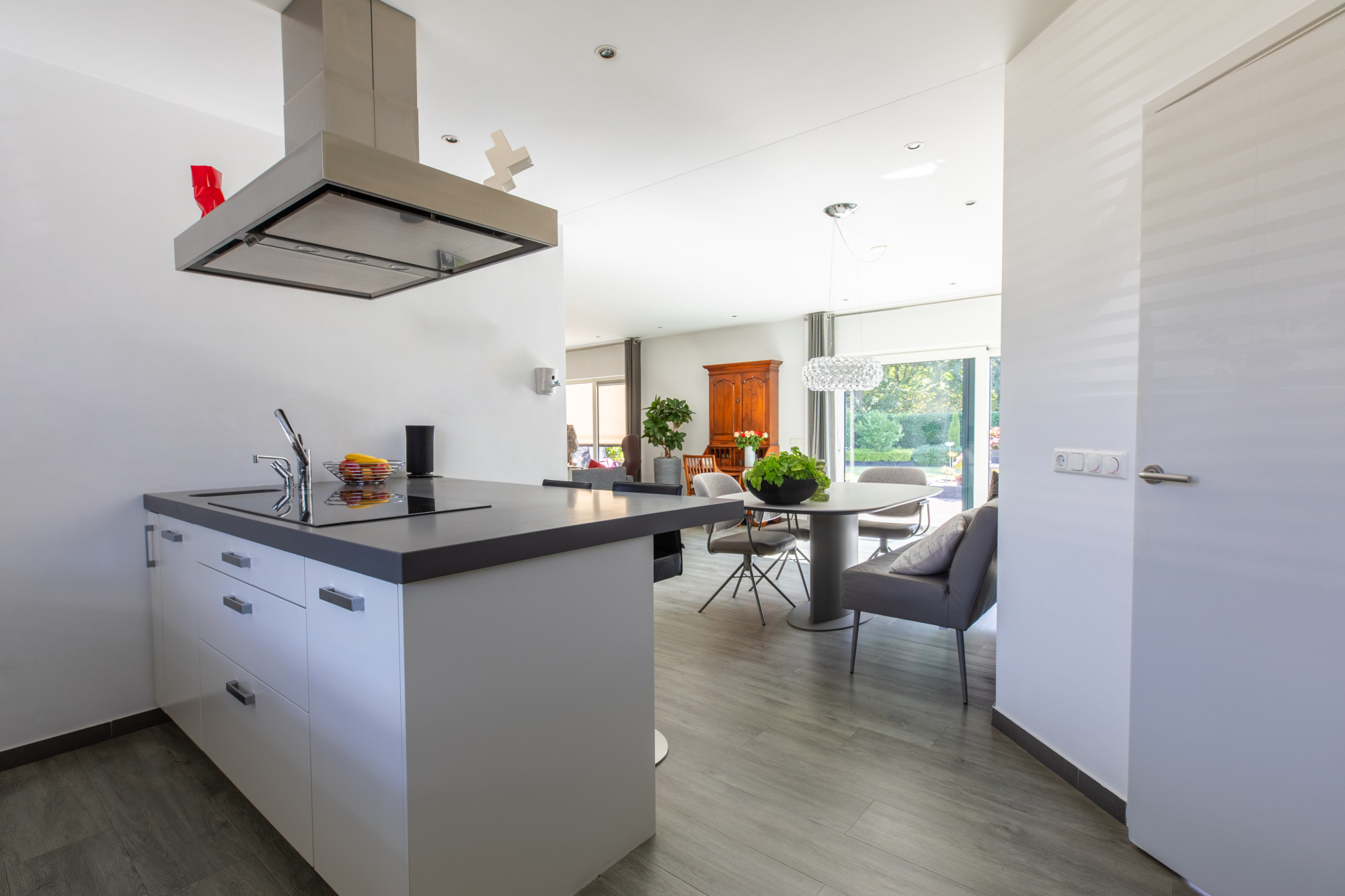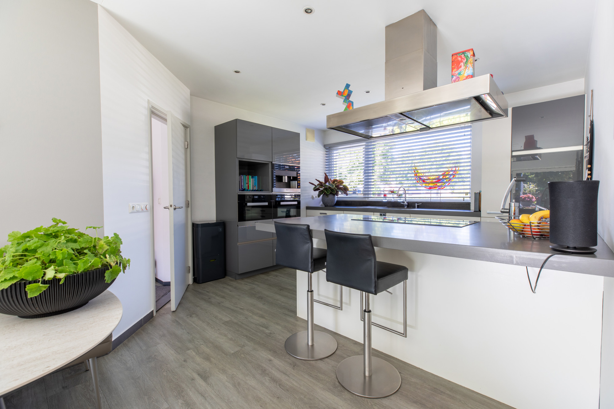 Bij binnenkomst via de hal heeft u toegang tot de woonkamer, het toilet, de meterkast en de slaapkamers, en bereikt u tevens de trap naar het souterrain. De ruime woonkamer is licht en comfortabel, met een fijne indeling voor een royale zithoek en eethoek. De open keuken met kookeiland is voorzien van diverse inbouwapparatuur, waaronder een combi-oven, stoomoven, koffiezetapparaat, vaatwasser en inductiekookplaat. Alles is netjes afgewerkt en praktisch ingedeeld. De leefruimtes zijn voorzien van vloerverwarming, met uitzondering van de slaapkamers.