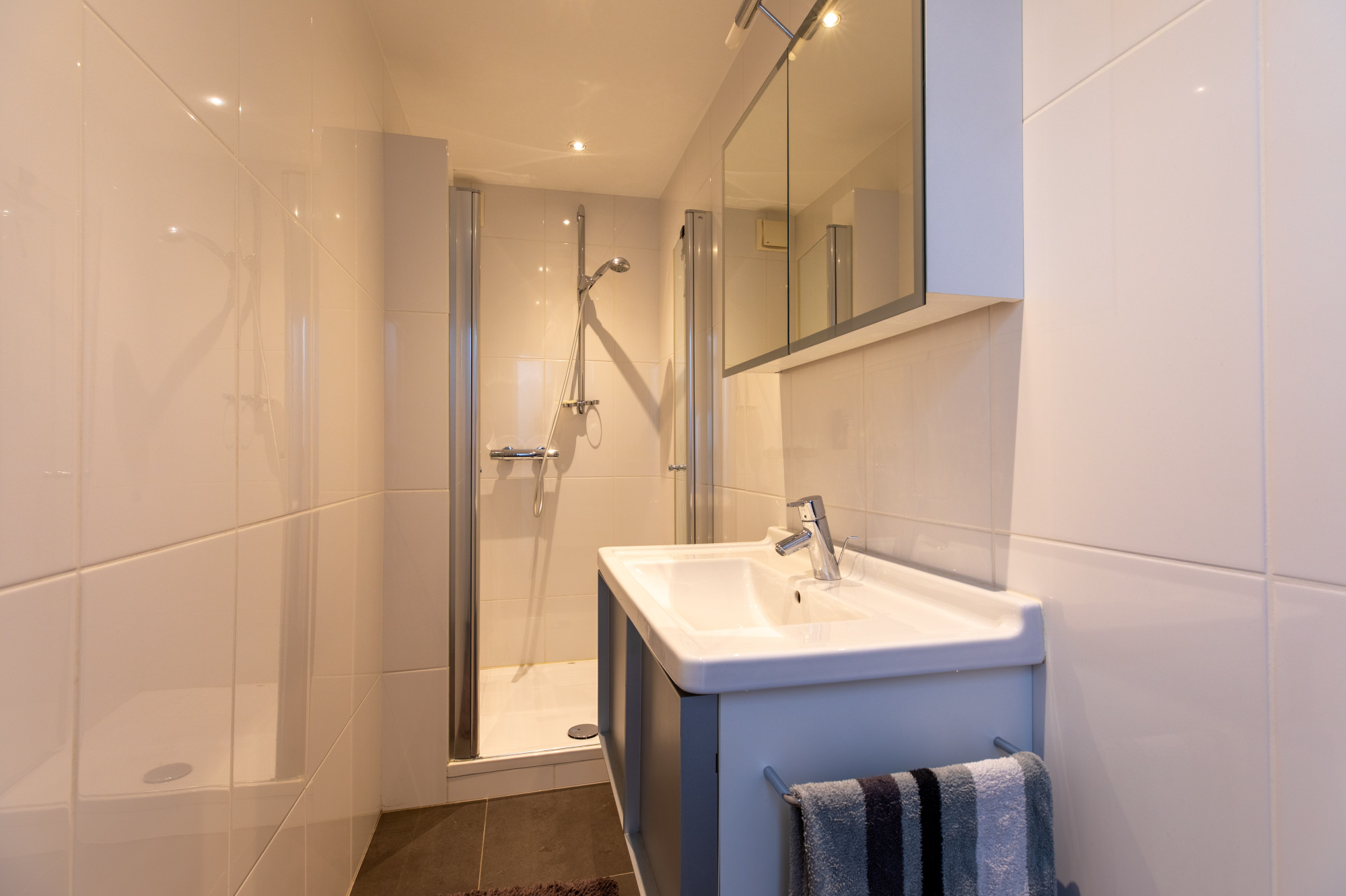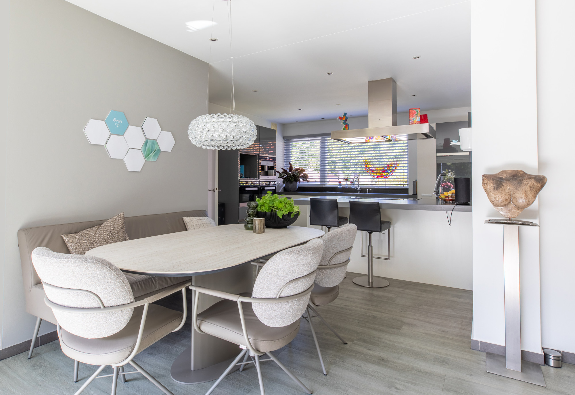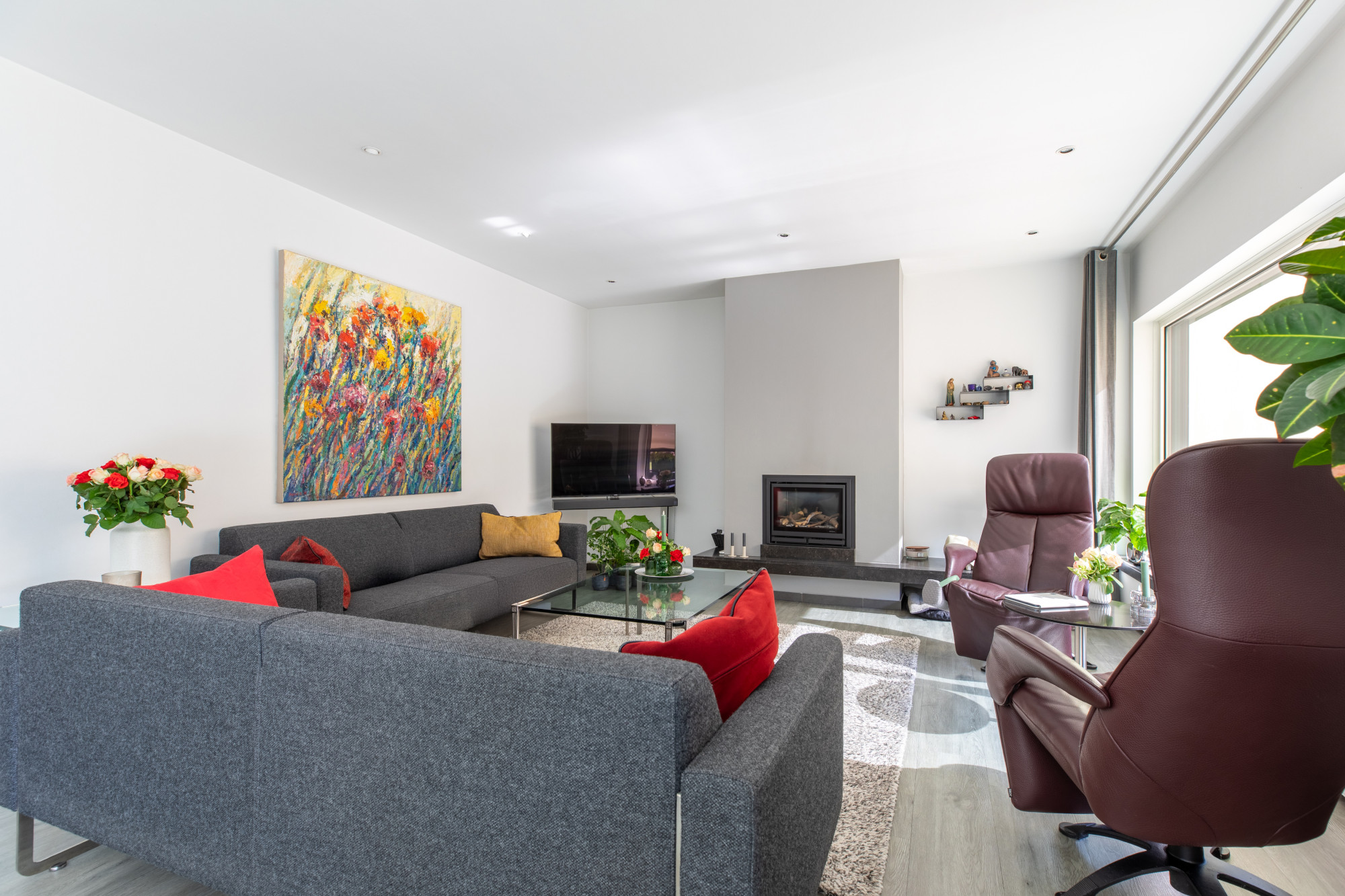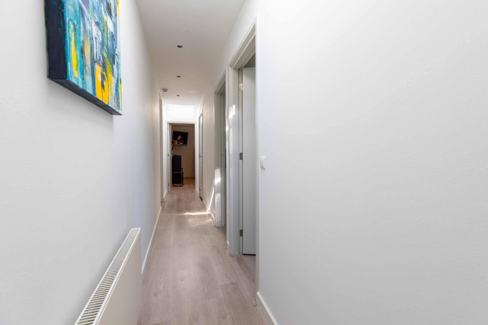 Bij binnenkomst via de hal heeft u toegang tot de woonkamer, het toilet, de meterkast en de slaapkamers, en bereikt u tevens de trap naar het souterrain. De ruime woonkamer is licht en comfortabel, met een fijne indeling voor een royale zithoek en eethoek. De open keuken met kookeiland is voorzien van diverse inbouwapparatuur, waaronder een combi-oven, stoomoven, koffiezetapparaat, vaatwasser en inductiekookplaat. Alles is netjes afgewerkt en praktisch ingedeeld. De leefruimtes zijn voorzien van vloerverwarming, met uitzondering van de slaapkamers.