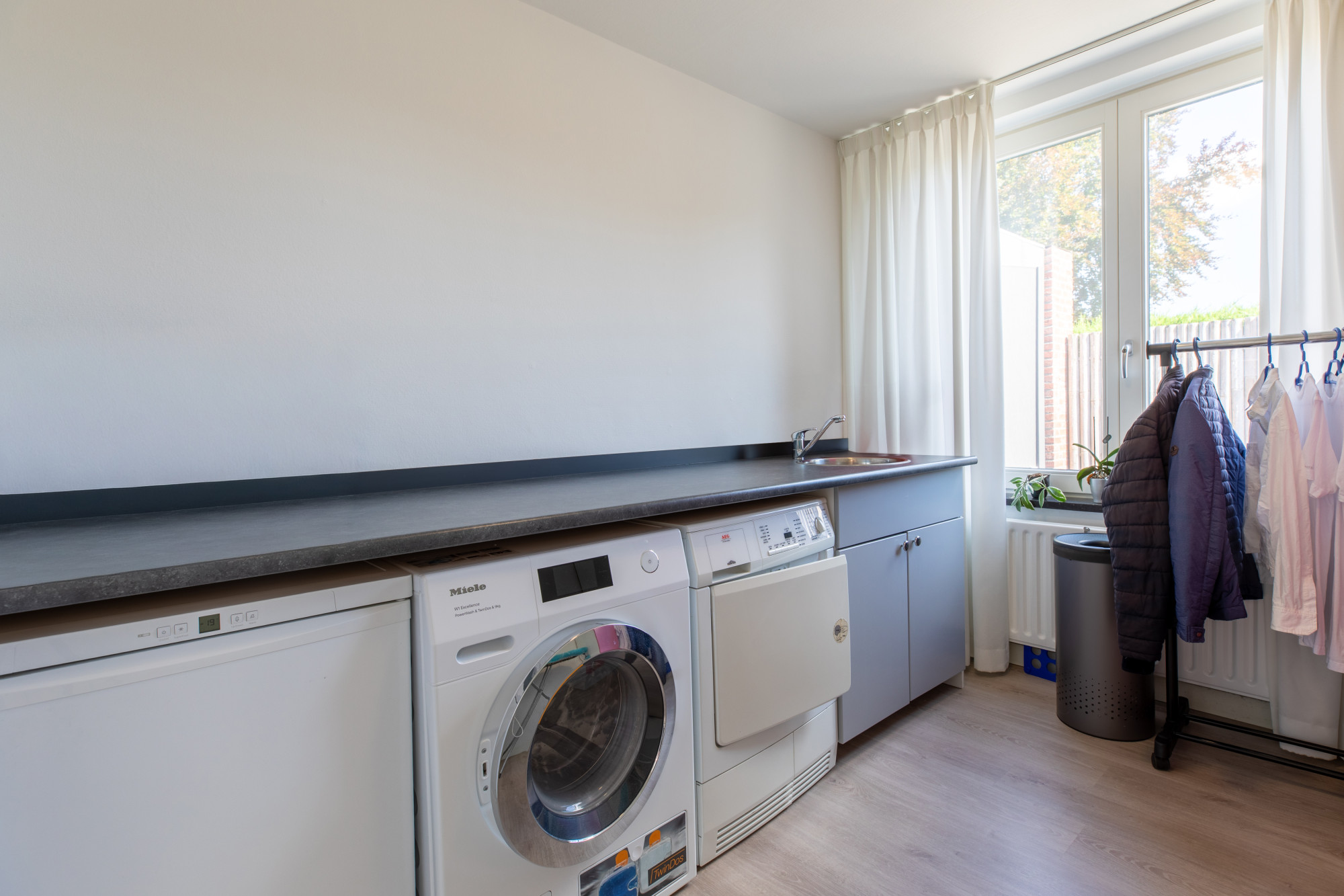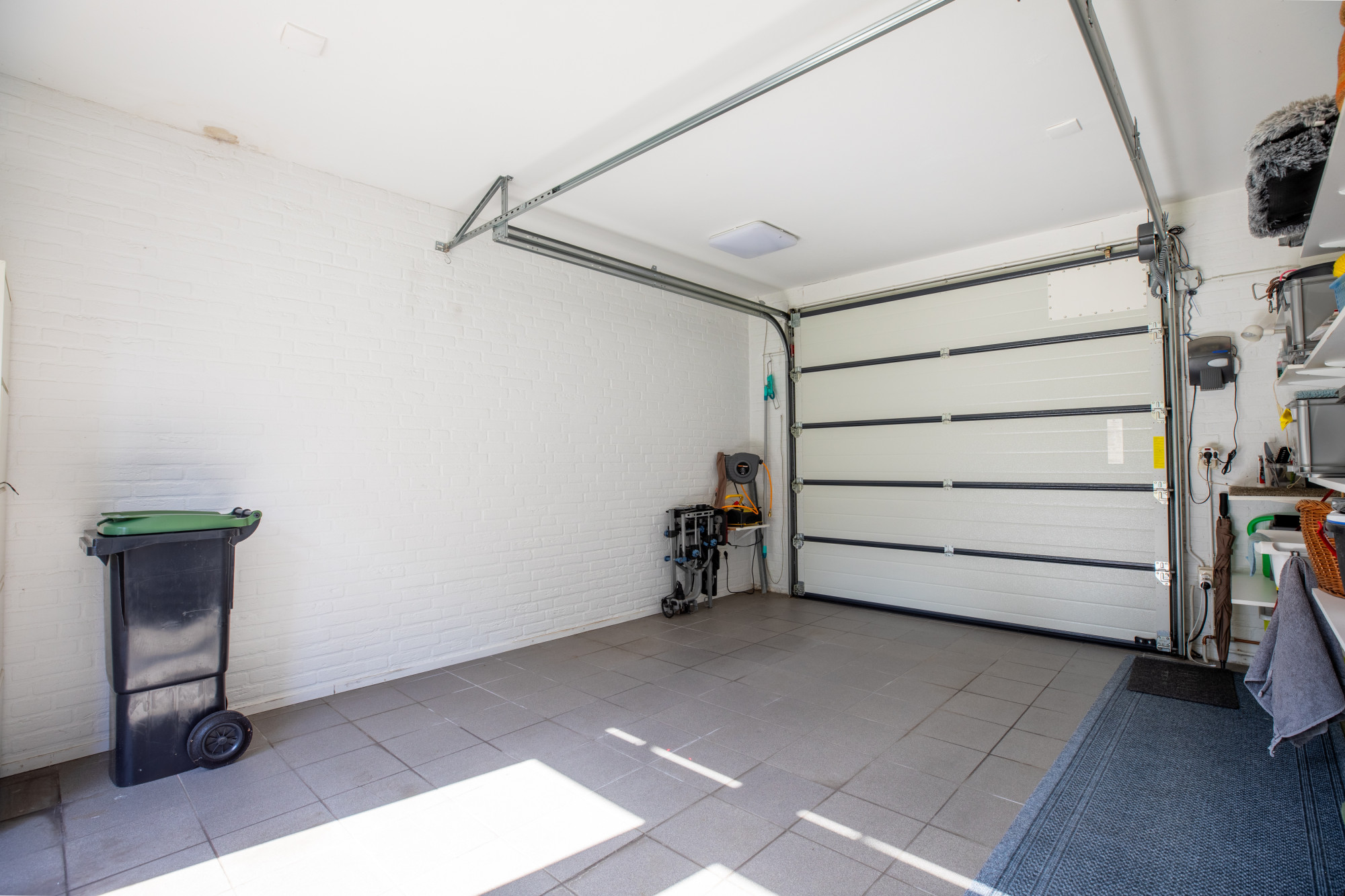 Daarnaast beschikt de woning over twee garages, beide grenzend aan het huis. Eén van de garages heeft een deur direct naar de woning en is uitgerust met een wasbak, wat extra praktisch is voor klus- of hobbygebruik. De tweede garage biedt eveneens voldoende ruimte voor parkeren of opslag.