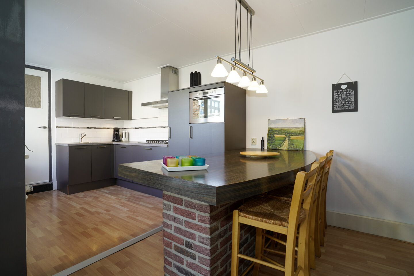 Toiletruimte met zwevend toilet. Sfeervolle woonkamer met erker. De mogelijkheid voor het aansluiten van een (hout) kachel is aanwezig. De woonkamer biedt toegang naar de tuin en is voorzien van een laminaatvloer. Halfopen goed onderhouden keuken in hoekopstelling. Voorzien van diverse apparatuur waaronder een gasfornuis, combi oven, afzuigkap, afwasmachine en koelkast. De keuken en woonkamer bieden samen een oppervlakte van ca. 50m2. Achter de keuken bevindt zich de bijkeuken( 9m2) met wasmachine aansluiting. Toegang naar de achtertuin.