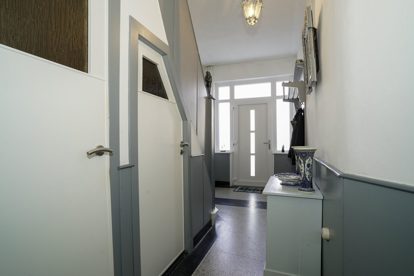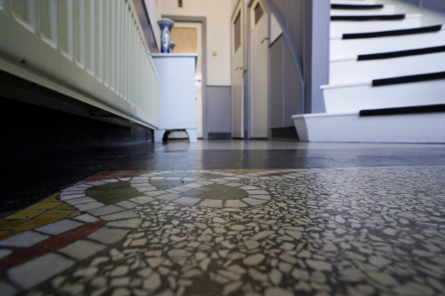 Entree, voorzien van de in goede staat verkerende originele terrazzo vloer .